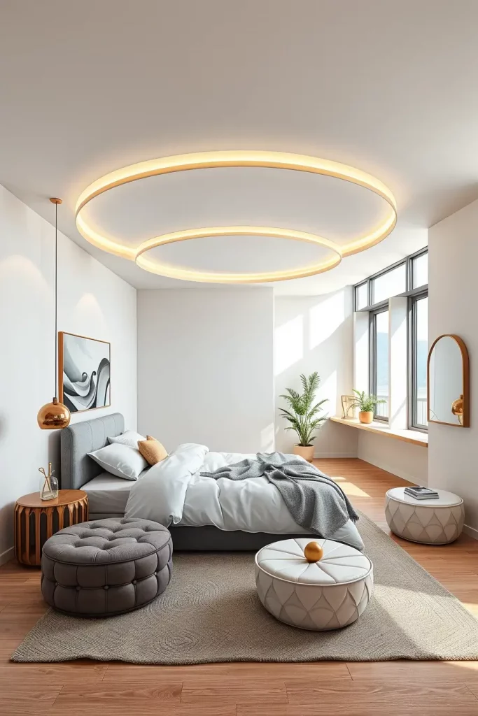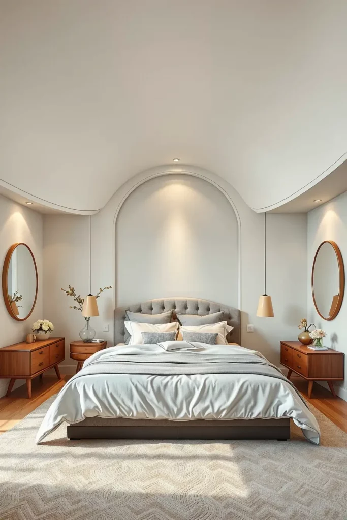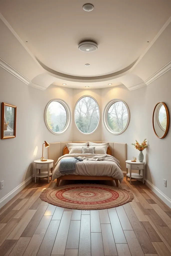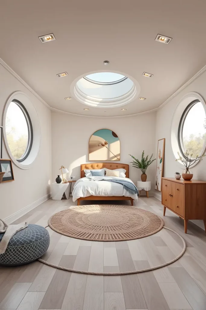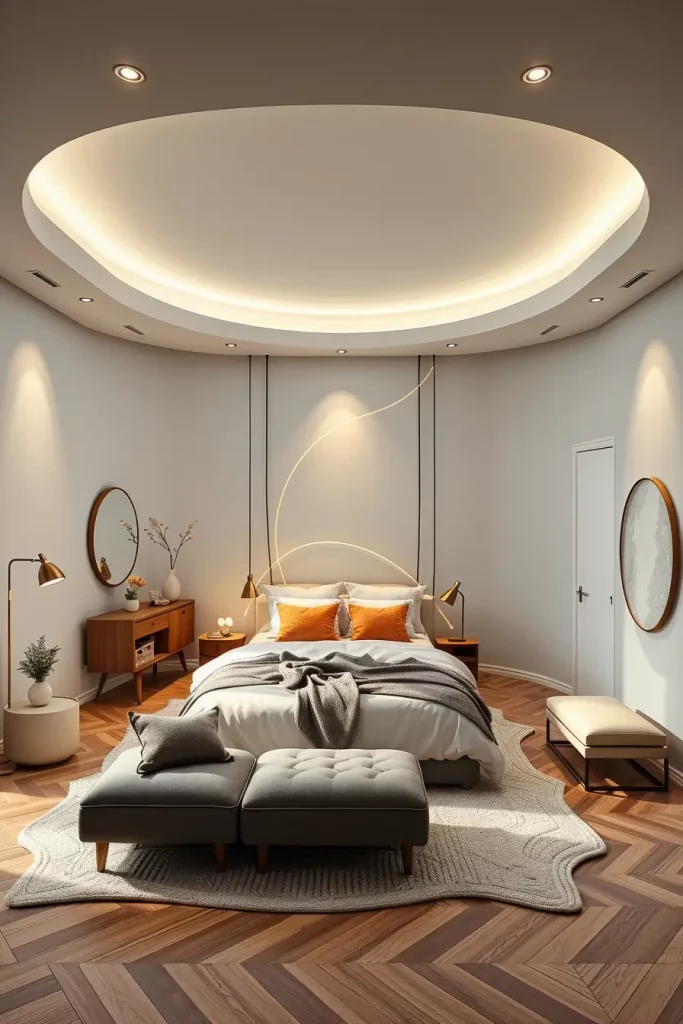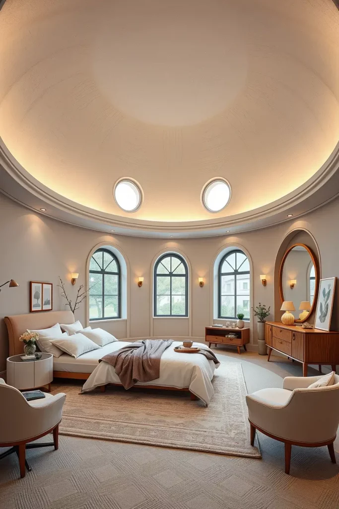 I prefer curved bed frame, circular shaped mirrors and flowing window curtains to fit the curves of the room in such designs. No angular artworks are required- organic sculptures or wall-mounted circular lights will help to finalize the room. Radial lines promote space unity by floor materials like polished concrete or continuous planks of wood. Round ottoman or lounge chair, which is crescent-shaped, offers a place to put down a foot simply without interrupting the rhythm of the room.