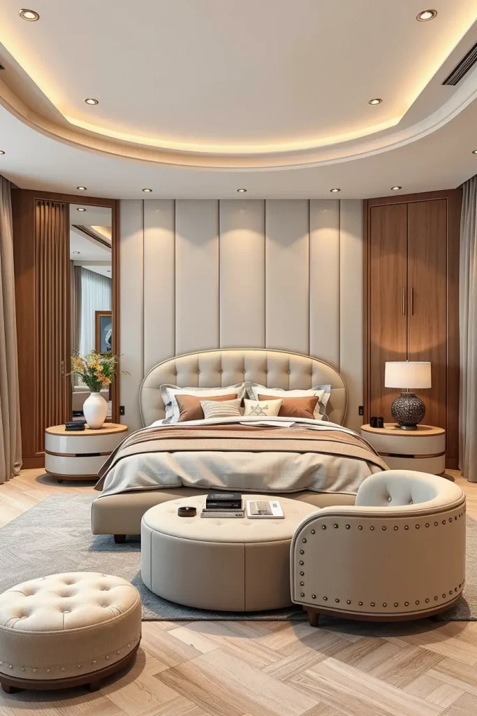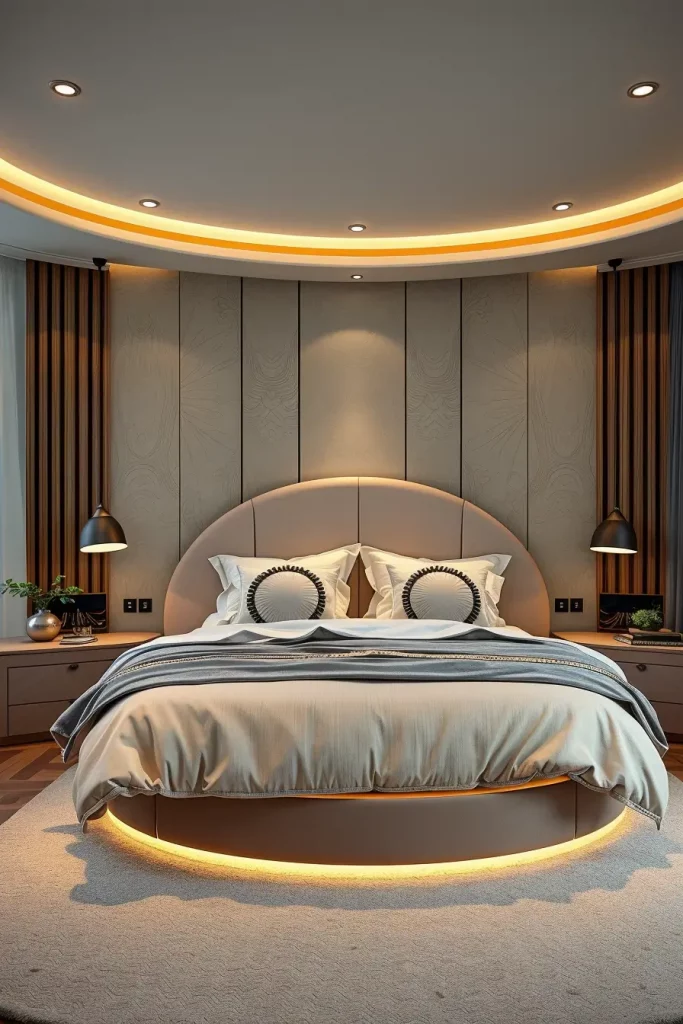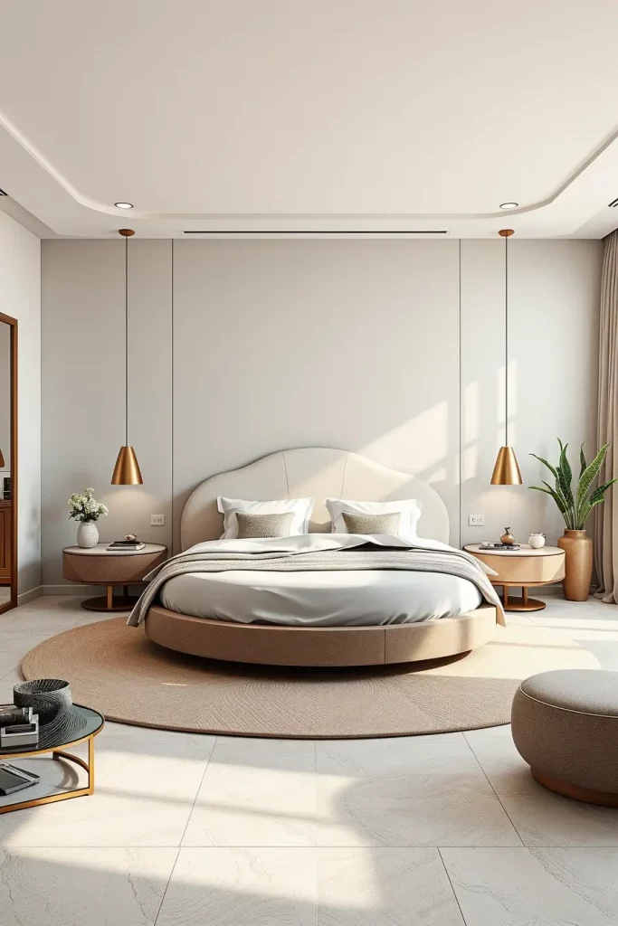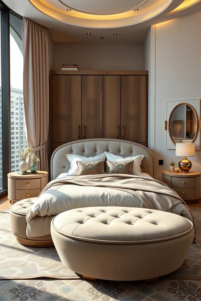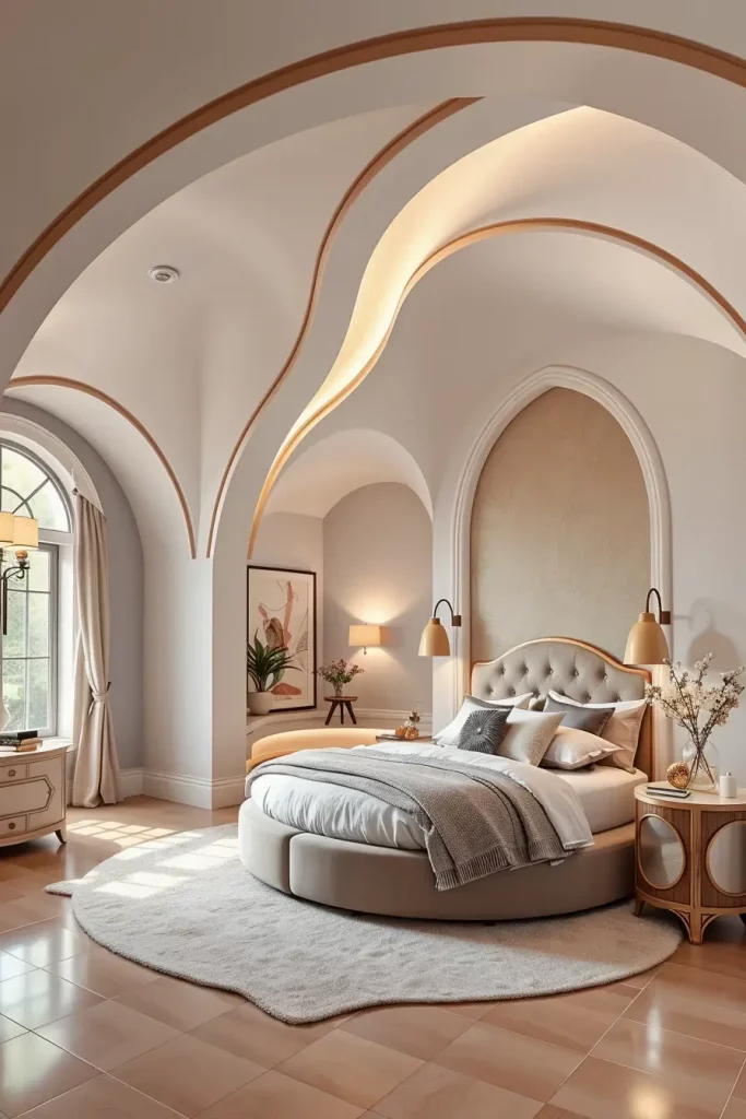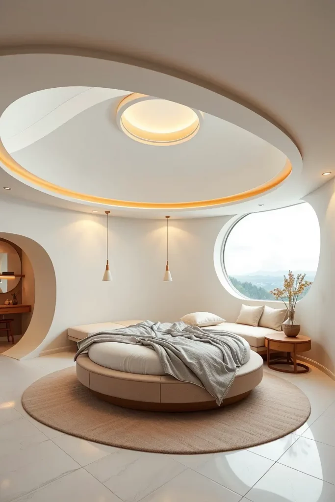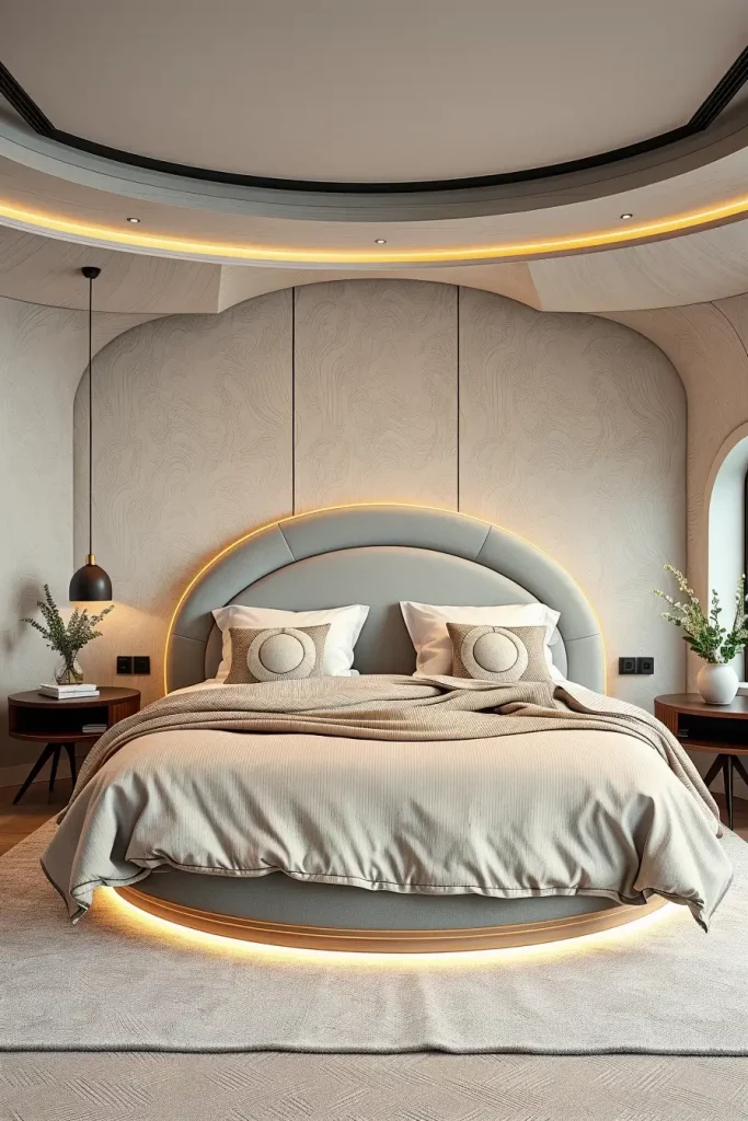 The bedroom that does not use corners needs the bed to be used as an art sculpture that fits well into the dynamics of the room. Because I tend to suggest a circular bed as a centre. It naturally aligns with the room’s curves and serves as both a functional and aesthetic anchor. Circular beds encourage motion and symmetry unlike rectangular old beds that interfere with the beauty of curvy designs. They assist in unifying the space and does away with the stiff energy that corners usually introduce into the sleeping area.