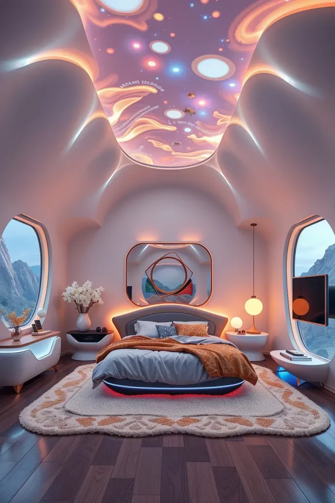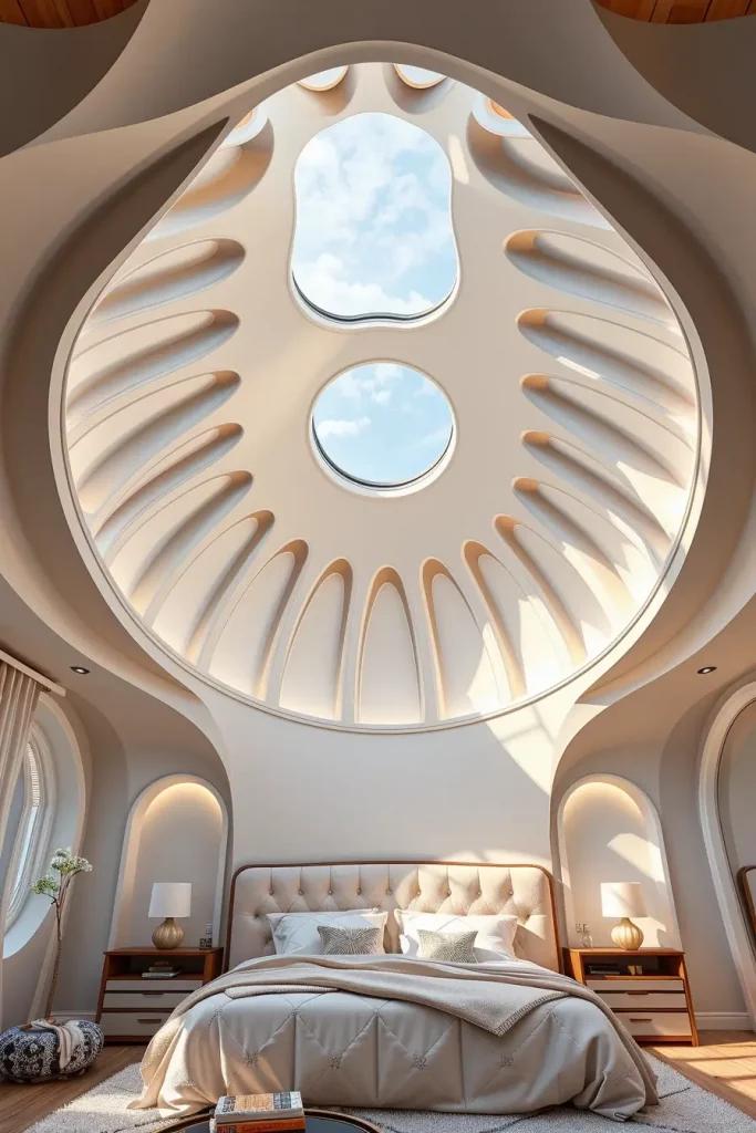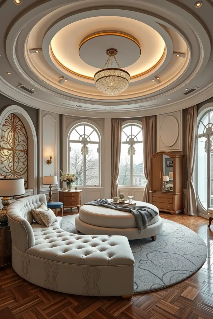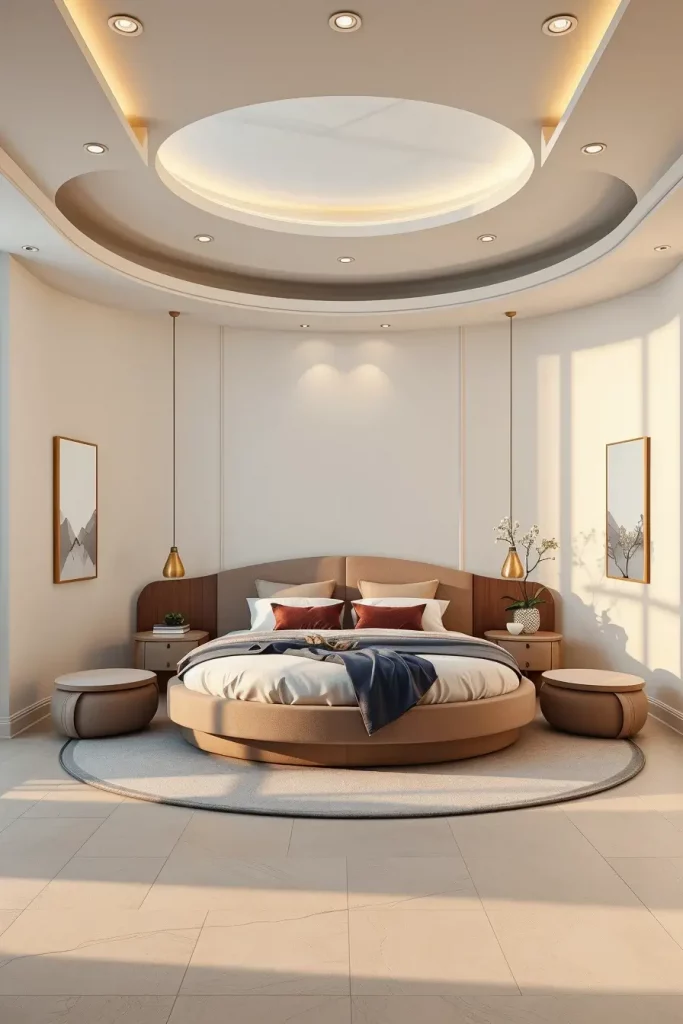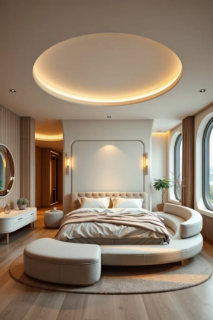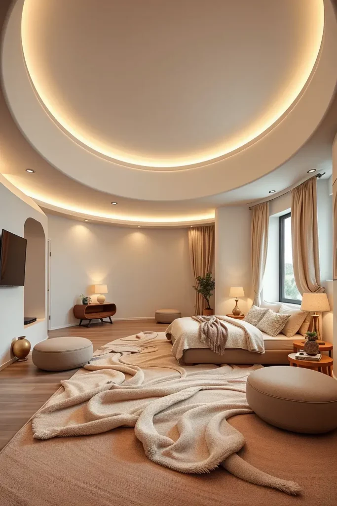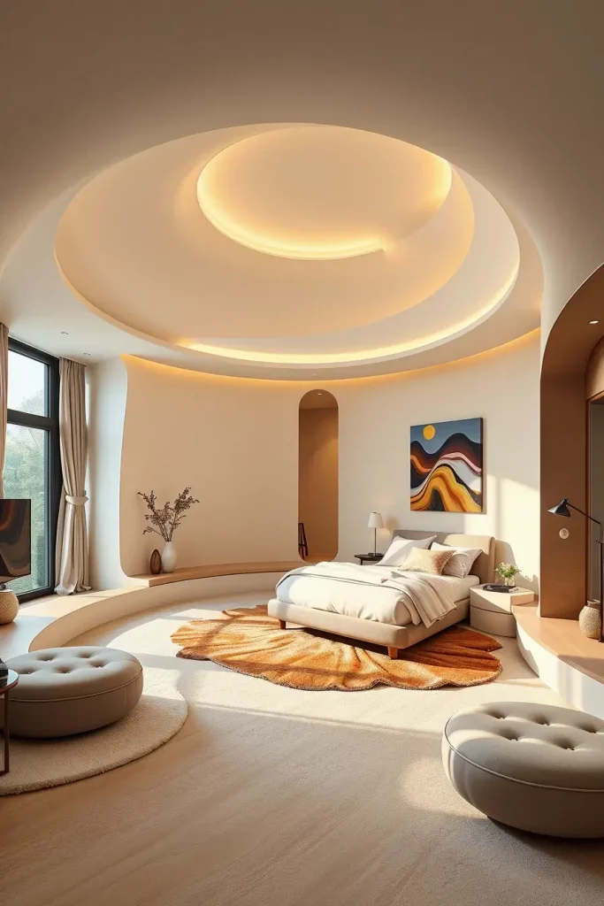 The bedroom that does not use corners needs the bed to be used as an art sculpture that fits well into the dynamics of the room. Because I tend to suggest a circular bed as a centre. It naturally aligns with the room’s curves and serves as both a functional and aesthetic anchor. Circular beds encourage motion and symmetry unlike rectangular old beds that interfere with the beauty of curvy designs. They assist in unifying the space and does away with the stiff energy that corners usually introduce into the sleeping area.