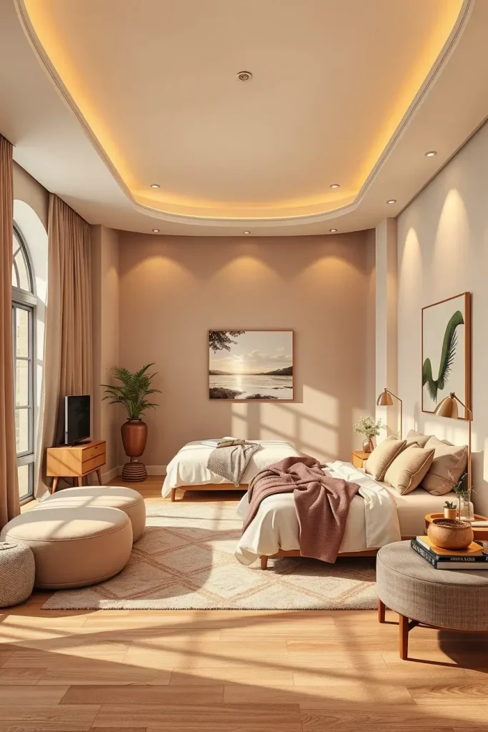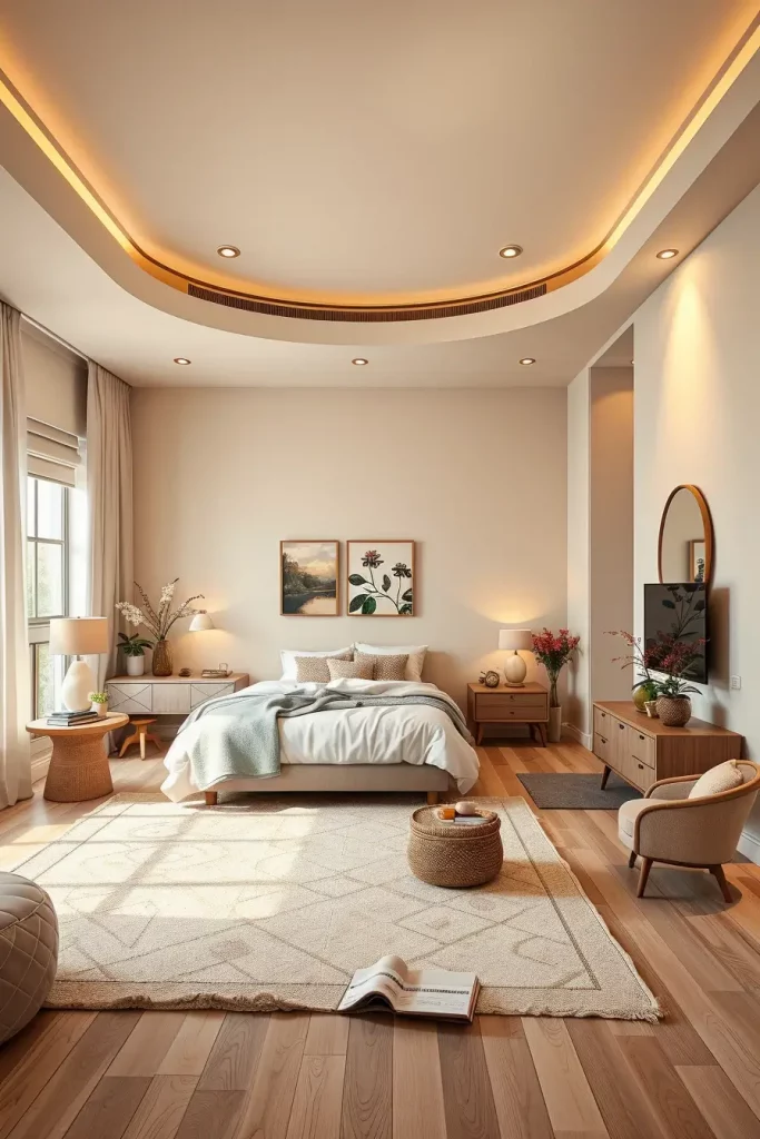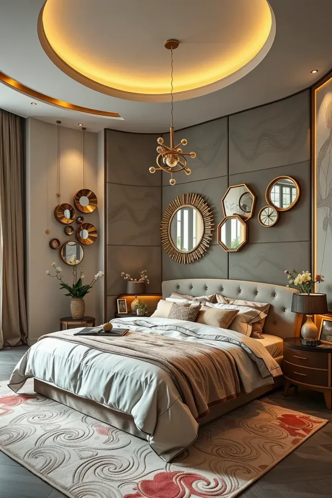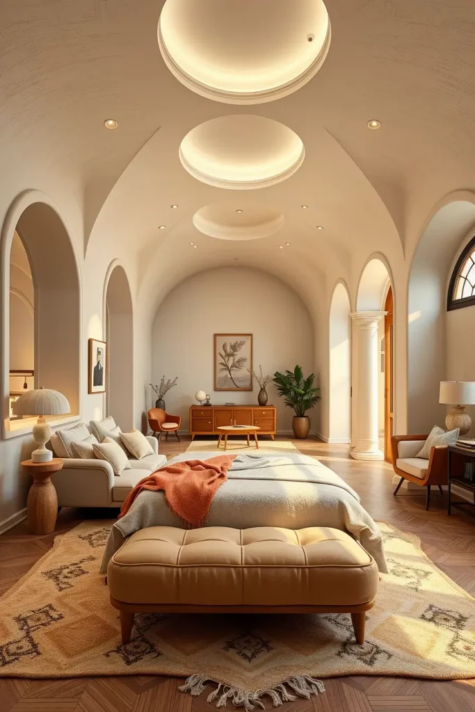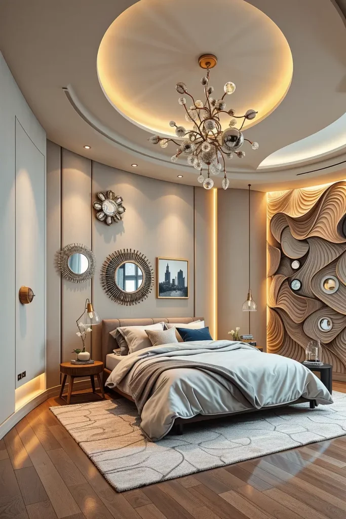 To make it a really mellow layout, I have fun with a curved ceiling path, LED uplight, spinning pendants, and curvy alcoves rather than straight wall comprised of shelves. The style of furniture is more on the side of circular bed designs, oval mirrors as well as the curved settee. Wall-integrated organic patterns or textured panels can keep the wall labelling smooth as opposed to framed art.