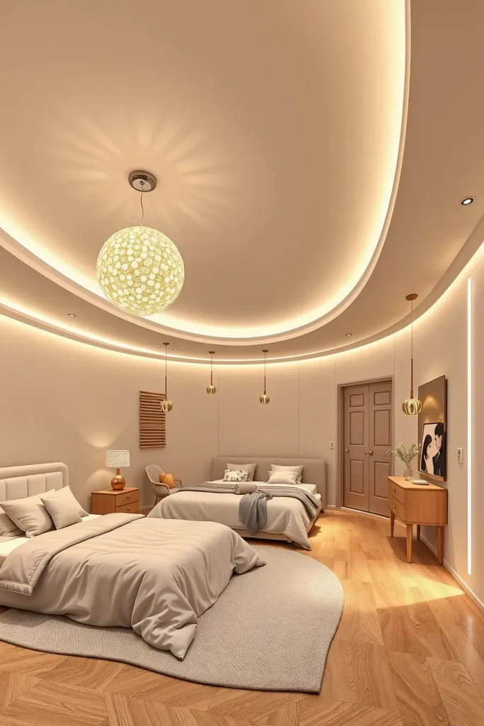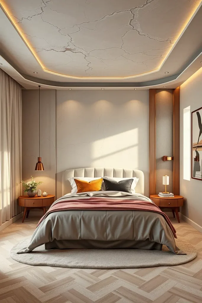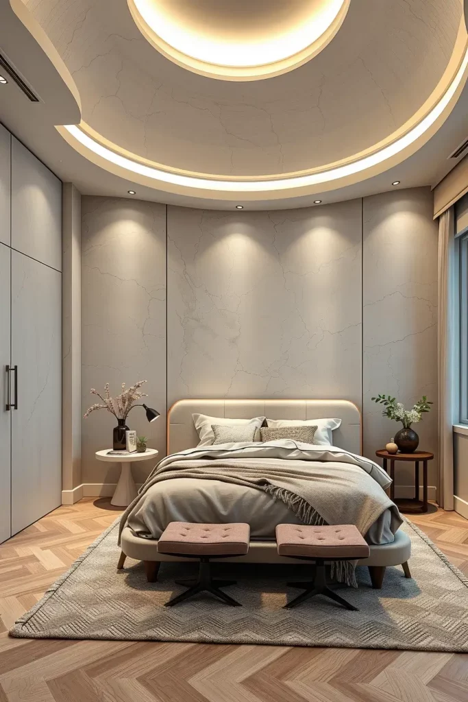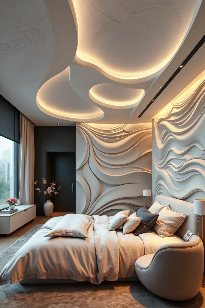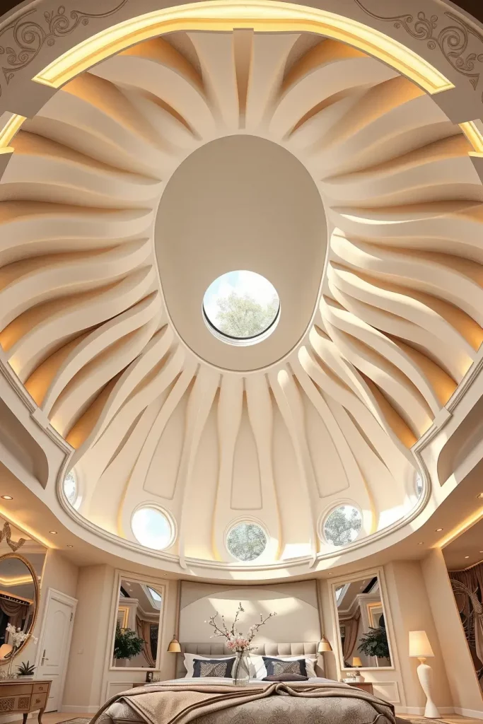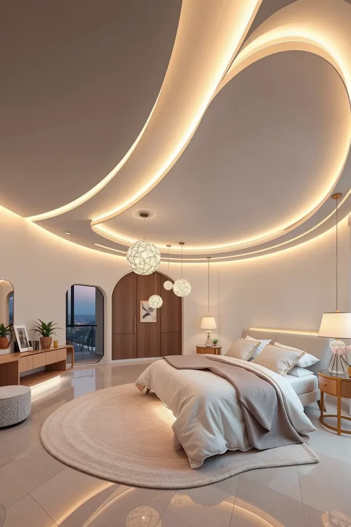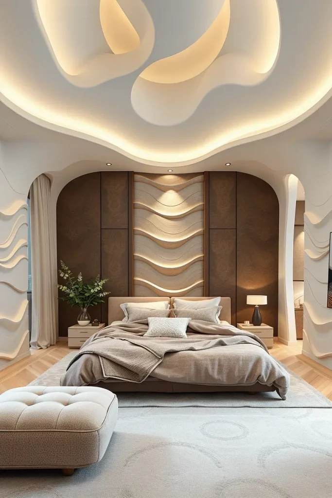 Ceiling is the least used design of any surface-at least in a corner free bedroom. I regard it as a canvas that is supposed to reflect the language of the architectural language in the room. Dome ceilings, curved or sine wave-like gypsum creations are perfect options in terms of adding depth and drama. They enhance the effect of height and the lack of linearity.