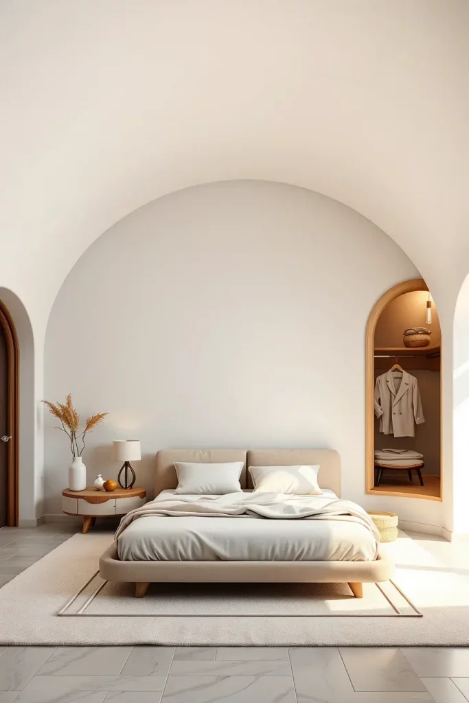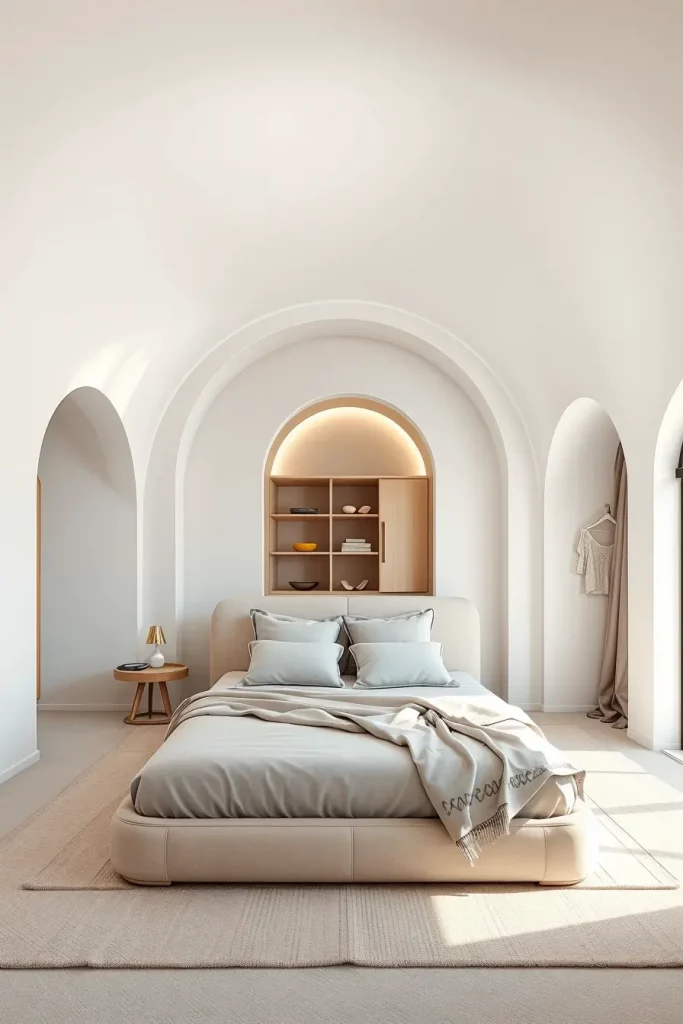 Simple-looking yet good-quality furniture is what I typically tend towards in that kind of a room: made in a low-profile platform a bed with a rounded upholstered frame, a single, cylindrical nightstand, and an arched in-built closet. The walls can bend softly towards the ceiling forming a cocoon like effect. Pale shades such as light beige color or light gray touch contribute to the minimalistic ambiance, whereas direct lighting placed in coves focus on the curved surface.