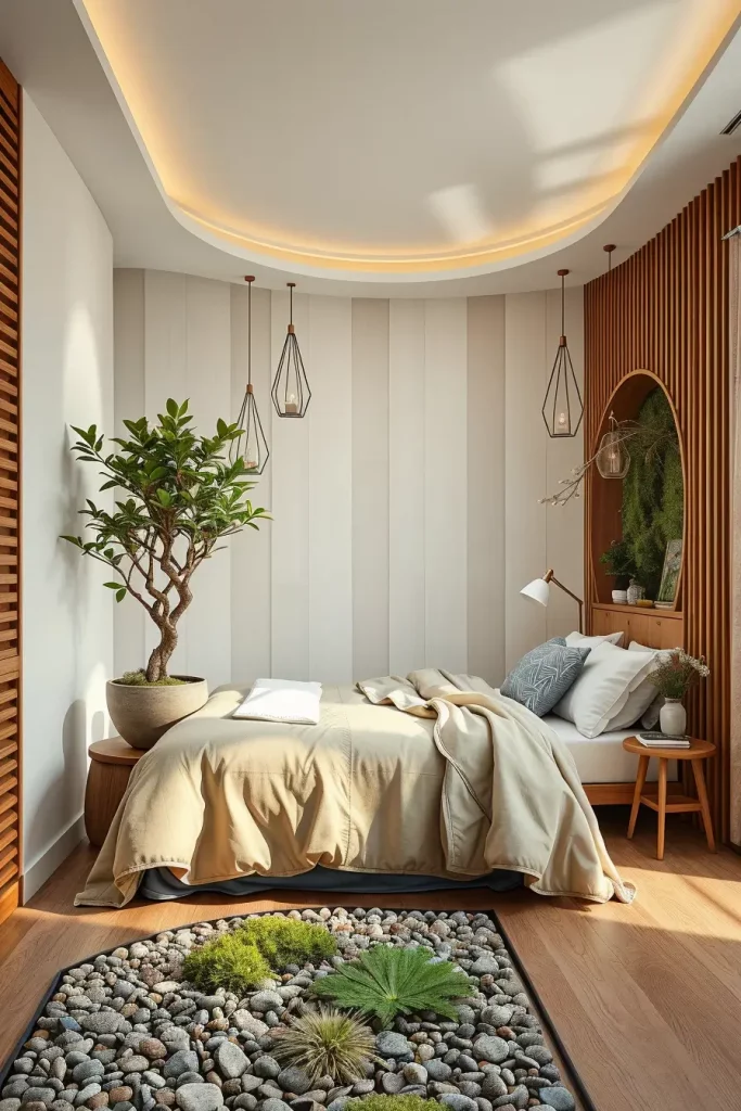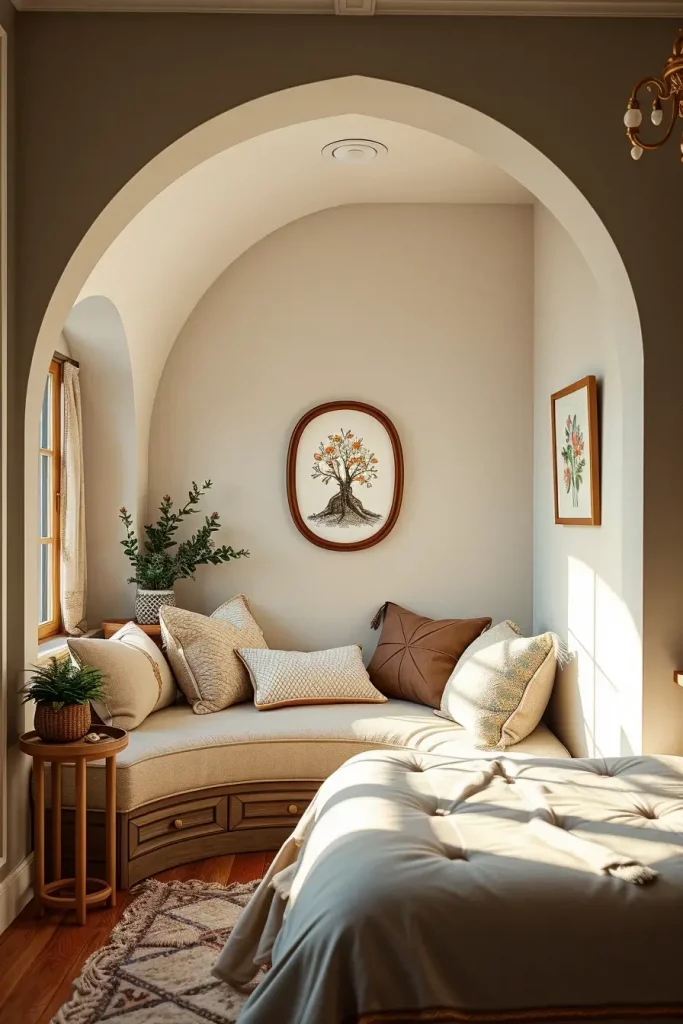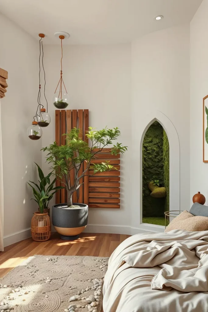 I combine planters into rounded tops, pebble-like floor finishes in alcoves and wood slatted walls with draping vertical patterns. Indigenous trees that consist in circular planting beds or hanging terrariums on arching nooks are beautiful. Such materials as rattan, clay, or even raw cotton provide a feeling of warmth, which fits well with the form of the room.
