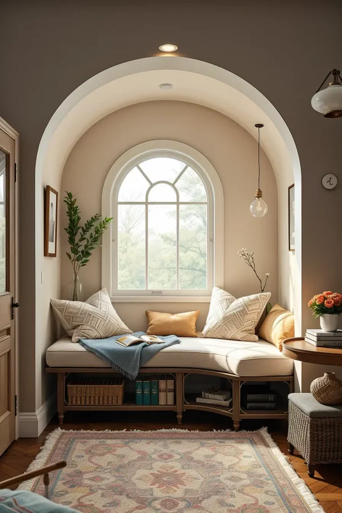 To make such, I tend to carve out alcoves in the curved building. A round backed reading bench ensconced into a concave wall, or a gently arched alcove with pillows and woven throws makes an ideal place to relax. The role of lighting is vital, the curves should be reflected on by sconces or recessed lights.