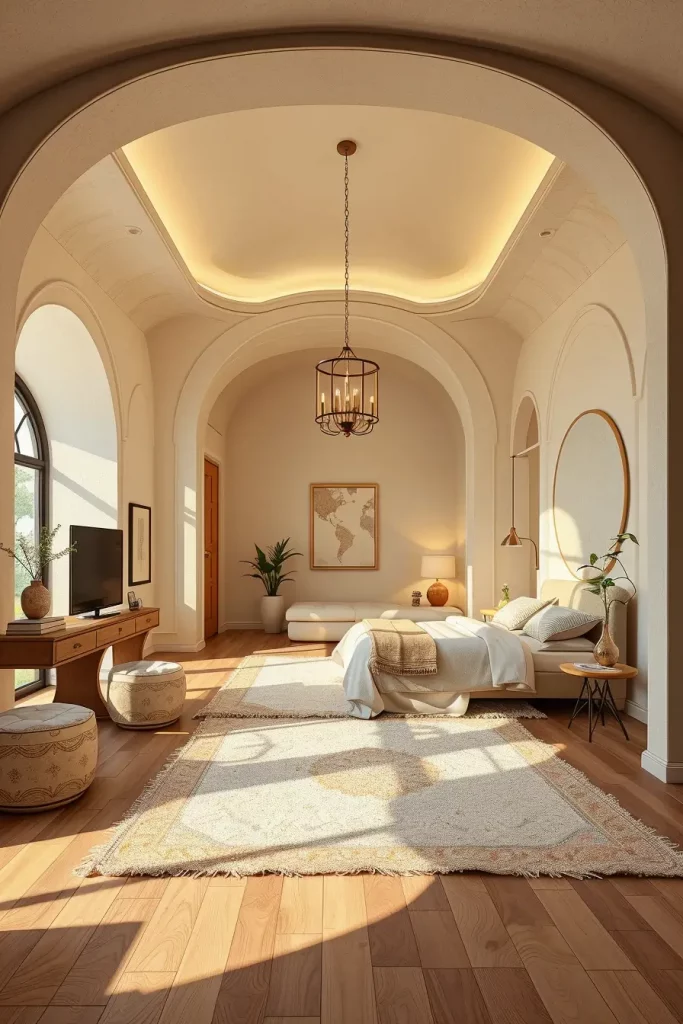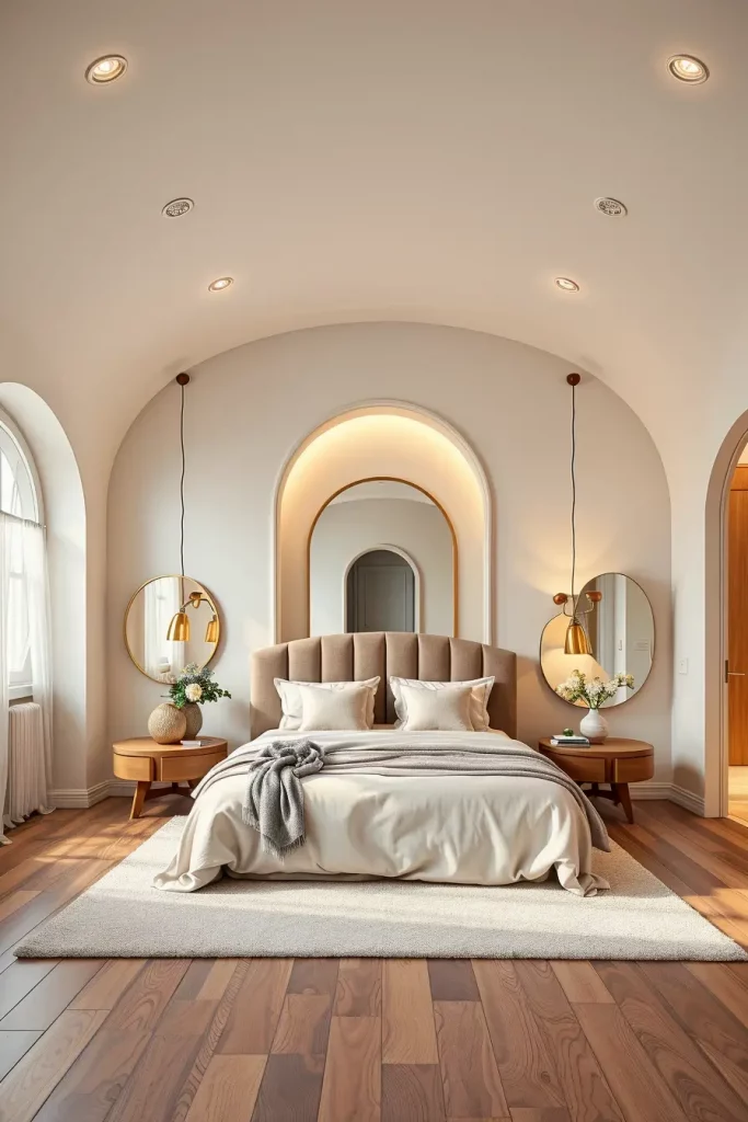 Curves and arches give a graceful way to shift sections in a cornerless bedroom. They are usually hung to isolate the dressing sections, provide some intimate reading corners, or delineate the bedroom space. The features provide both architectural rhythm and the impression of a room, which is an uninterrupted experience more than a series of boxes.