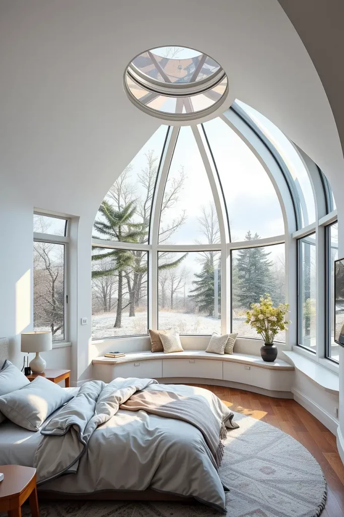 Here circular or elliptical windows are the best, or long bands of glass horizontal, following the line of the wall. I normally employ curved frames and in-built seating underneath the frames. Skylights, especially dome skylights or quarter-oval skylights make a beautiful work as well. A softer transition between wall and glass is very important and the often rounded trim or seamless glass paneling are often used.