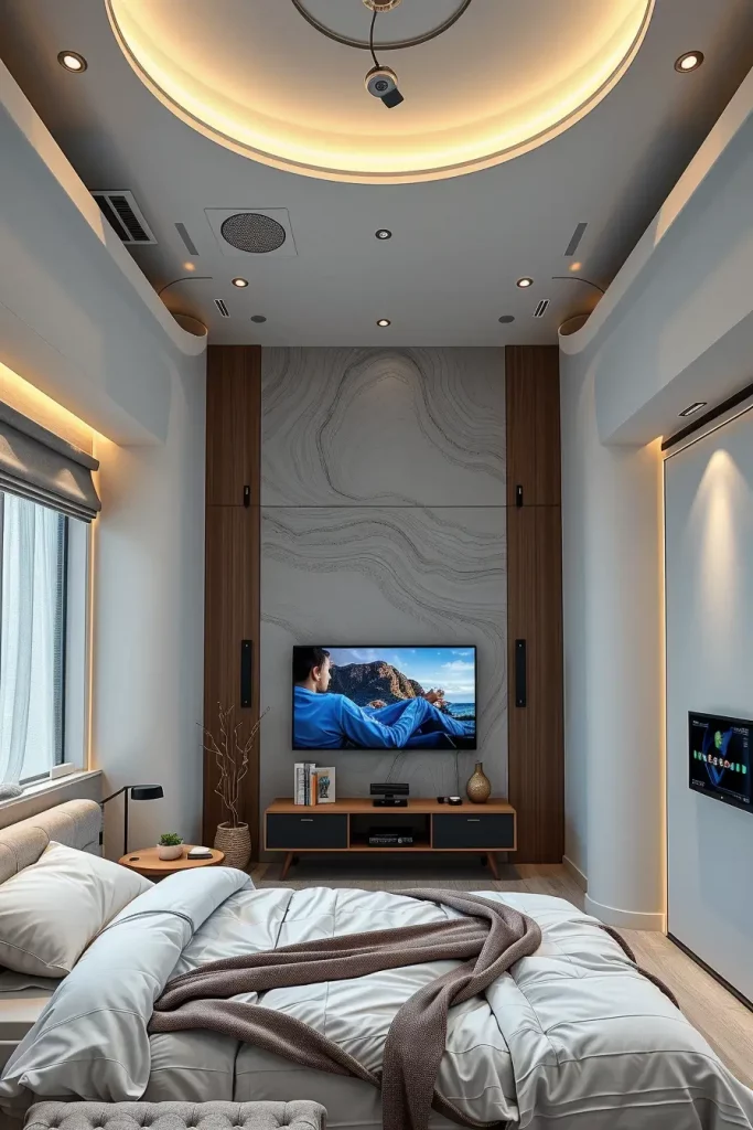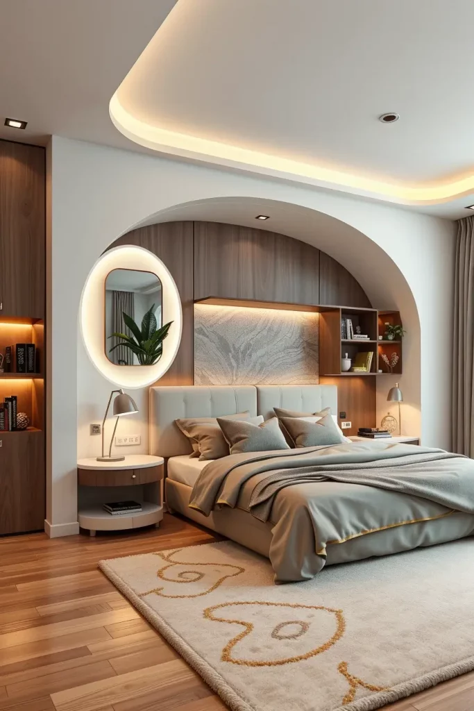 Smart technology has to be provided in bedrooms as an essential in modern bedrooms, and to do this without a cornerless design is an additional consideration. I also prepare in advance such that screens, speakers, or smart controls will not interfere with the softness of the visuals. This is to integrate all these in the curves them being flush or concealed.