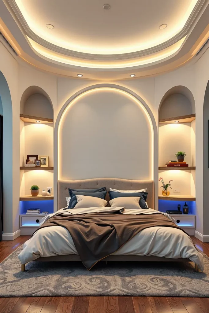 My plan-to-falls consist of curved built-in nightstands which blend into the bed structure, LED lights which run along the curve of the wall and built-in speakers, planted in the arch of the ceiling. Having these shapes made of plaster or wood veneer makes them consistent and classy.