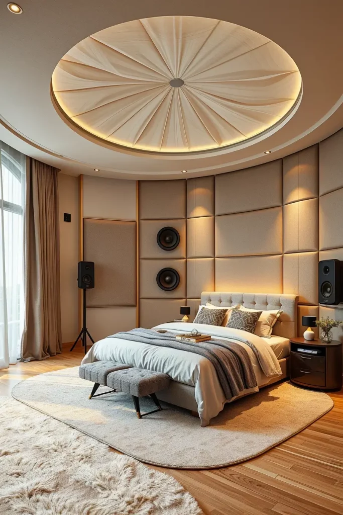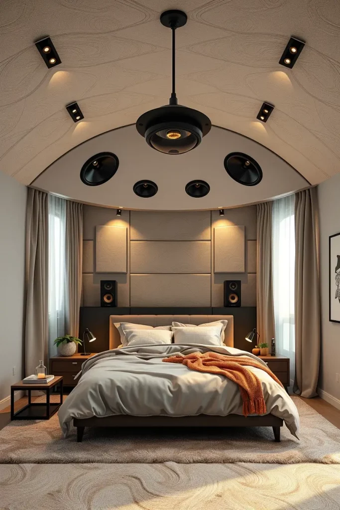 I usually apply fabric-covered curved wall-panels or the dome-type of ceilings to make a cocoon-like acoustical environment. Ambient noise is neutralized by things such as carpeted floors, soft drapes on curved tracks and padded headboards. Wall speakers can be positioned equally spaced on the arc of the wall to achieve high-quality sound without a disturbance.