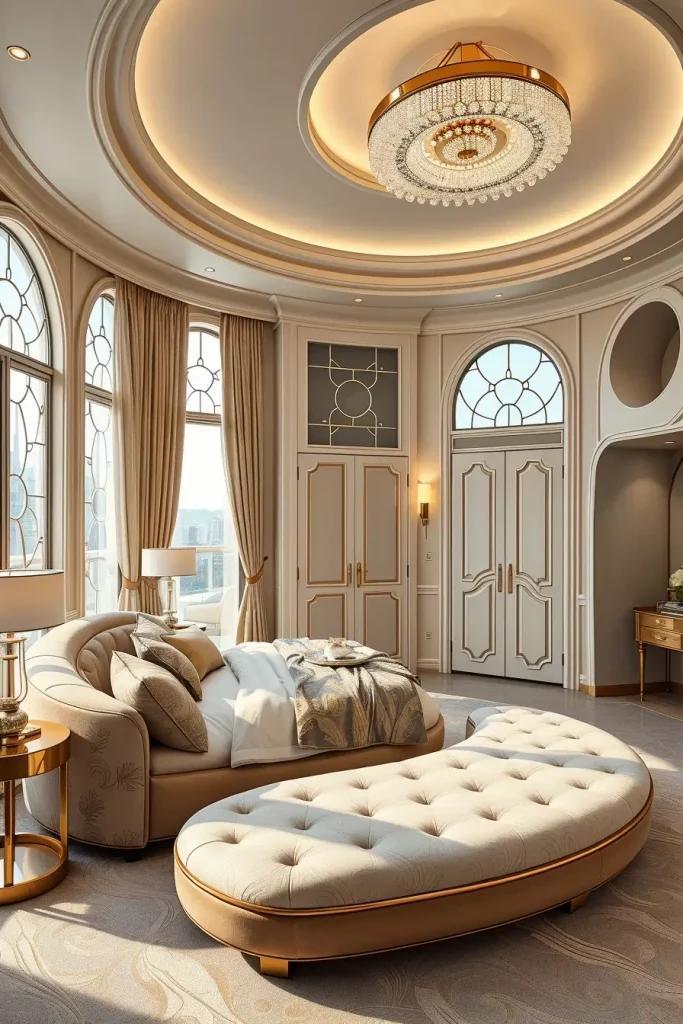 Some of the important aspects I incorporate in this design are round beds upholstered, twisted chaise lounges, and wardrobes built in an arc shape. Cushioned carpets are shaped in a round manner and the light items, be it chandeliers or caved lights, resemble the curved architecture. The niches of walls are not squared but arch-like and the windows are oval or dome-shaped with draped folds of layers and with a ripple effect. All the products are selected by hand in order to resonate with the ethos of the bedroom without corners.