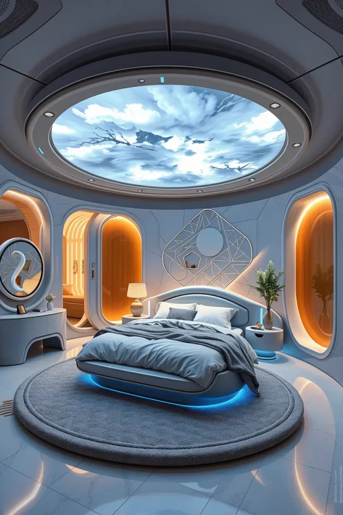 One feature I’d like to explore further in upcoming projects is ceiling-integrated digital projection—immersive skylights or ambient environments that adapt to your mood or the time of day. It would be an aesthetically fitting match to the seamless and streaming design of these bedrooms without corners.