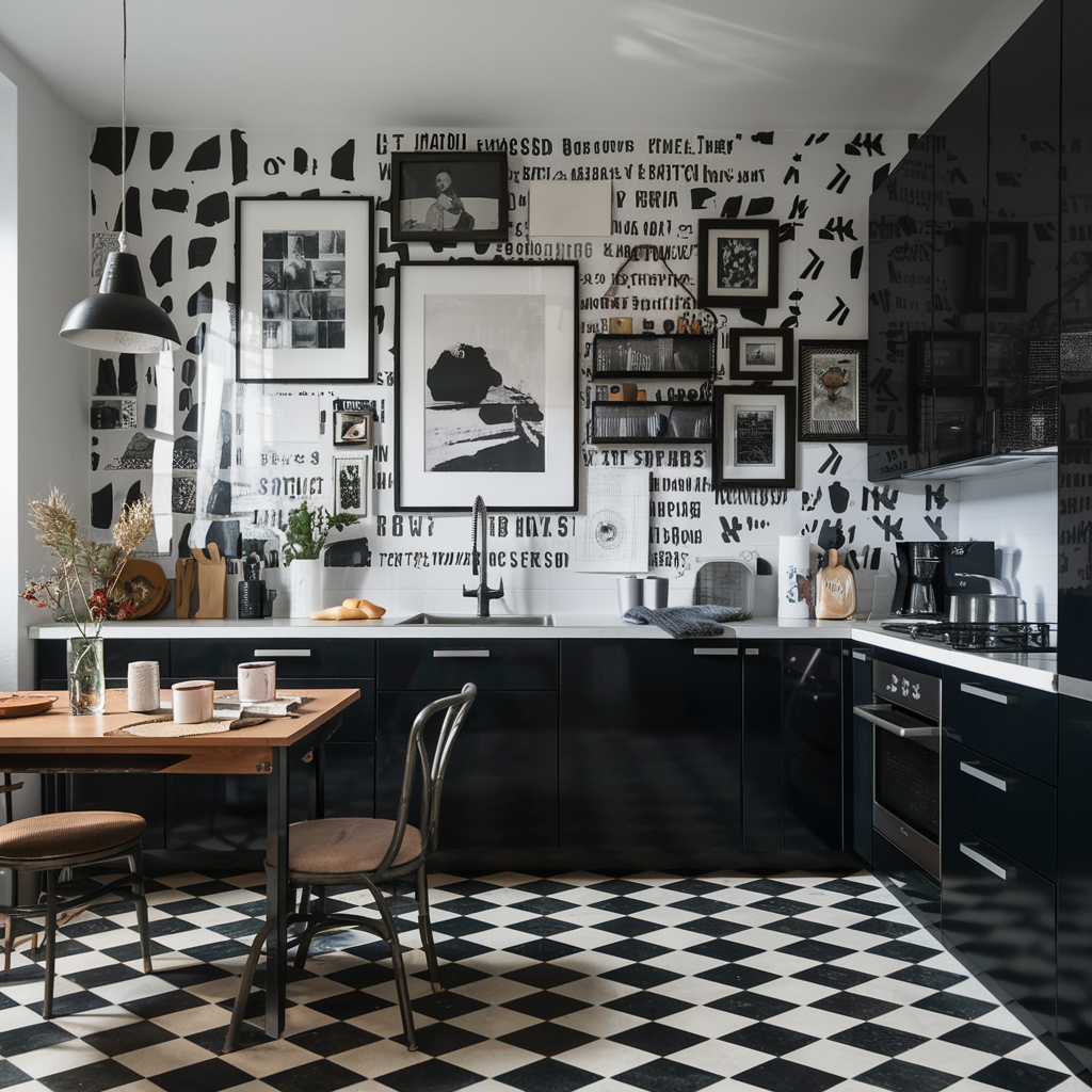 Decorating a black and white kitchen with artworks can be another way to add personality and style to it. Monochrome prints, photographs, and abstract art are capable of centering and making the rest of the design more captivating. Black frames surrounded with white walls or white frames lined with black walls can be a stunning contrast. The main thing that should be remembered while choosing artworks is to go for the ones that correlate with the kitchen decor and do not overload space.