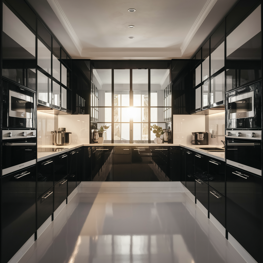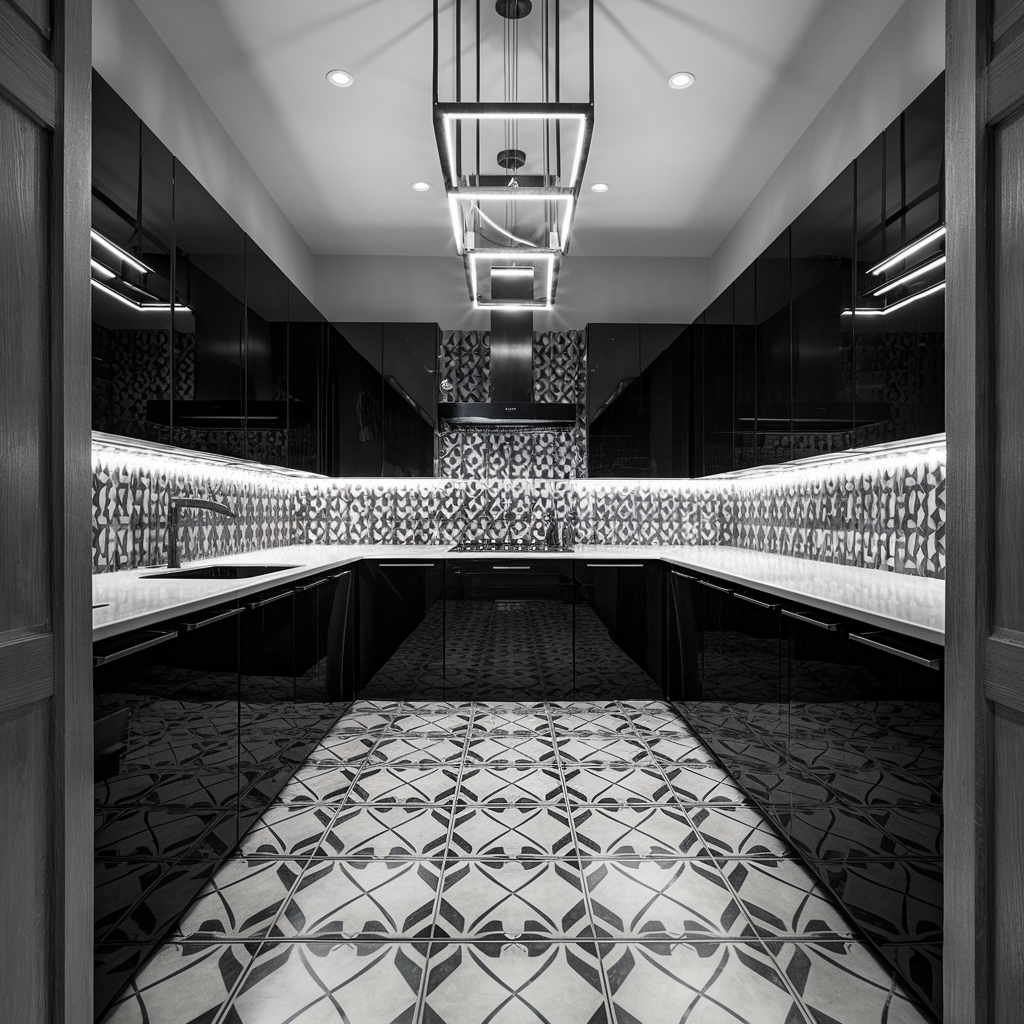 Clear-defined lines and perfect arrangement of materials are indeed must-haves if one is to produce a modern, clean and shiny look in a black and white kitchen. The designer has chosen a minimalist approach in cabinet doors, handles, and monolithic plane clashes of the surface. Black and white are used to minimal effect, bringing out a spatial and uncluttered look. The filters like line lightings and geometric devices authentically convey the concept of clear lines.
