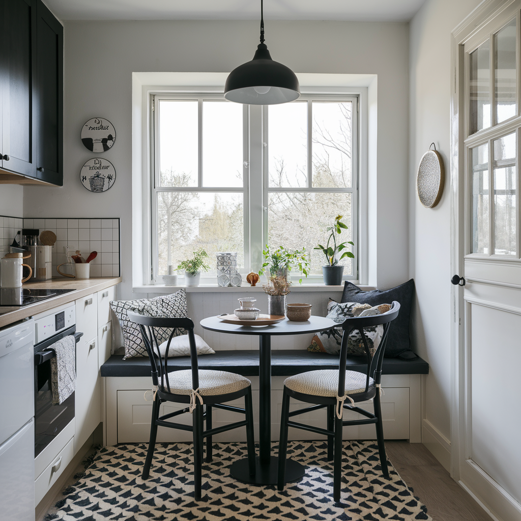 Constructing a small breakfast nook within a black and white kitchen gives the room a calm and casual dinner space. A small table and chairs in black and white, with cushioned seats, would be a warm place to sit. Black and white tableware, a small rug, and a small pendant lamp are also included in the visual enhancements of the nook. This space serves as a perfect place to catch up for breakfast or take a quick meal.