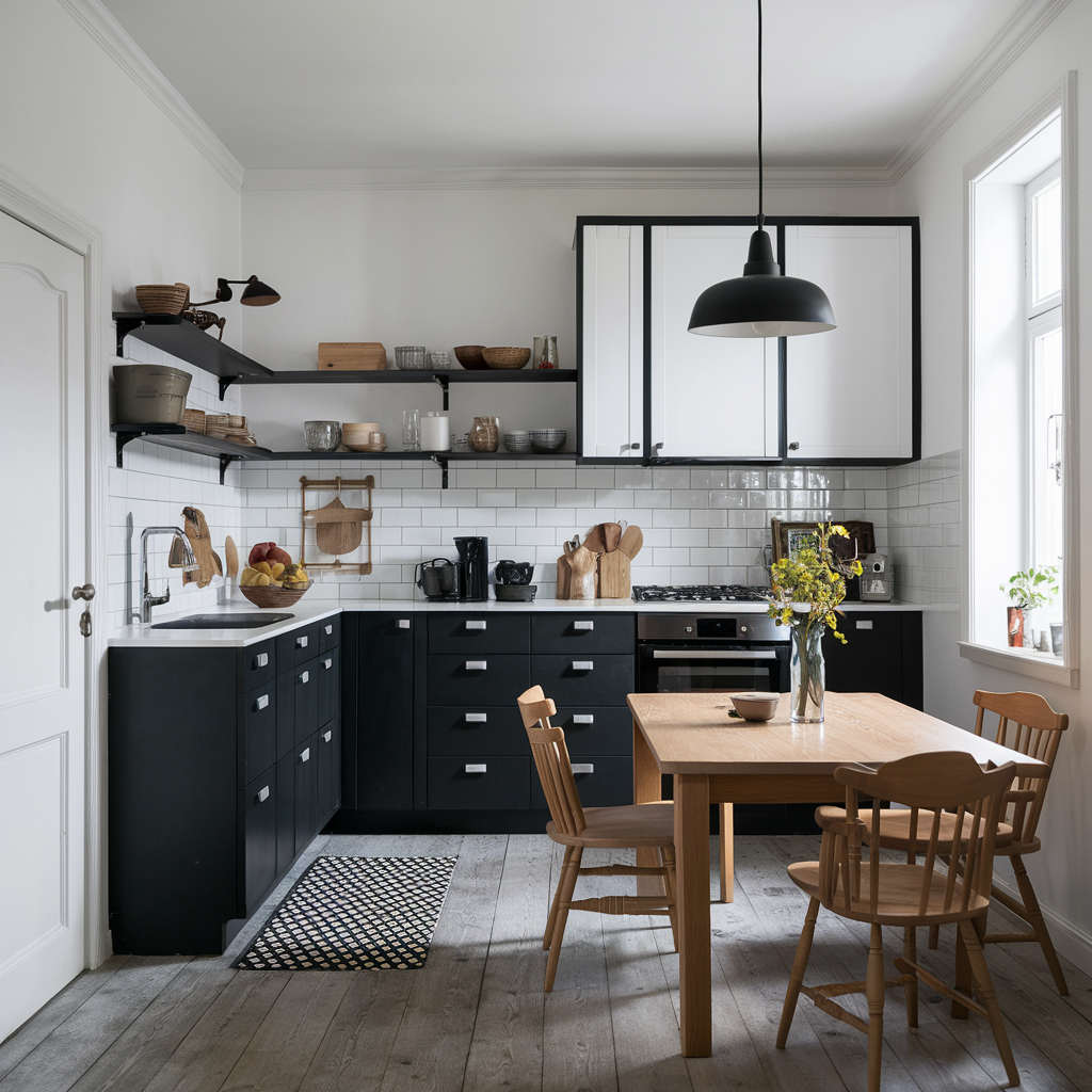 Scandinavian design stands for simplicity and efficiency which is exactly why it is the best black and white kitchen style. The approach is a combination of dark and light colors: the details of the room are white, while the kitchen set is colored black and white. One of the natural wooden components like a wooden dining table and open shelving is a practical solution to bring the warm and the contrast within the monochromatic palette. Straight – clean lines and smooth design elements make a warm yet modern environment.