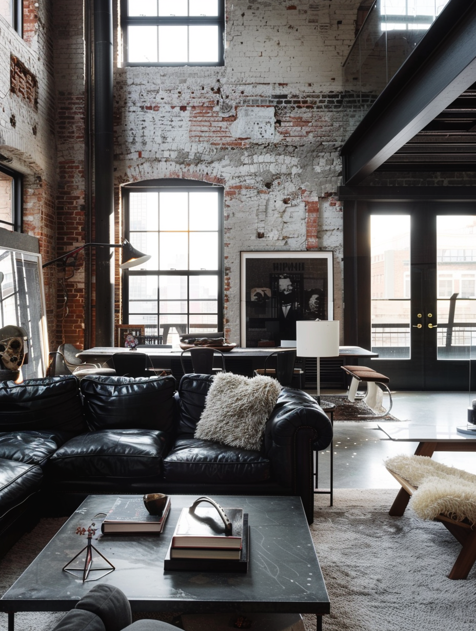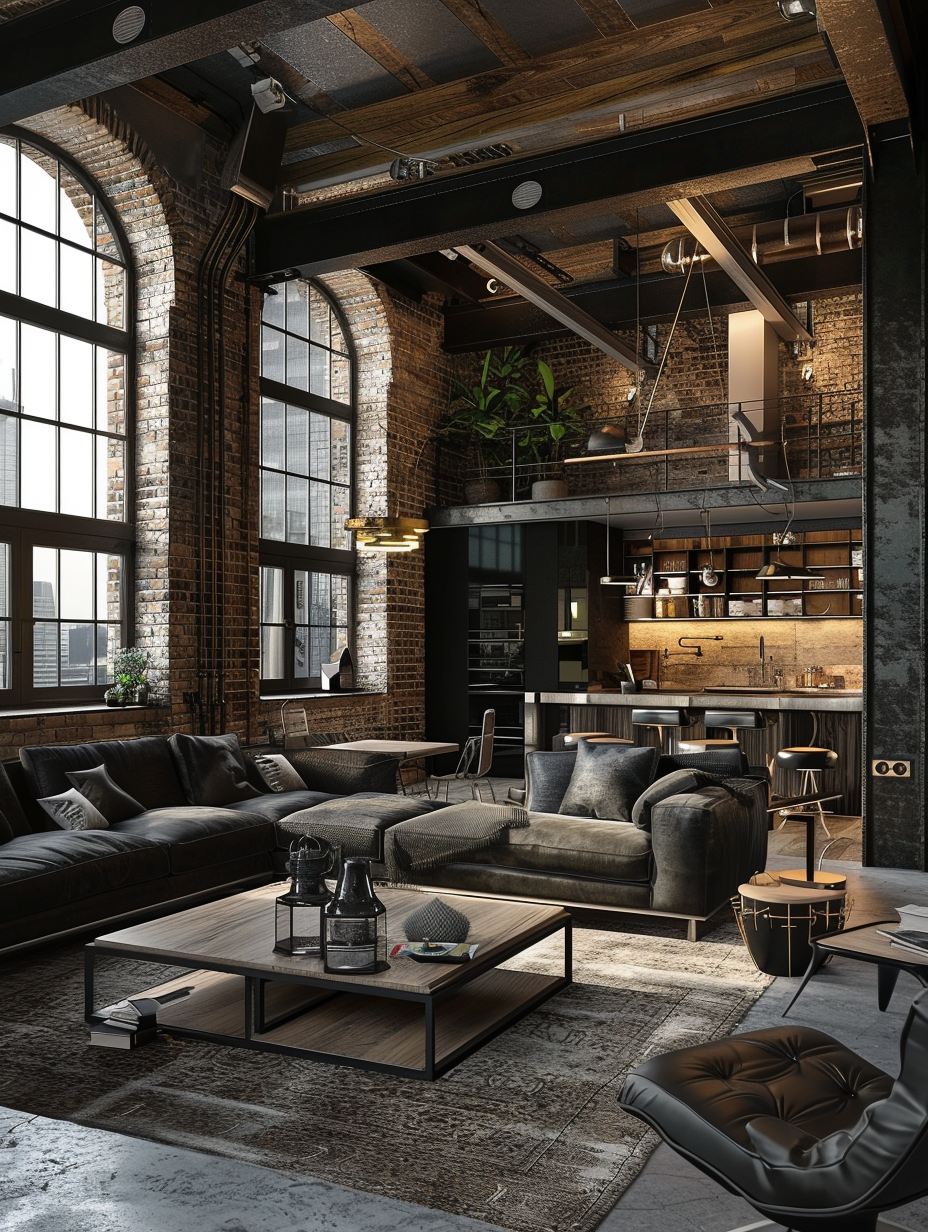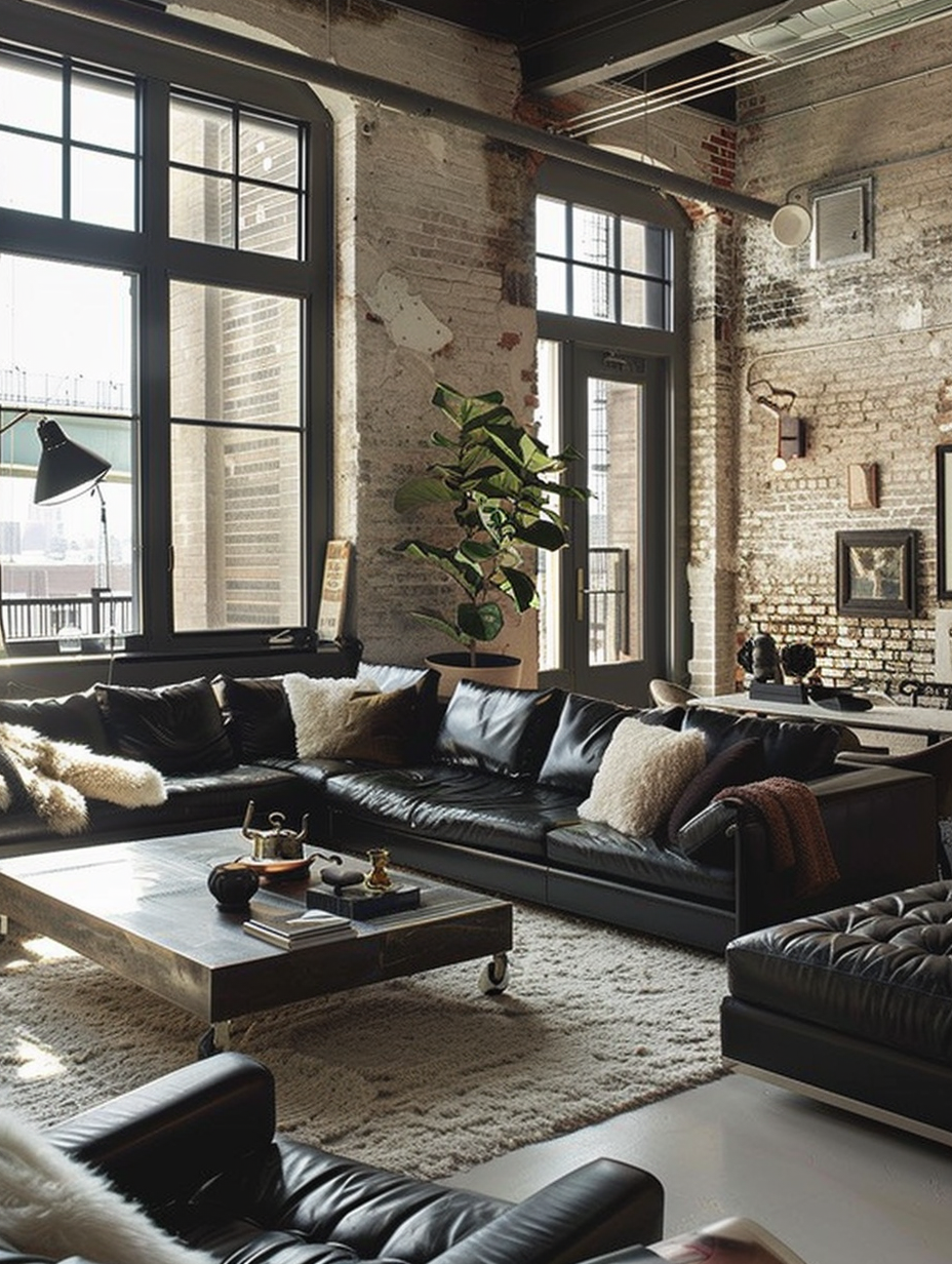 Urban loft living spaces in black showcases industrial elements and creating a chic and modern look. To go with the exposed bricks and the concrete floors use black leather sofas and metal coffee tables. Integrate ample light into large windows causing minimal obstructions as a medium to benefit from the natural light in the room. Add neutral and beige pieces to decrease the starkness but make it livable and elegant at the same time.