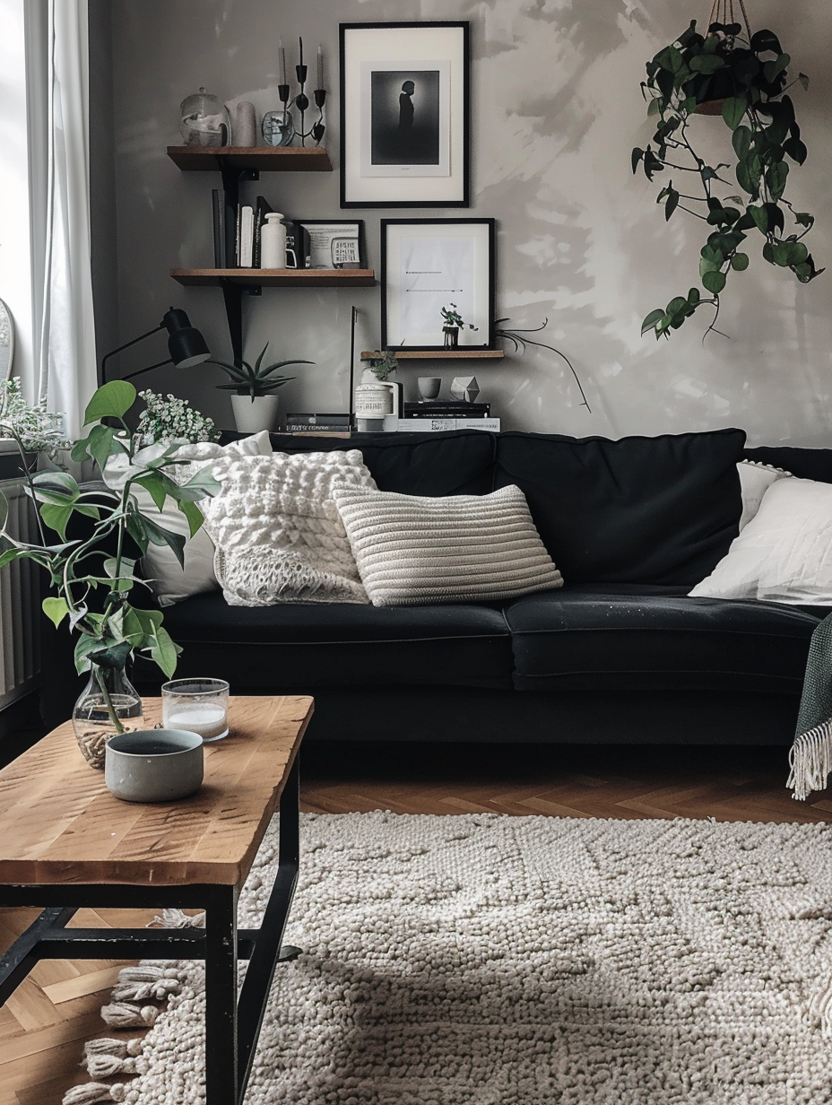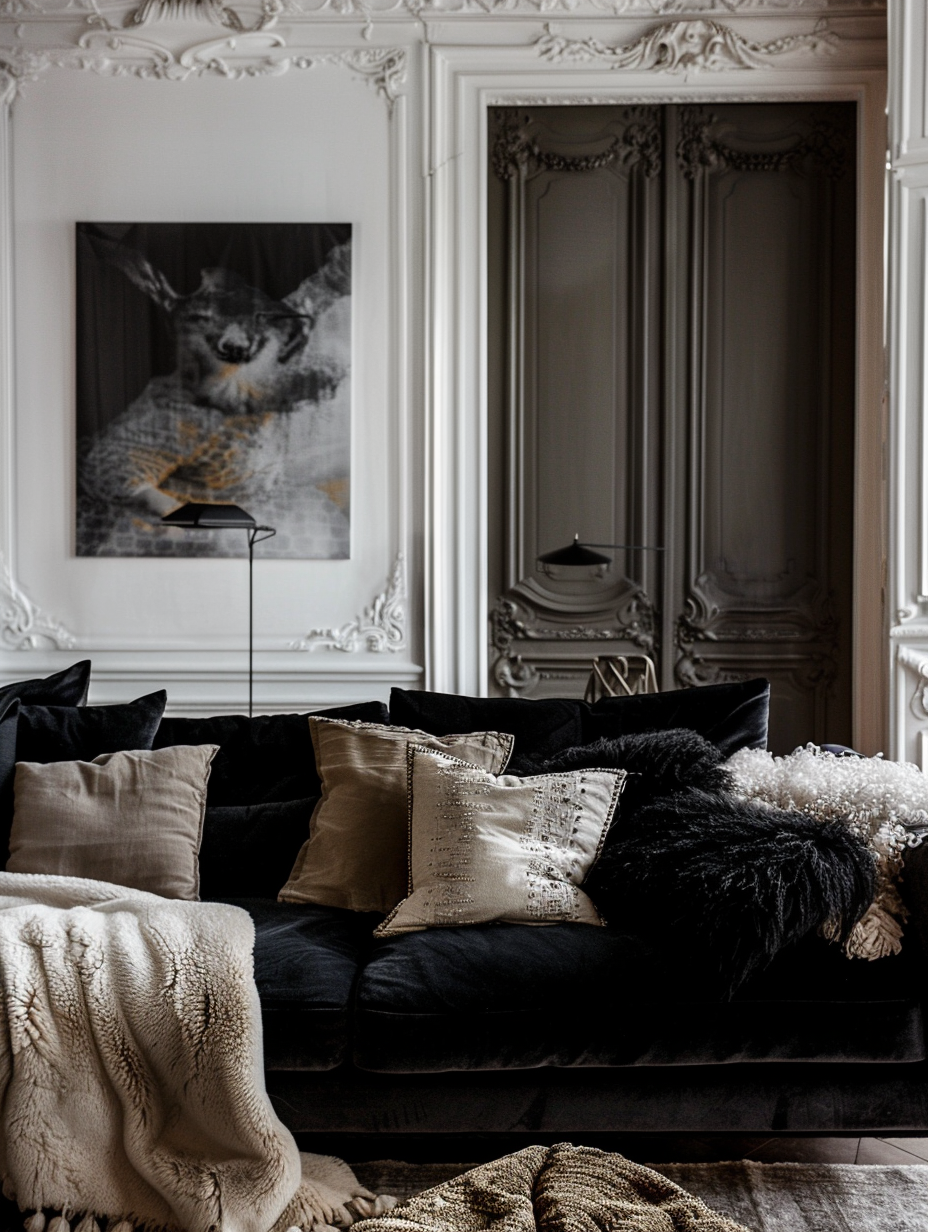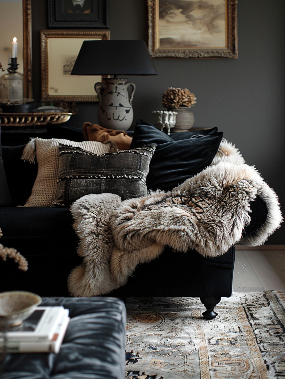 Black Living Room with Plush Textiles