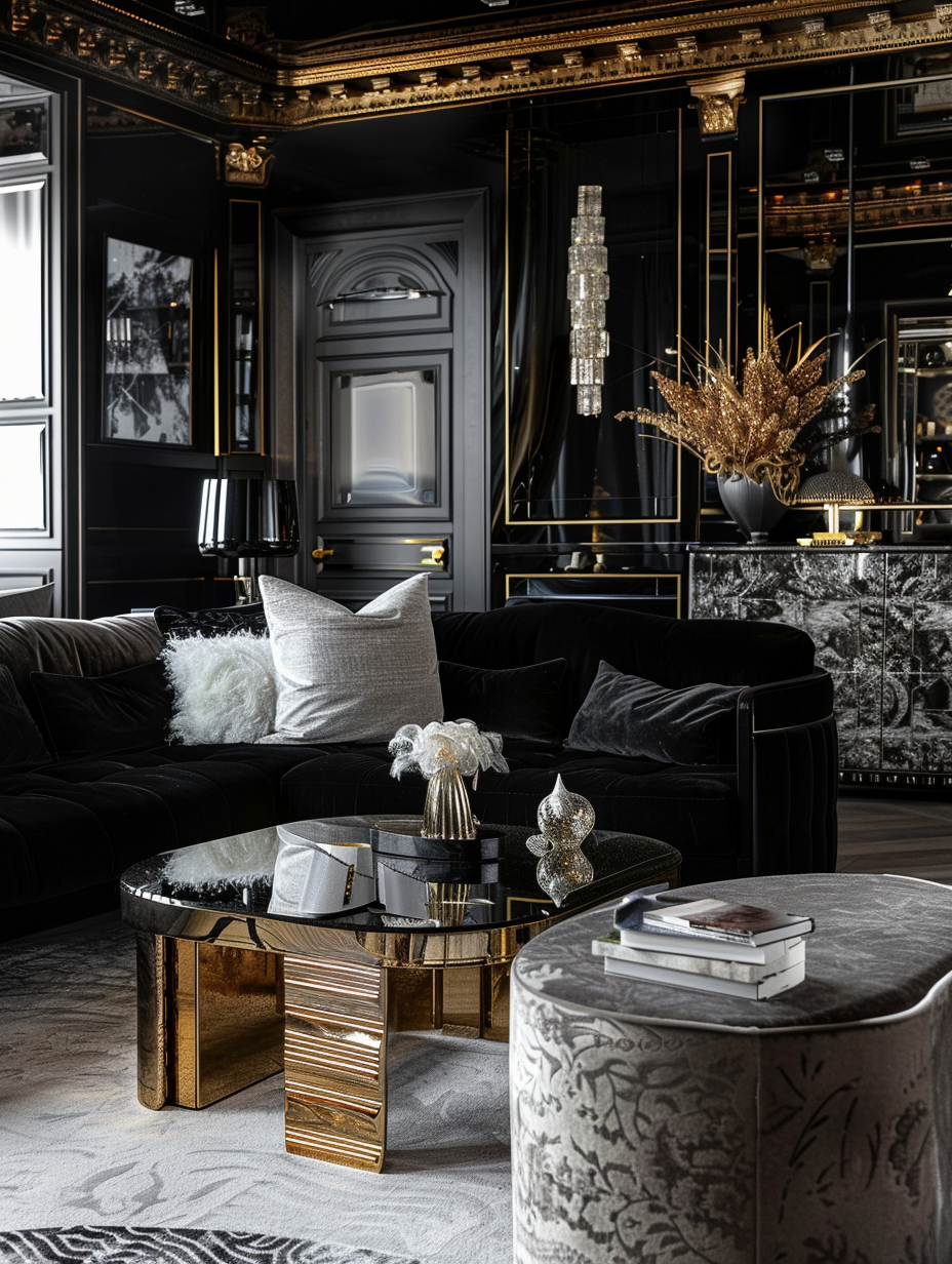Art Deco black living space emphasizes is shown through bold geometric patterns, luxurious properties, and flamboyant colors. Black furniture with gold or silver details, mirrored surfaces, and plush fabrics create a glamorous aesthetic. Introduce such colors as grey, white and taupe as accessories to tone down the overall appearance, and yet keep its style as much as possible.