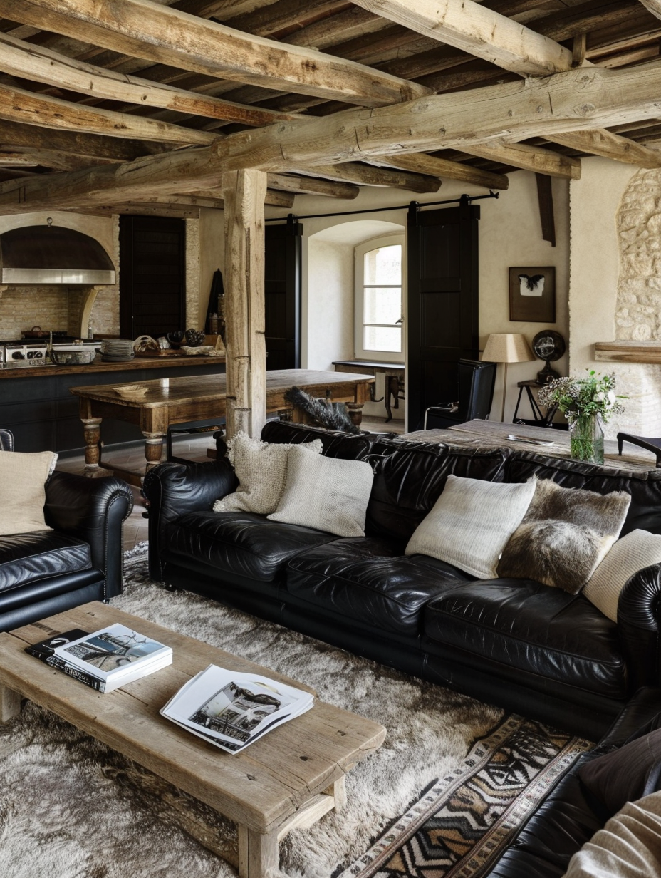 Rustic black living rooms mix the snugness of rustic design with the chicness of black. You need to take black leather sofas and mix them with wooden coffee tables and to expose wooden beams. The addition of taupe with cream throw pillows and rugs is sure to magnify the rustic charm. The warmth and attractiveness of the room are brought out by the natural wood and black duo.