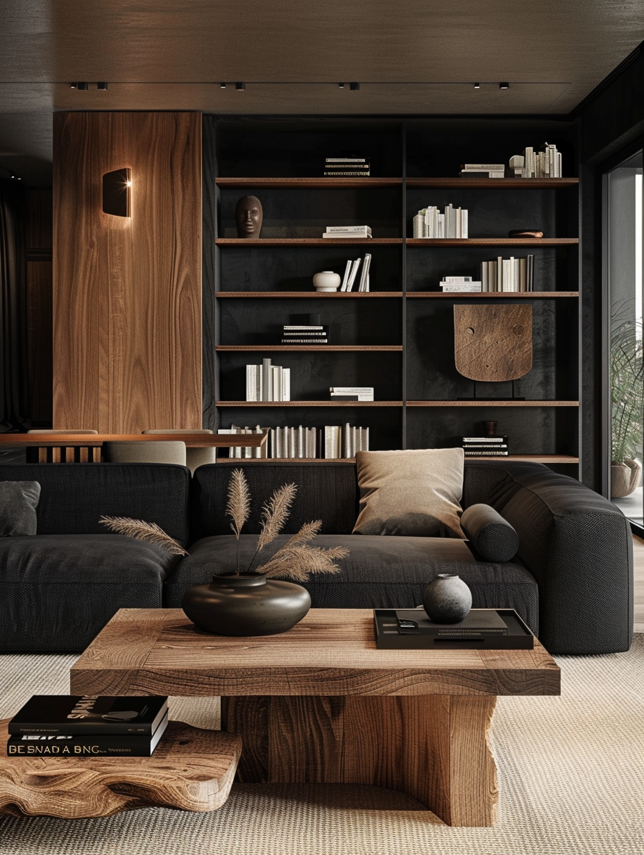 To achieve a cozy and upscale atmosphere, a mix of wood and black items serves as a fine engineering. Select black couches and accent chairs coupled together with wooden coffee tables, bookshelves, and flooring. Place beige and cream details to lighten the appearance. Such a mix of natural and hi-tech materials results in a properly prepared and fashionable development.
