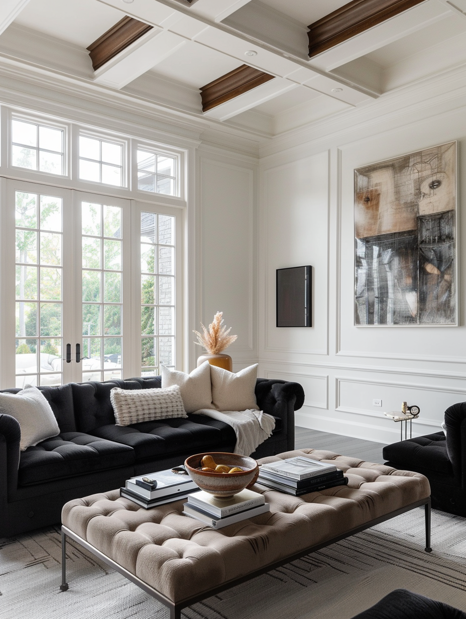 A coherent black living room is structured with a perfect mix of the traditional and the modern. Opt for black traditional-style furniture, such as tufted sofas, which are combined with modern equipment like minimalist decor and sleek coffee tables. Additionally, there are neutral and beige accents that create a more relaxed look and feel by balancing things out, thus creating an accommodating space that is warm and timeless.
