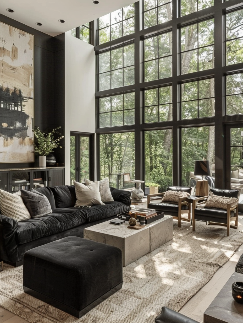 The charisma of a black living room is irrefutable. It is a color that creates a sophisticated, mysterious, and timeless fashion. Whether you are looking at a modern minimalist aesthetic or a luxurious, opulent relax, black is the right choice to unleash your creativity. This article furnishes you with 42 insurgent black living room designs that will make you interconvert your dwelling into a pit of grace and a place of modishness. The ideas range from traditional black and white themes to different mixes of textures and materials, in a way that attracts you to build a living room that is charming and stunning. Go ahead, and get to know about the wisdom to delve deep into the darkness and power of black to jazz up the elegance of your home decor.
