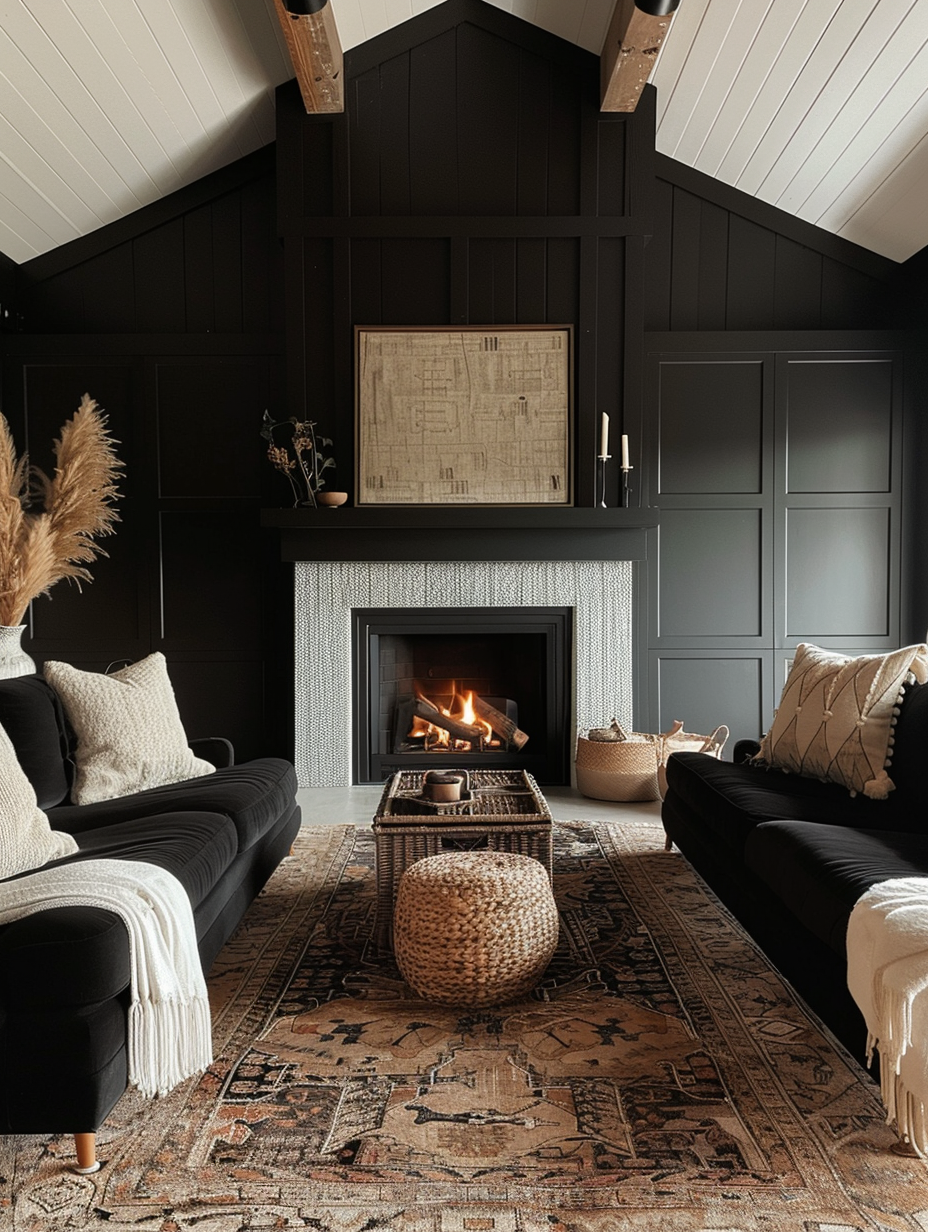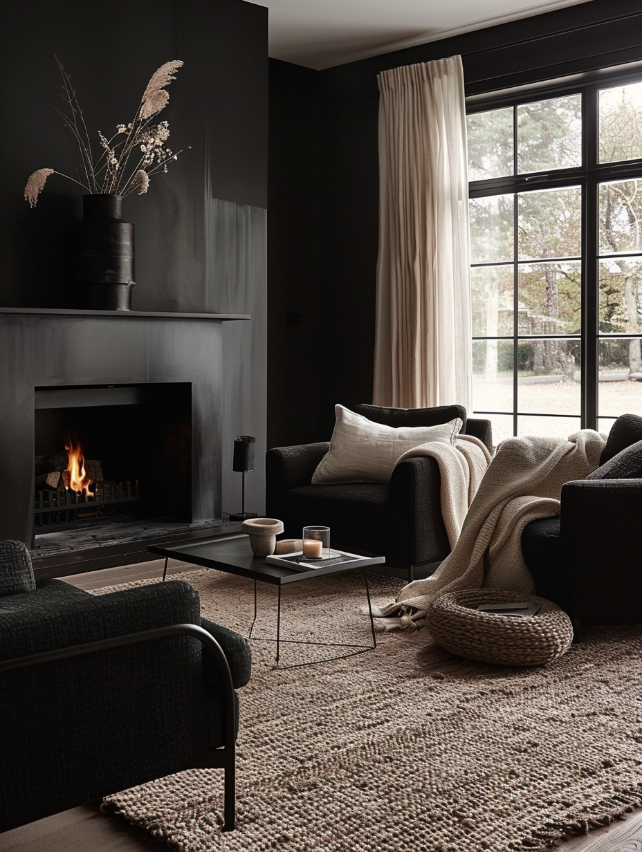 Black Living Room with Cozy Fireplace