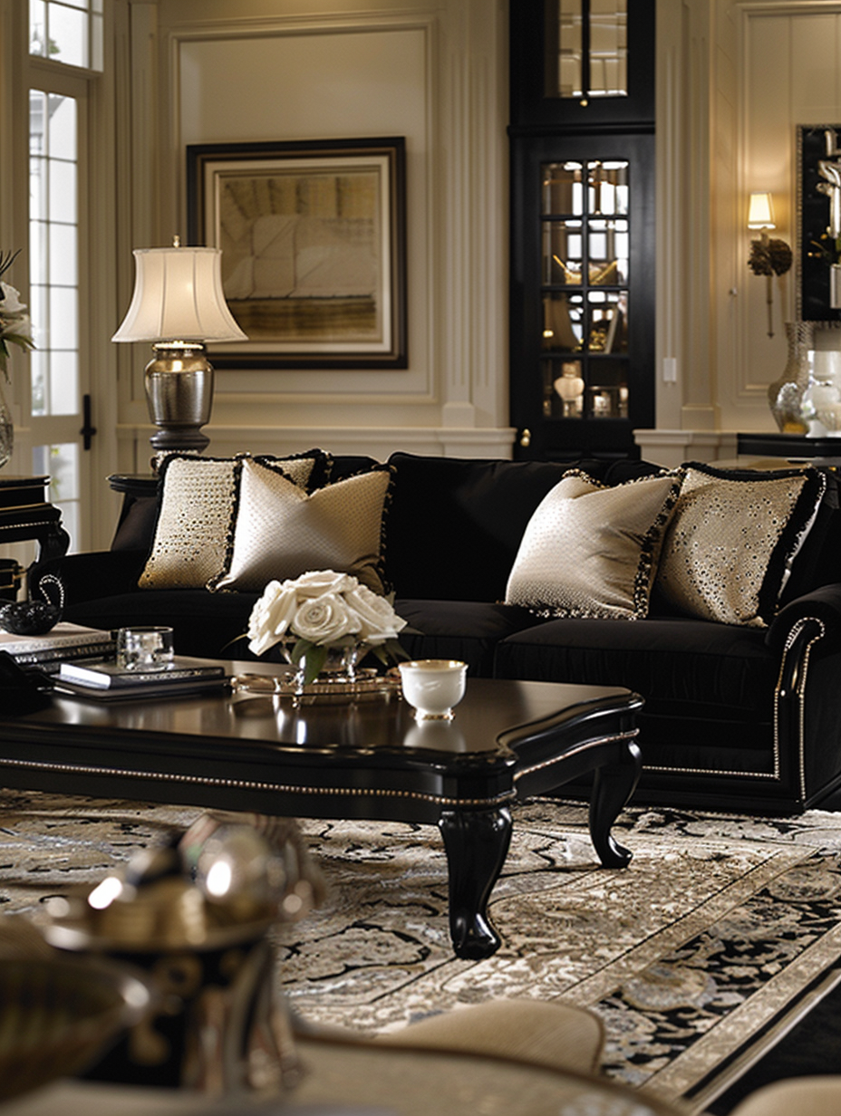 Black velvet furniture is the touch of luxury and sophistication that every living room needs. A room with velvet sofas and armchairs looks luxurious and inviting. Combine these with gold or brass accents using coffee tables and lighting fixtures to create an opulent feel to your space. Adding lighter colors in the form of beige and cream throw pillows and rugs helps warm up the environment and make it more stylish and comfortable.