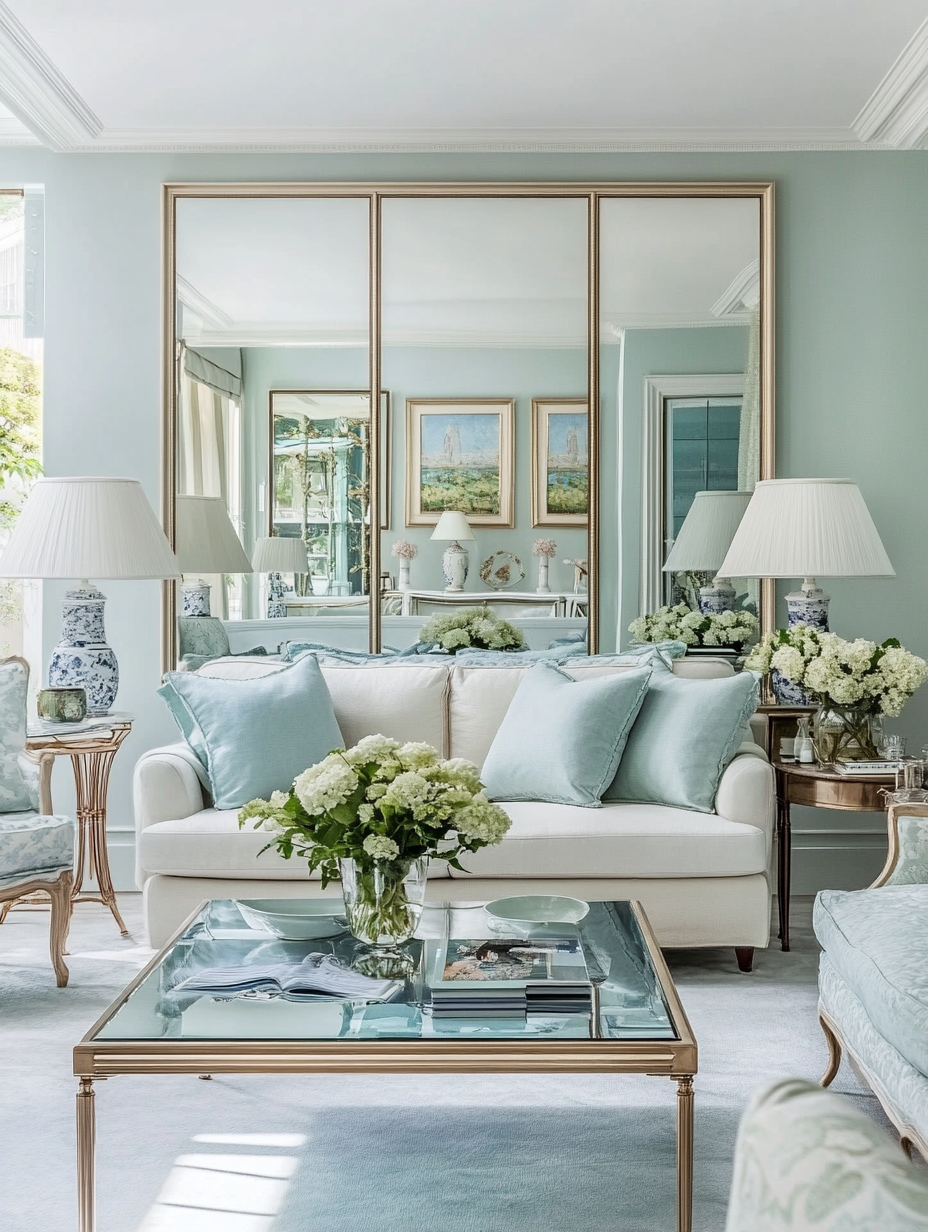 The key to a small living room that feels spacious and deep is blue and green. Choose lighter colors like light blue and gentle green to let the room look wider and lighter. This illusion is amplified by the use of mirrors and light-colored furniture. This can bring the room to life and add more positivity the room if you have a small room.