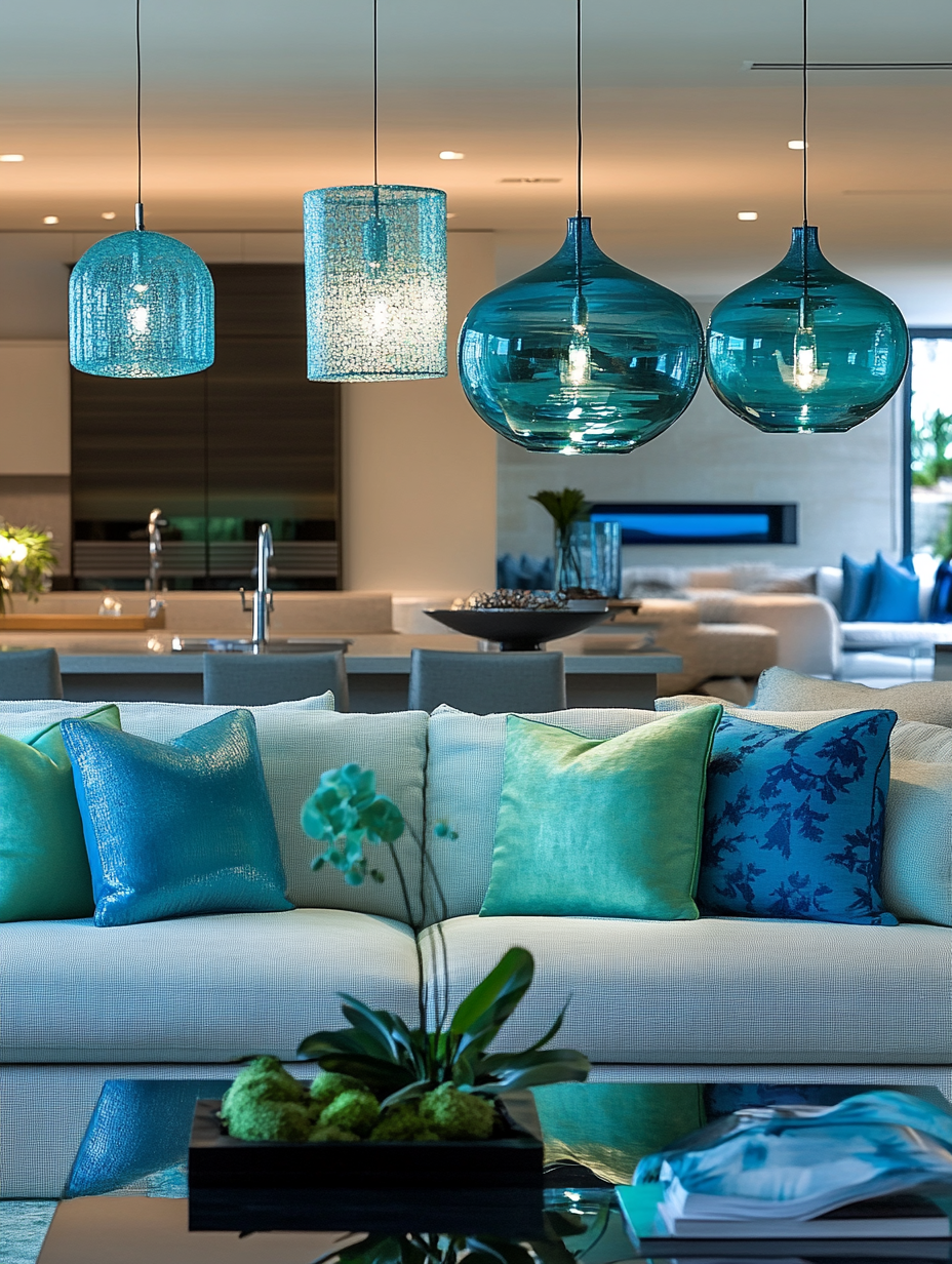 Essential to the overall ambiance of the living room, light is what you use. Colors like blue and green can be added to the lighting plan by means of the lampshades of this color, pendant lights, or floor lamps. The choice of employing fixtures that give out ambient and task lighting together will result in a flexible and attractive space.