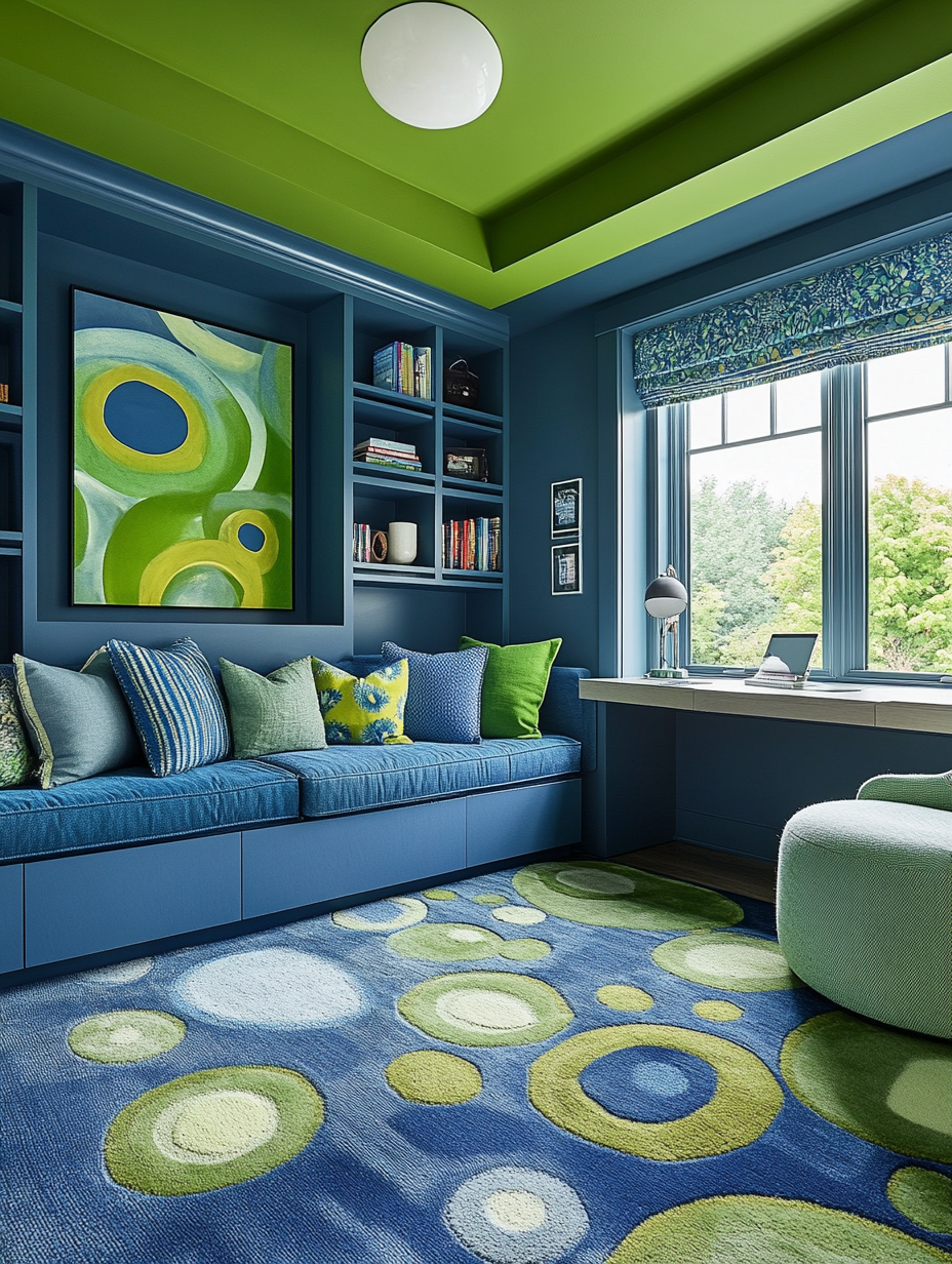 Transform your living room space into a home office corner effectively and attractively with the blue and green shades. By using a blue desk and a green ergonomic chair, make the workspace visually separate. Try adding complementary elements such as a table lamp and storage gadgets in order to preserve the unitary style although work efficiency should also be maintained.