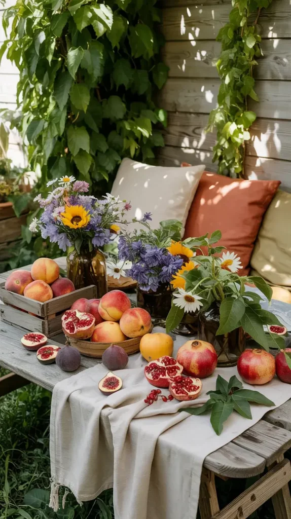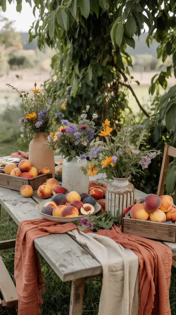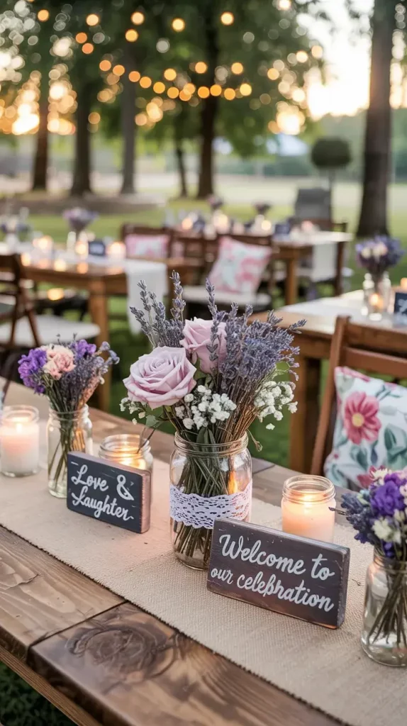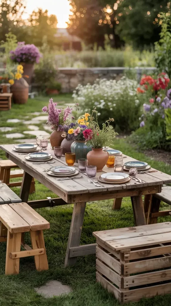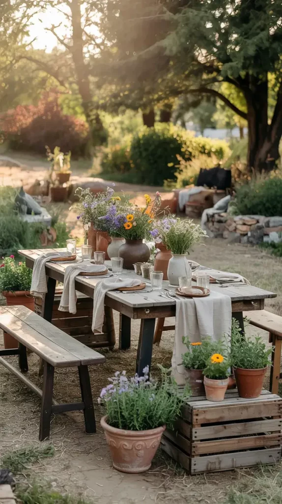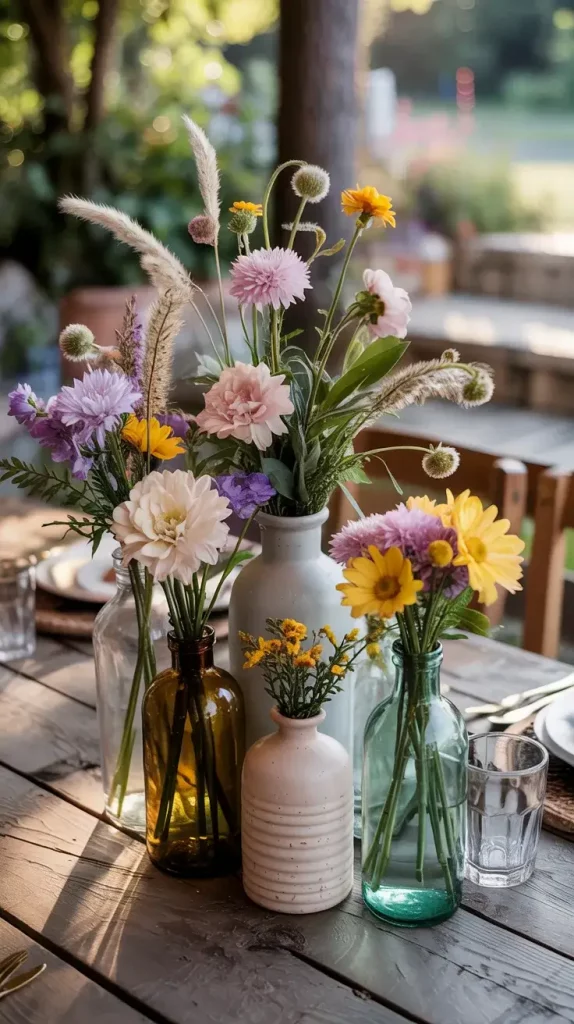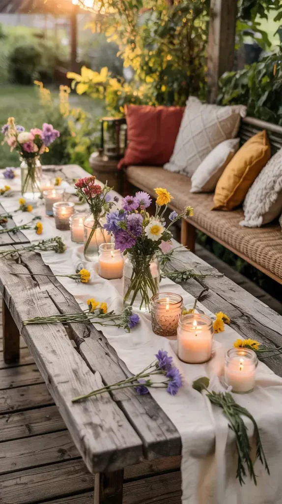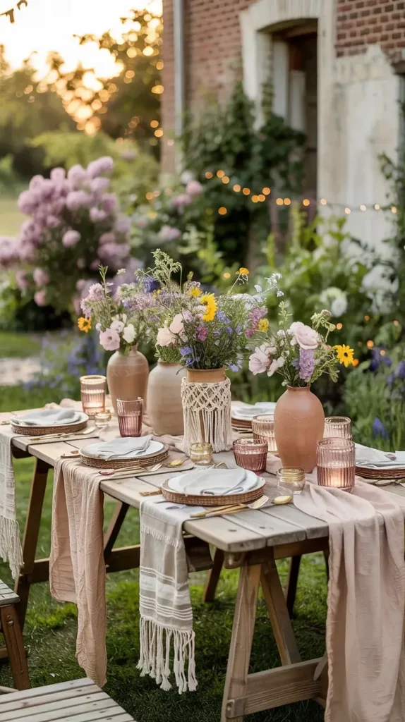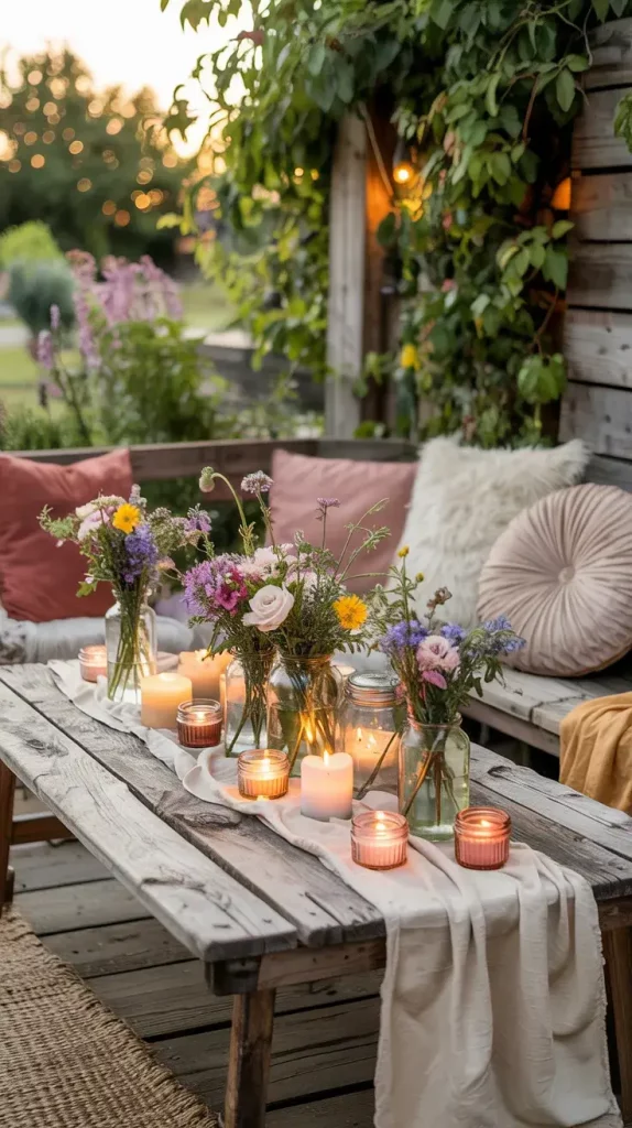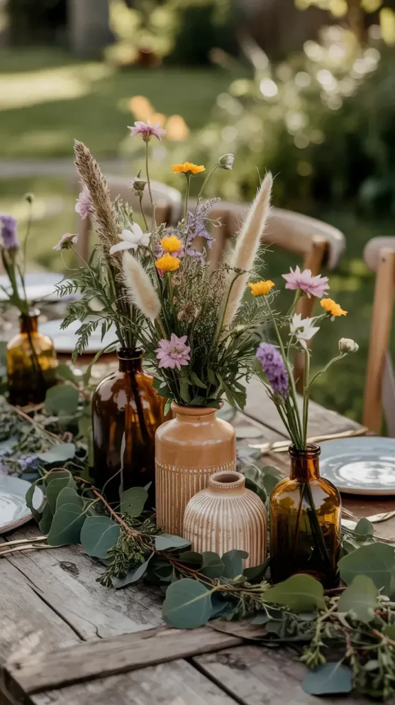 Centerpieces are an essential part of boho rustic garden party decor 2026, and I always aim to keep them organic and slightly untamed. Wildflowers are my go-to choice because they bring color, texture, and a sense of spontaneity to the table.