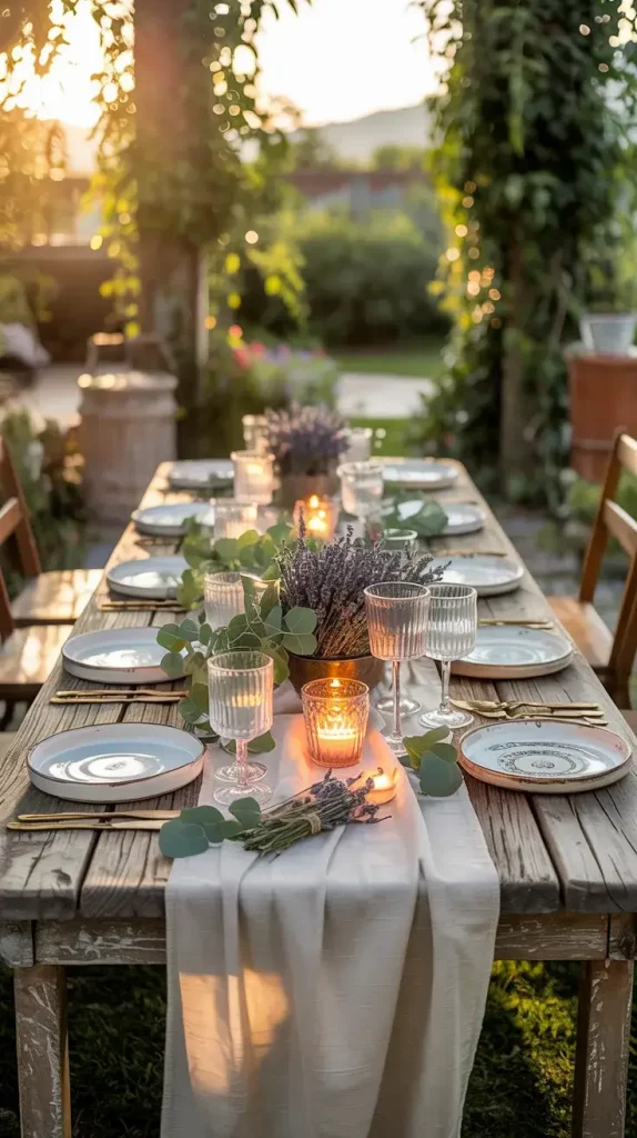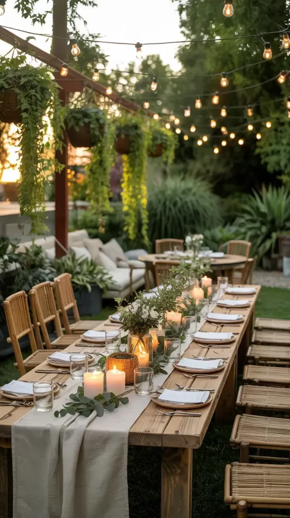 Designing an outdoor dining area is one of the most important aspects of a boho rustic garden party decor 2026, as it serves as the central gathering point. I focus on creating a table setting that feels both elegant and relaxed, blending rustic materials with bohemian details. Long wooden tables or a series of smaller tables arranged together help establish a communal atmosphere that encourages interaction.