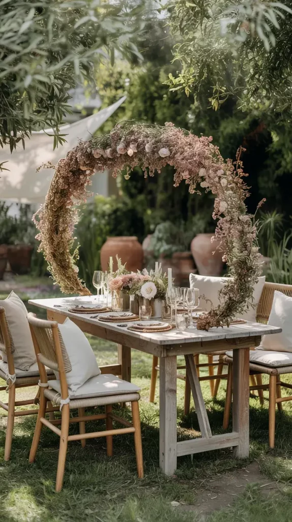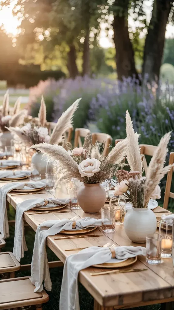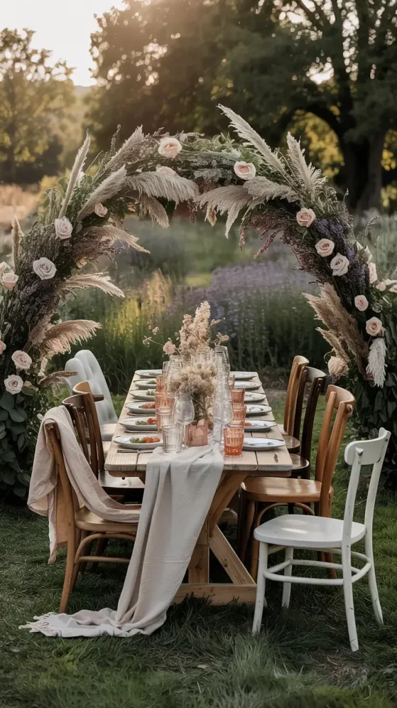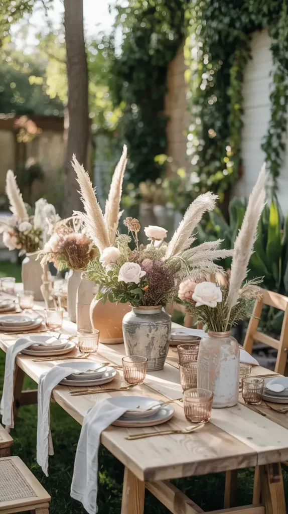 Incorporating pampas grass and dried florals is one of the defining elements of boho rustic garden party decor 2026. I use these materials to create soft, organic arrangements that complement the outdoor environment. Their neutral tones and natural textures make them versatile and easy to integrate into any color palette. They also have the advantage of being long-lasting and low-maintenance.