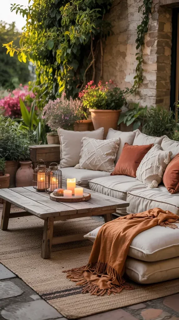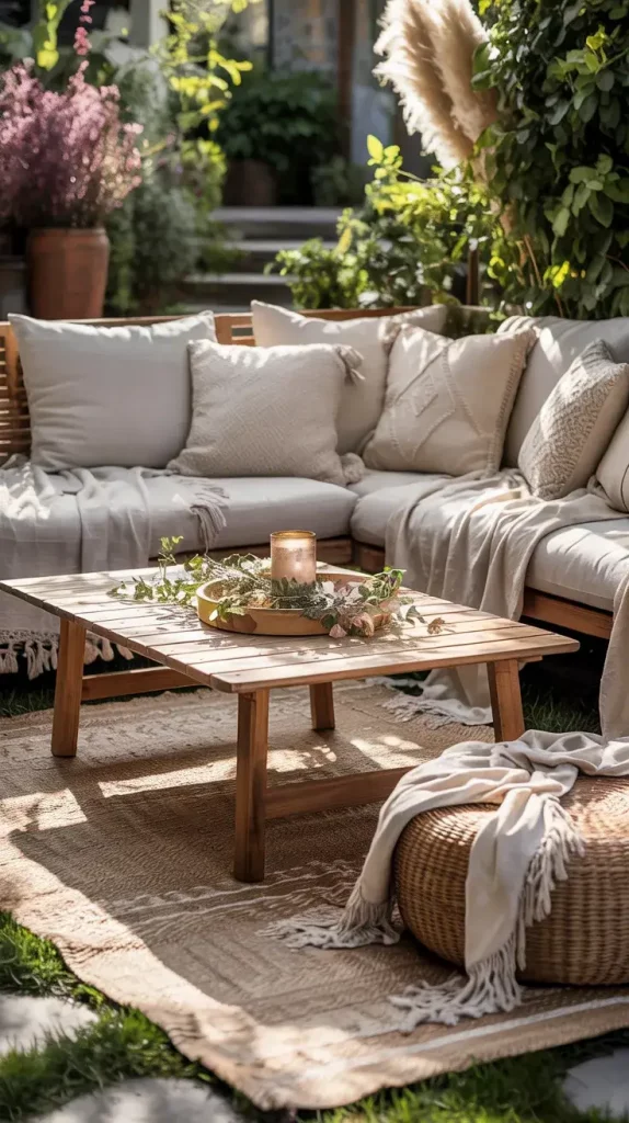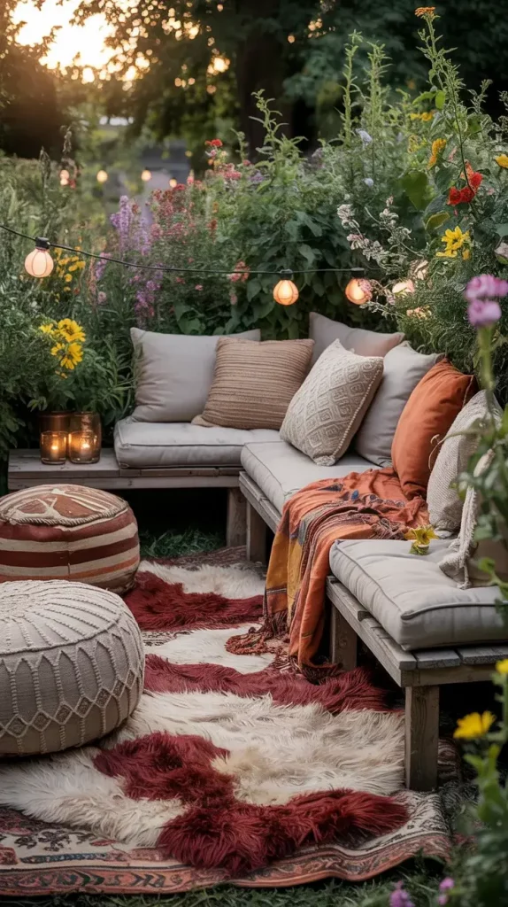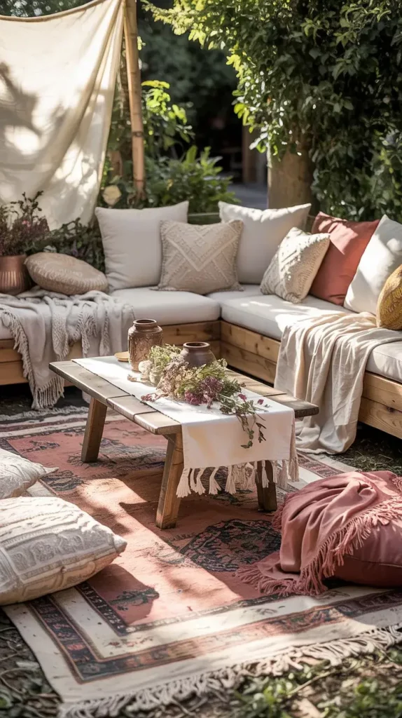 Each seating element plays a specific role. Wooden benches provide stability, while layered rugs define the area and add warmth. I include a mix of cushions in different patterns and textures to enhance visual interest. Throw blankets not only add comfort but also contribute to the layered boho aesthetic.