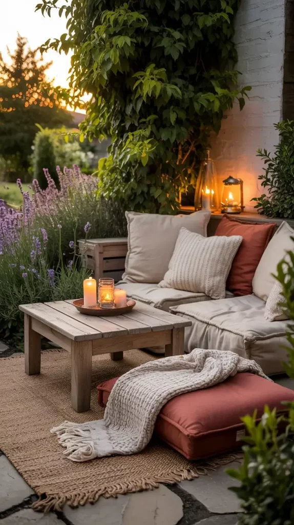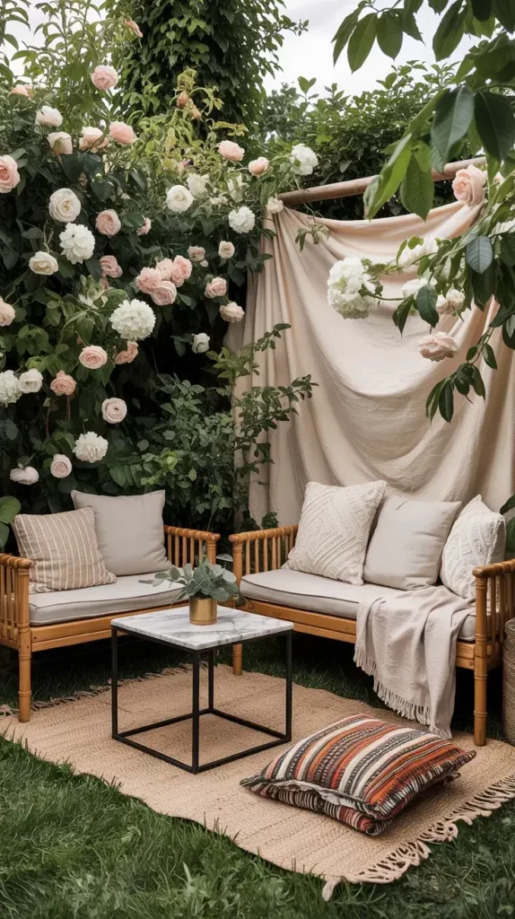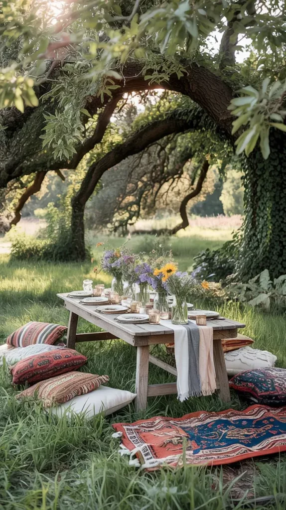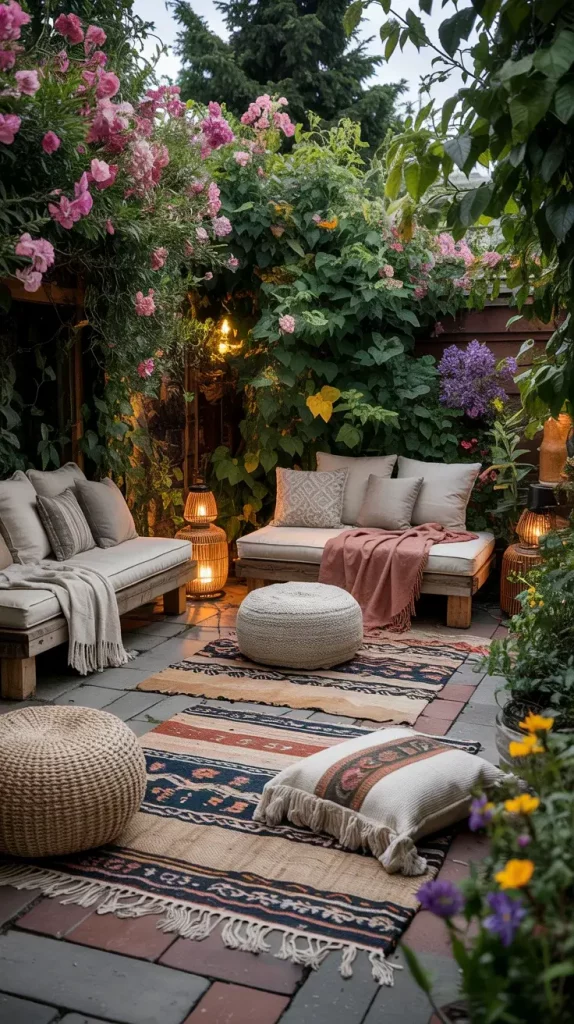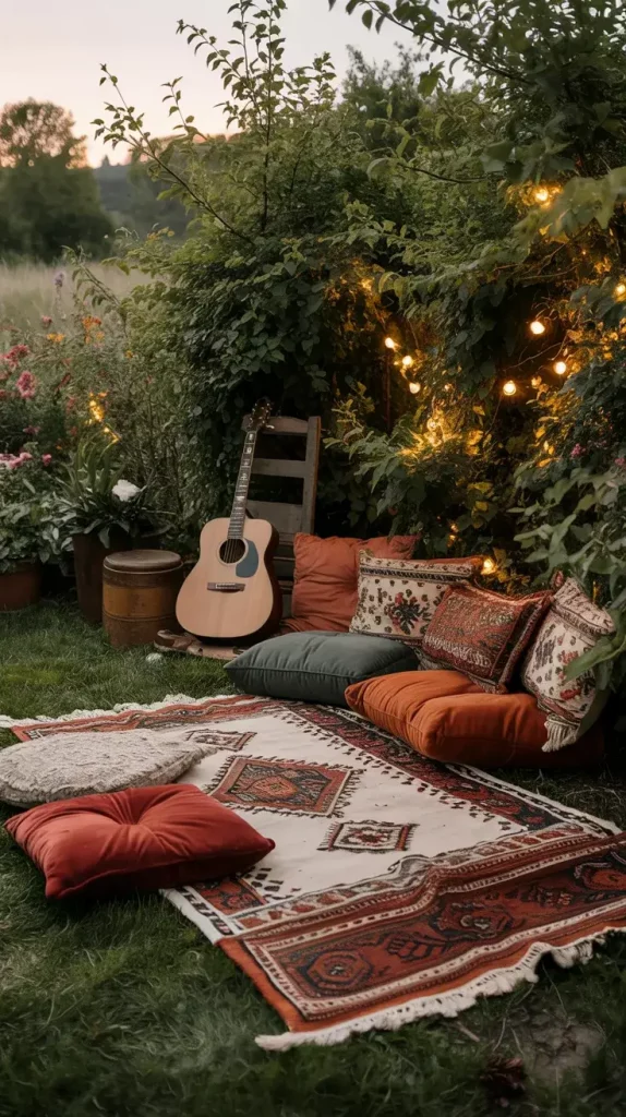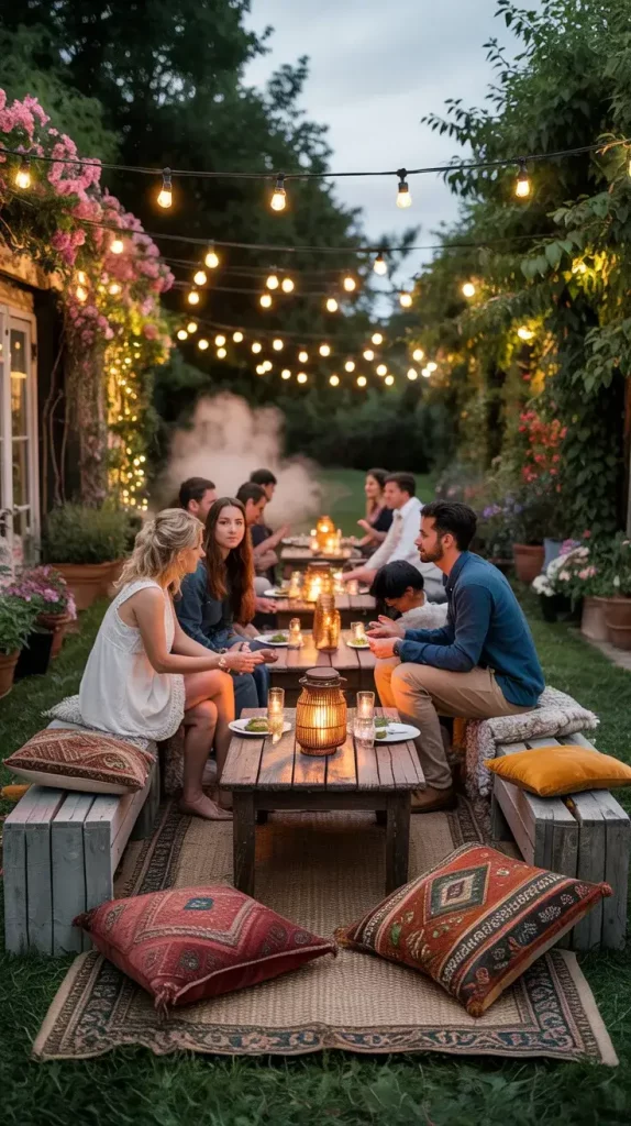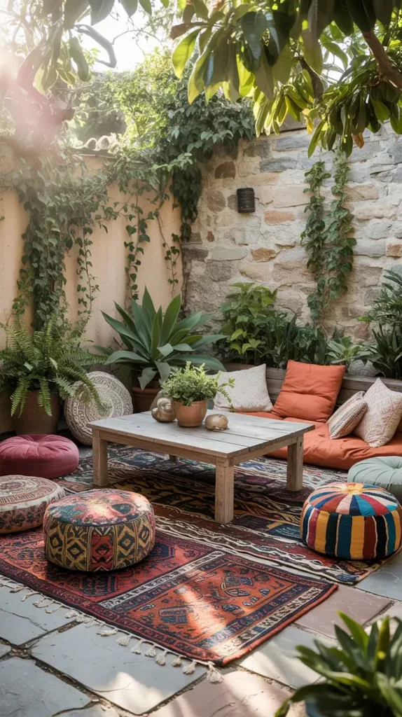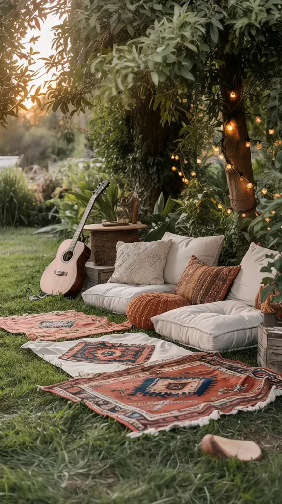 Ground seating is a defining feature of boho rustic garden party decor 2026, and I use it to create a laid-back, intimate atmosphere. Statement rugs serve as the foundation, helping to visually anchor the seating area while adding warmth and texture.