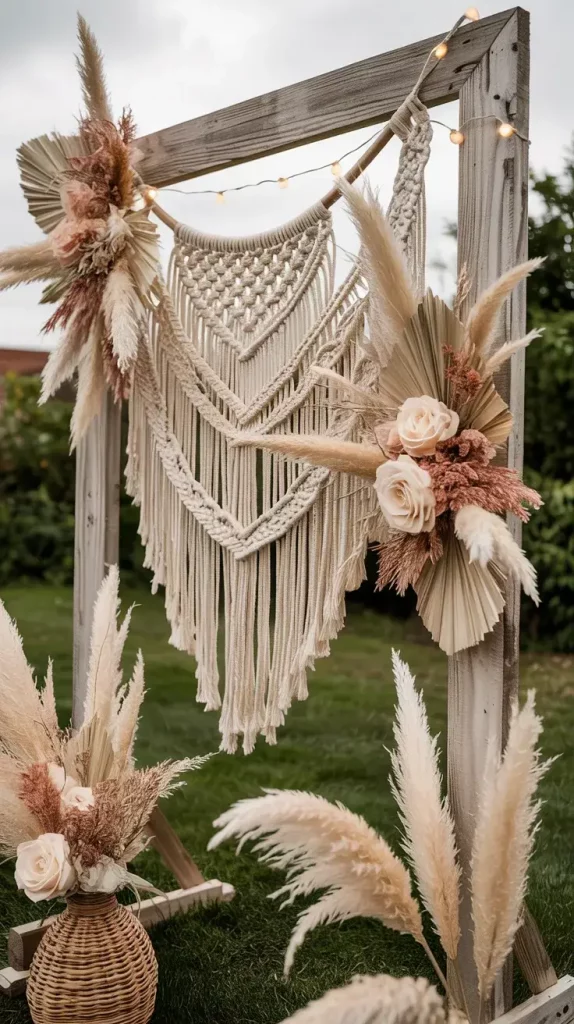 I often use a combination of macramé hangings, wooden frames, and layered textiles to build depth. Adding elements like pampas grass, dried florals, and string lights helps create a dynamic and visually appealing composition. The goal is to design a backdrop that feels organic yet intentional, blending seamlessly with the surrounding environment.
