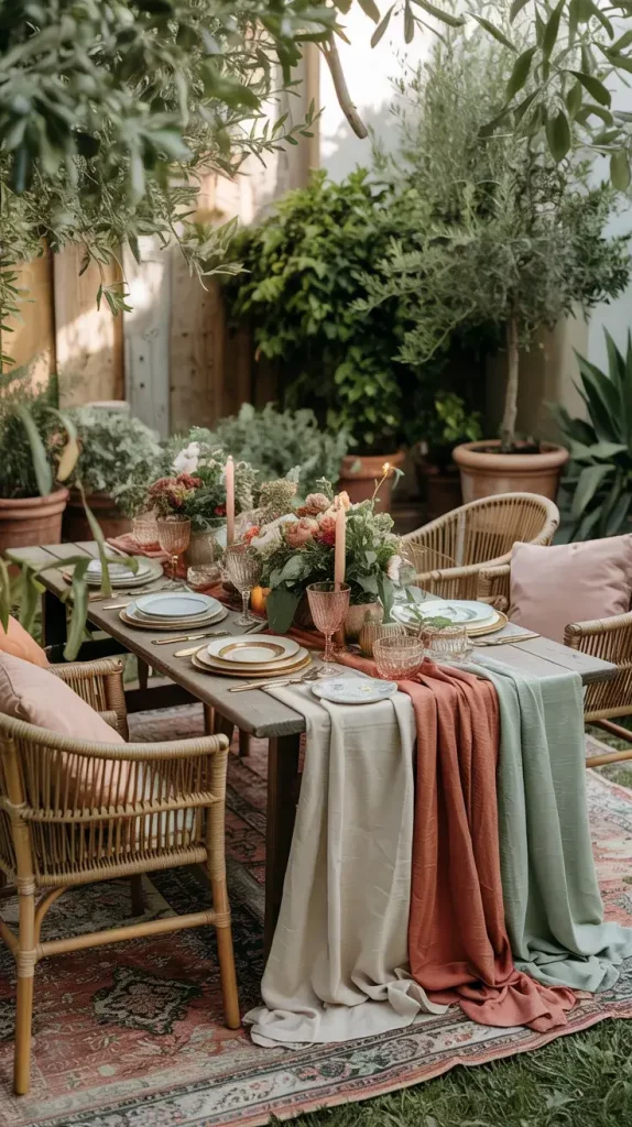 I use natural tablecloths or runners, layered with ceramic plates, vintage glassware, and wooden or brass cutlery. Adding cloth napkins, small decorative accents, and varied heights through candle holders or vases helps create visual interest. I also like to keep the arrangement slightly asymmetrical to maintain that relaxed boho feel.
