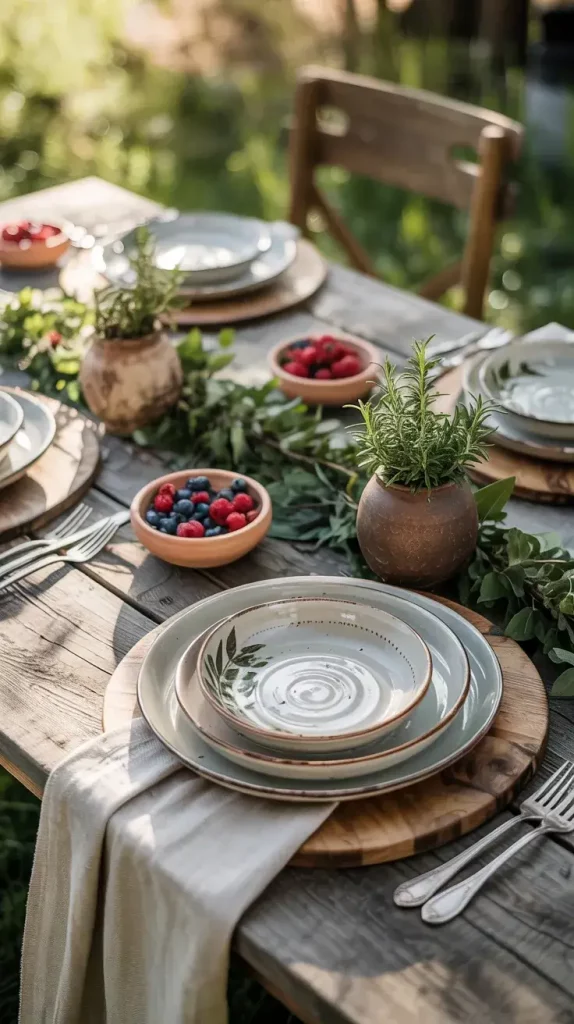 I typically choose ceramic plates, clay bowls, and handcrafted mugs in neutral tones such as beige, terracotta, and soft gray. These pieces pair beautifully with wooden serving boards and linen textiles. The combination creates a harmonious and visually appealing table that feels both curated and approachable.