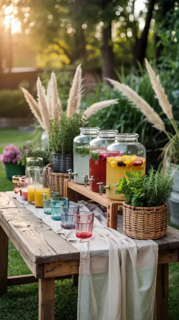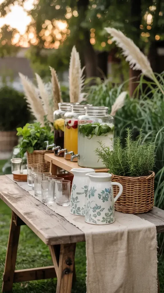 I always start with the drink station because it naturally becomes a focal point in any boho rustic garden party decor 2026. I prefer using reclaimed wooden tables or vintage carts as a base, placing them under a pergola or shaded tree to create a relaxed yet intentional setup. The goal is to make the bar feel integrated into the garden rather than placed on top of it, which is why I layer textures like linen runners, woven trays, and soft greenery.
