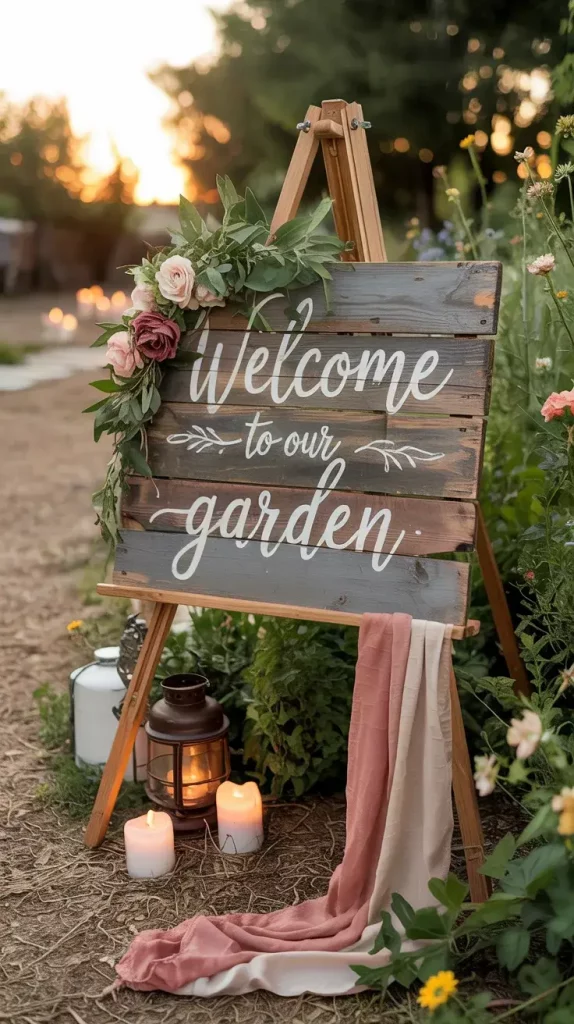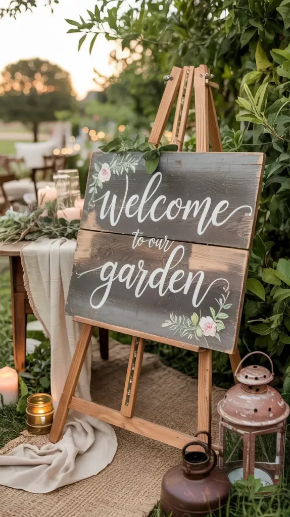 I usually choose handwritten calligraphy or soft brush lettering, as it pairs beautifully with rustic materials. Items such as welcome signs, seating charts, and small directional markers can be displayed on easels, hung from trees, or placed on vintage crates. I also recommend using neutral tones like beige, terracotta, and soft white to maintain a cohesive palette.