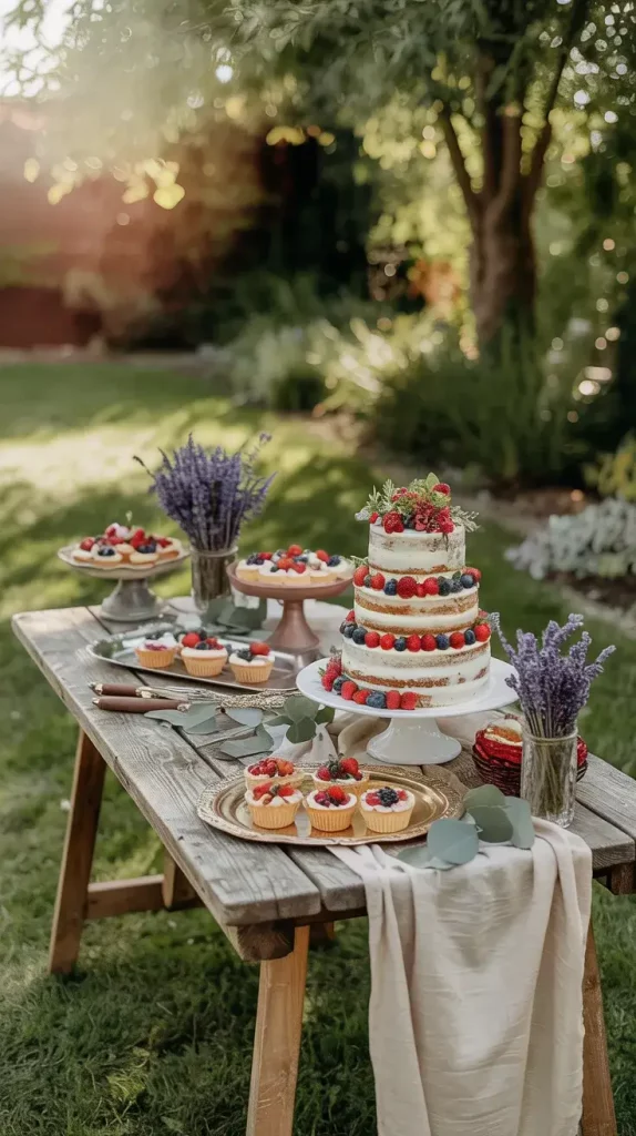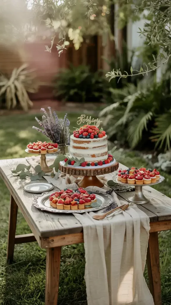 I approach the dessert table as both a functional and decorative centerpiece within boho rustic garden party decor 2026. I usually position it where natural light highlights textures and colors, such as near a tree or against a soft fabric backdrop. The goal is to create a layered visual composition that feels abundant yet balanced, drawing guests in without overwhelming the space.