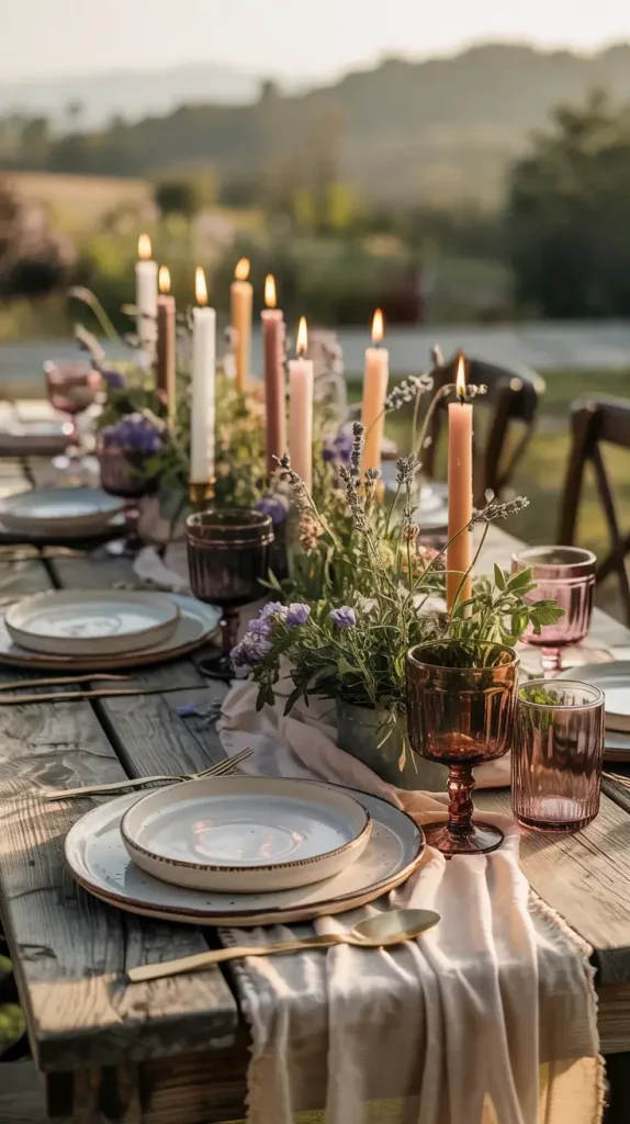 I carefully select tableware and decor to complement the theme. Earth-toned plates, vintage-style glassware, and linen napkins add depth and texture to the setting. I often incorporate runners made of gauze or burlap, along with simple floral arrangements and candles to create a warm ambiance. Every detail is chosen to enhance the dining experience while maintaining visual consistency.