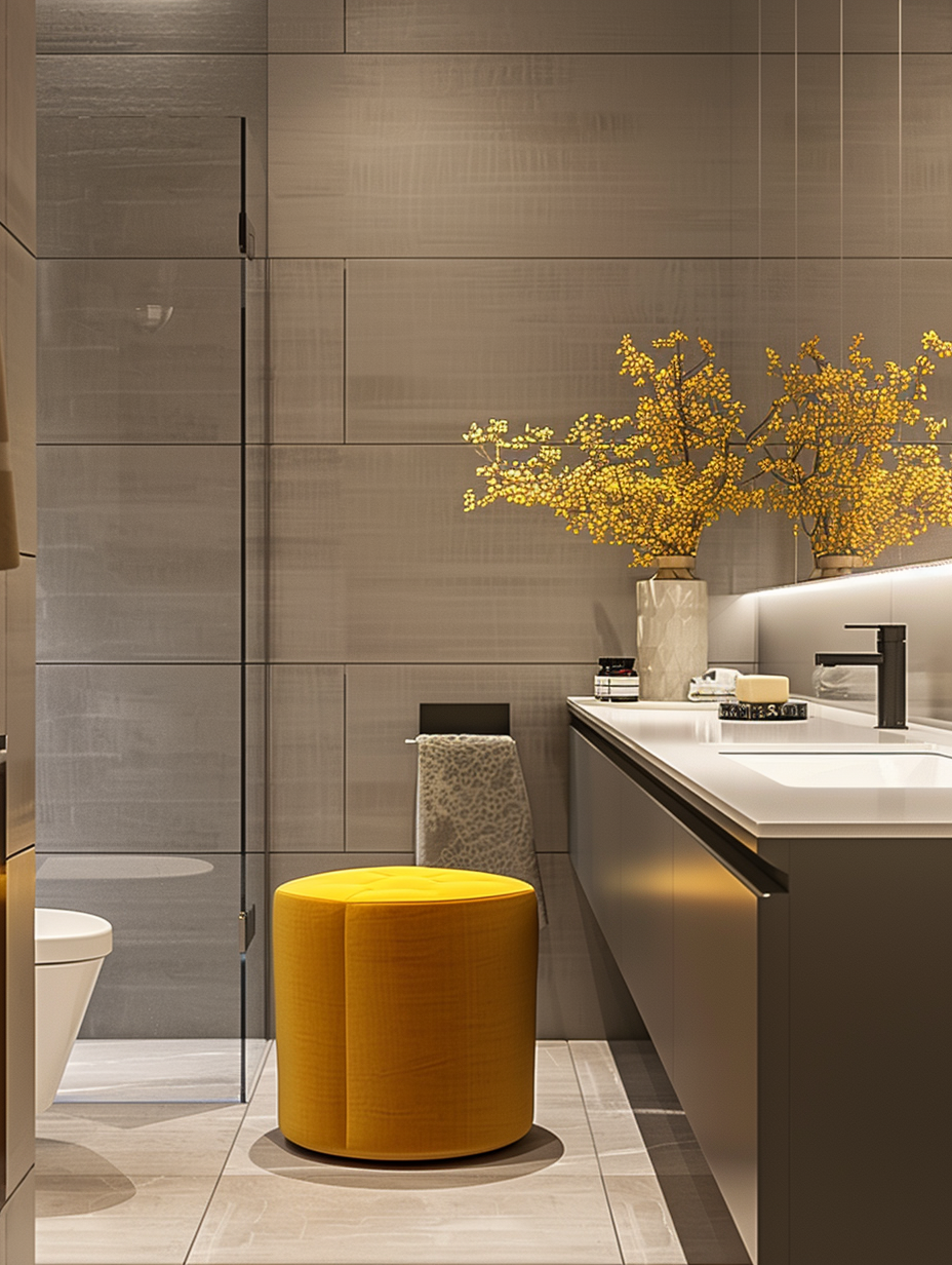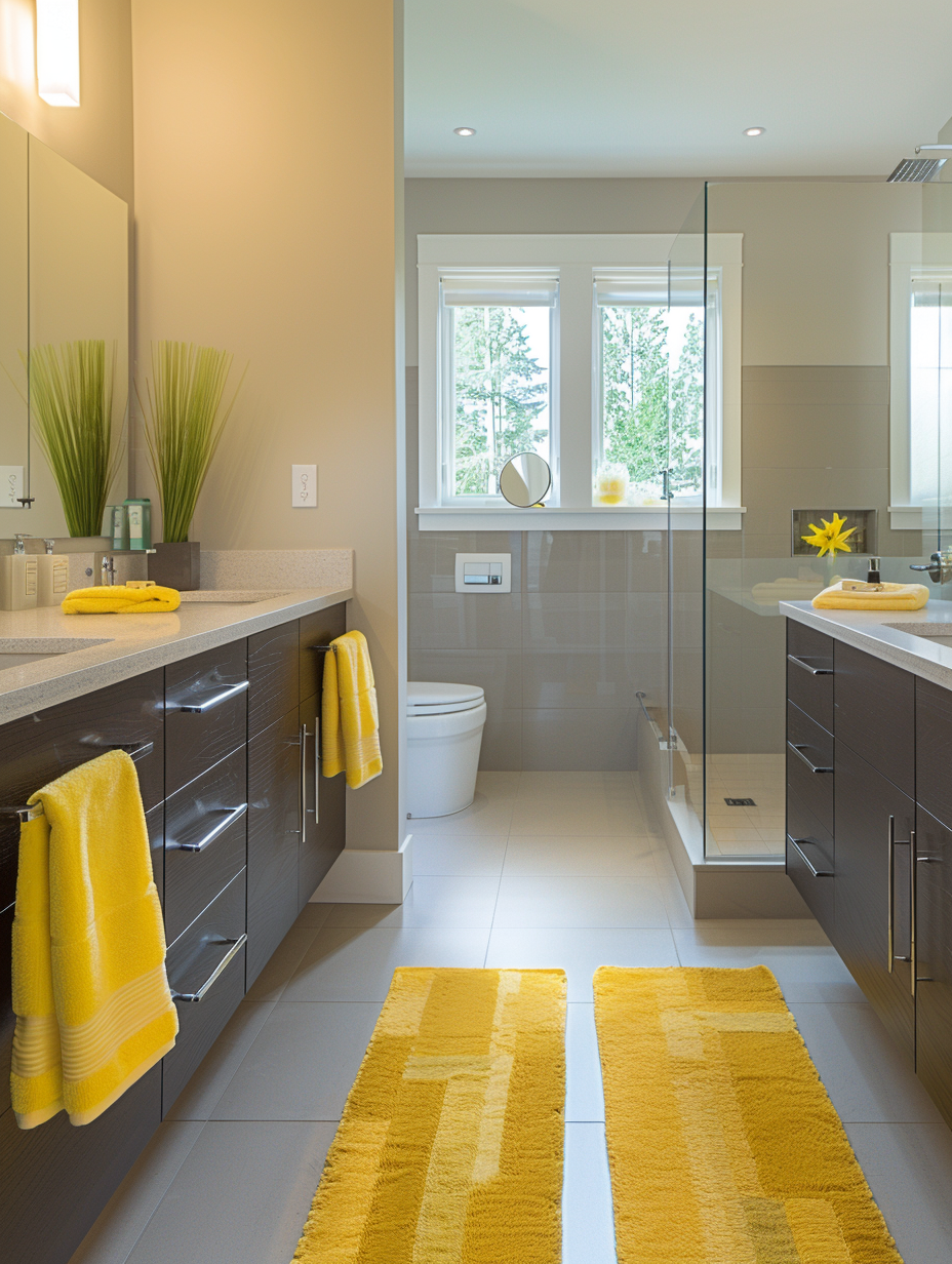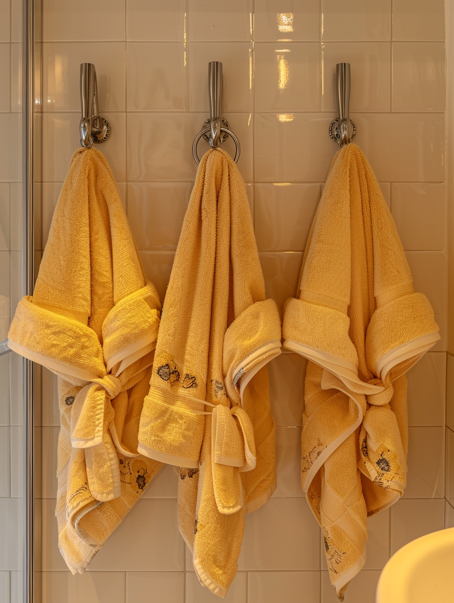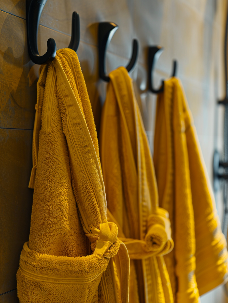 A yellow bathrobe is an item that could be used to enhance any bathroom with a cozy and luxurious appearance.A great way would be to store them on hooks or open shelves to bring some hue and softness to the room.This small change could make your bathroom seem like a spa, rating it in top comfort and trendiness.
