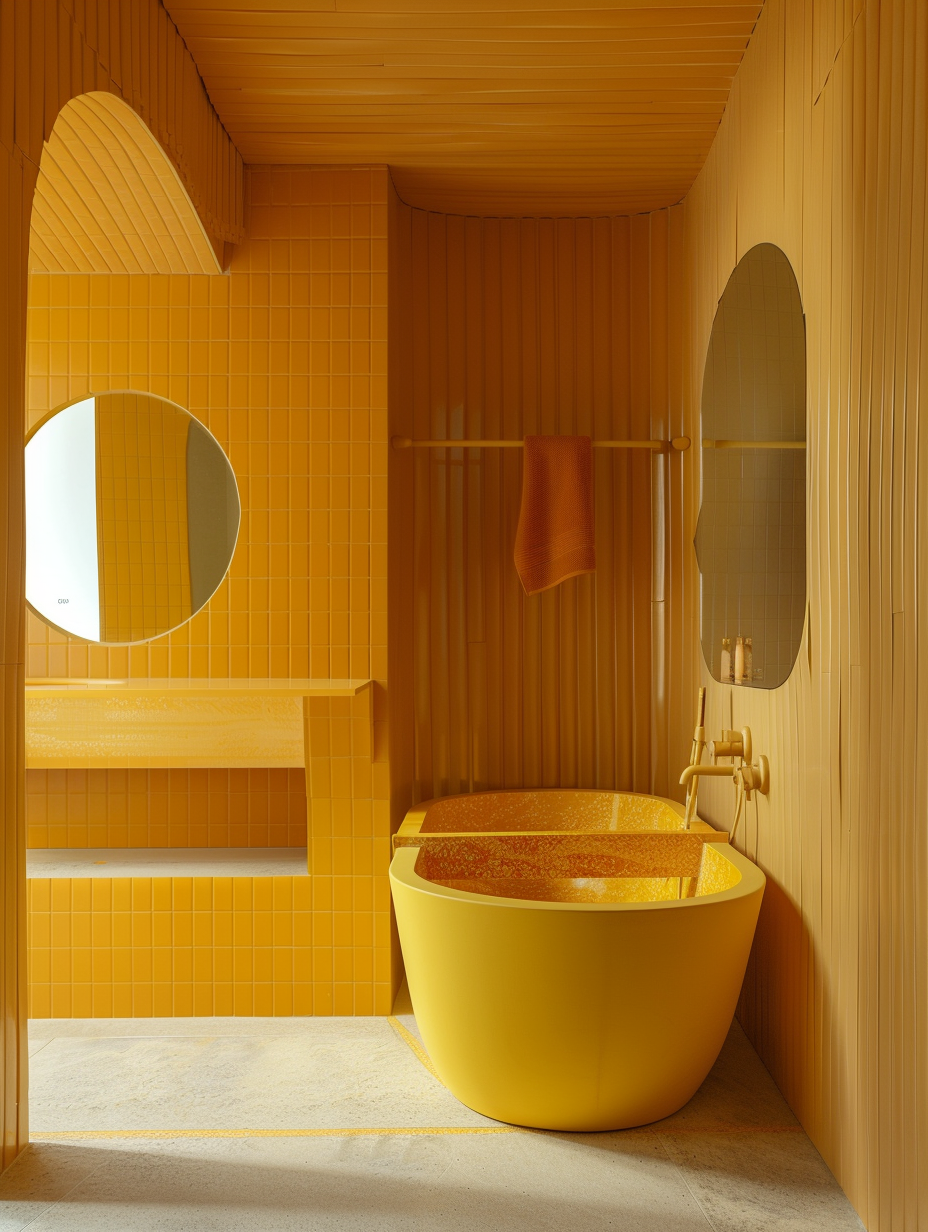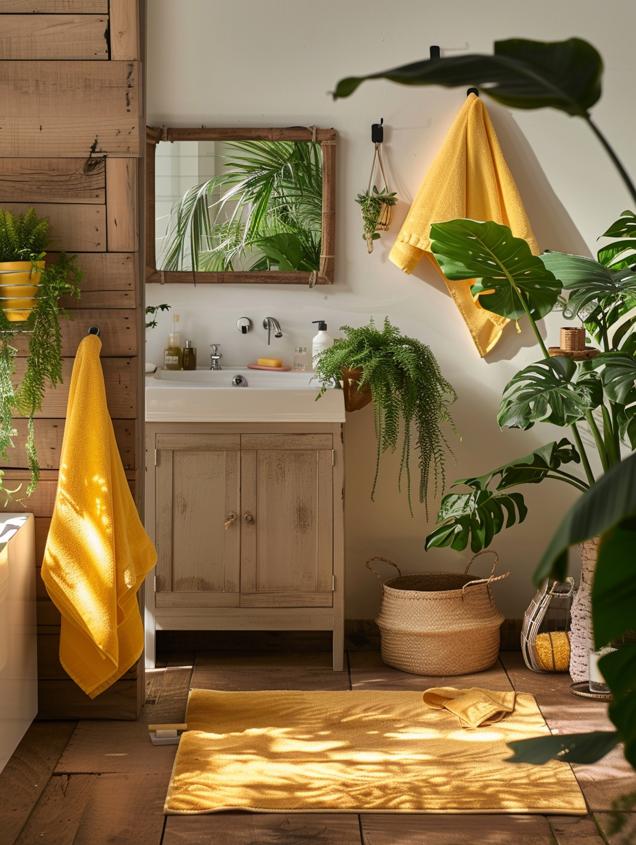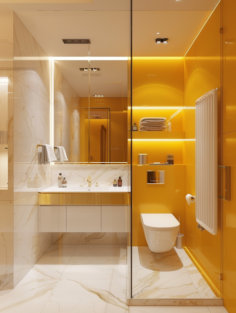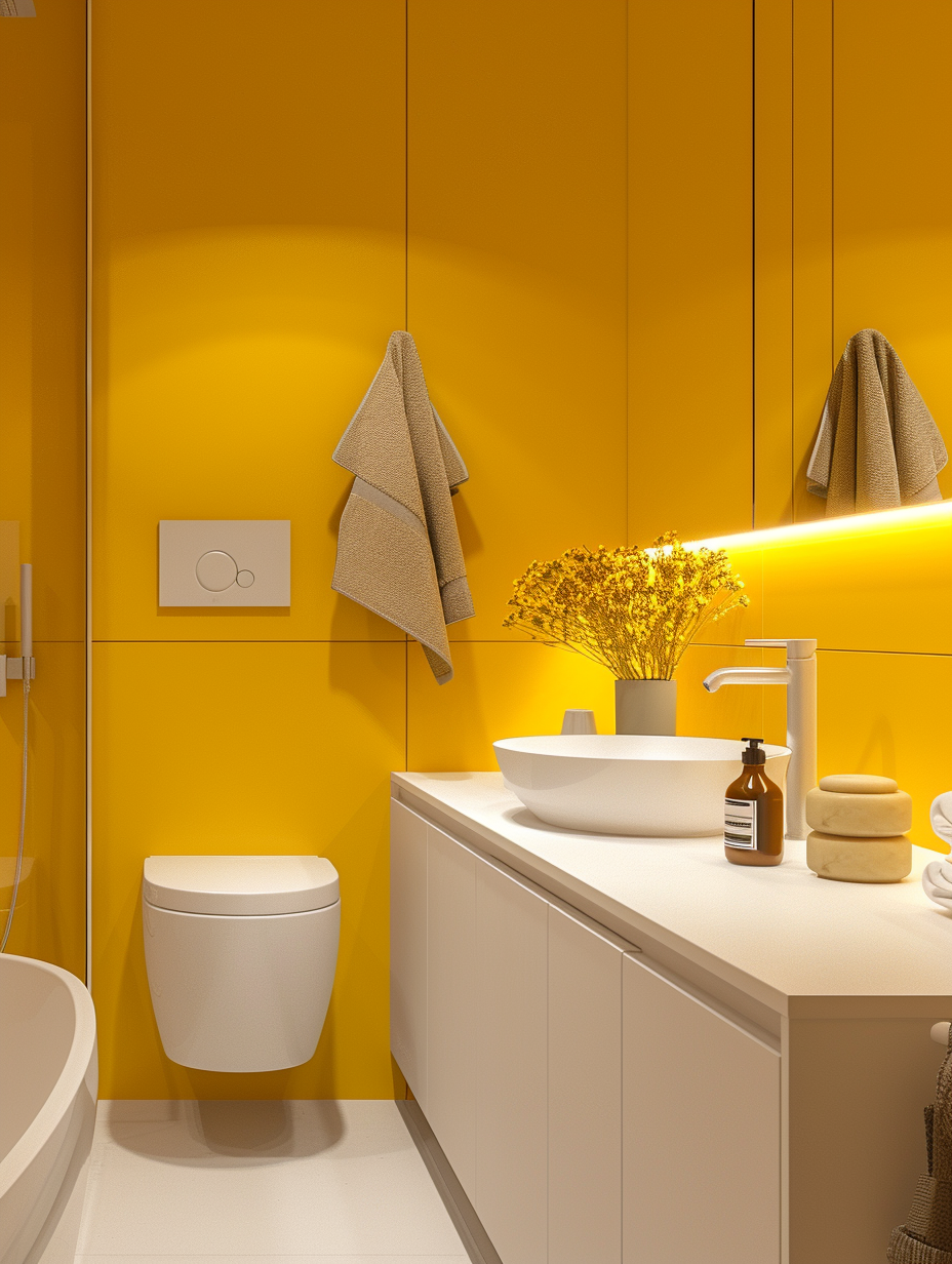A yellow bathrobe is an item that could be used to enhance any bathroom with a cozy and luxurious appearance.A great way would be to store them on hooks or open shelves to bring some hue and softness to the room.This small change could make your bathroom seem like a spa, rating it in top comfort and trendiness.