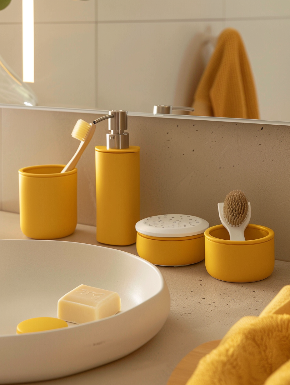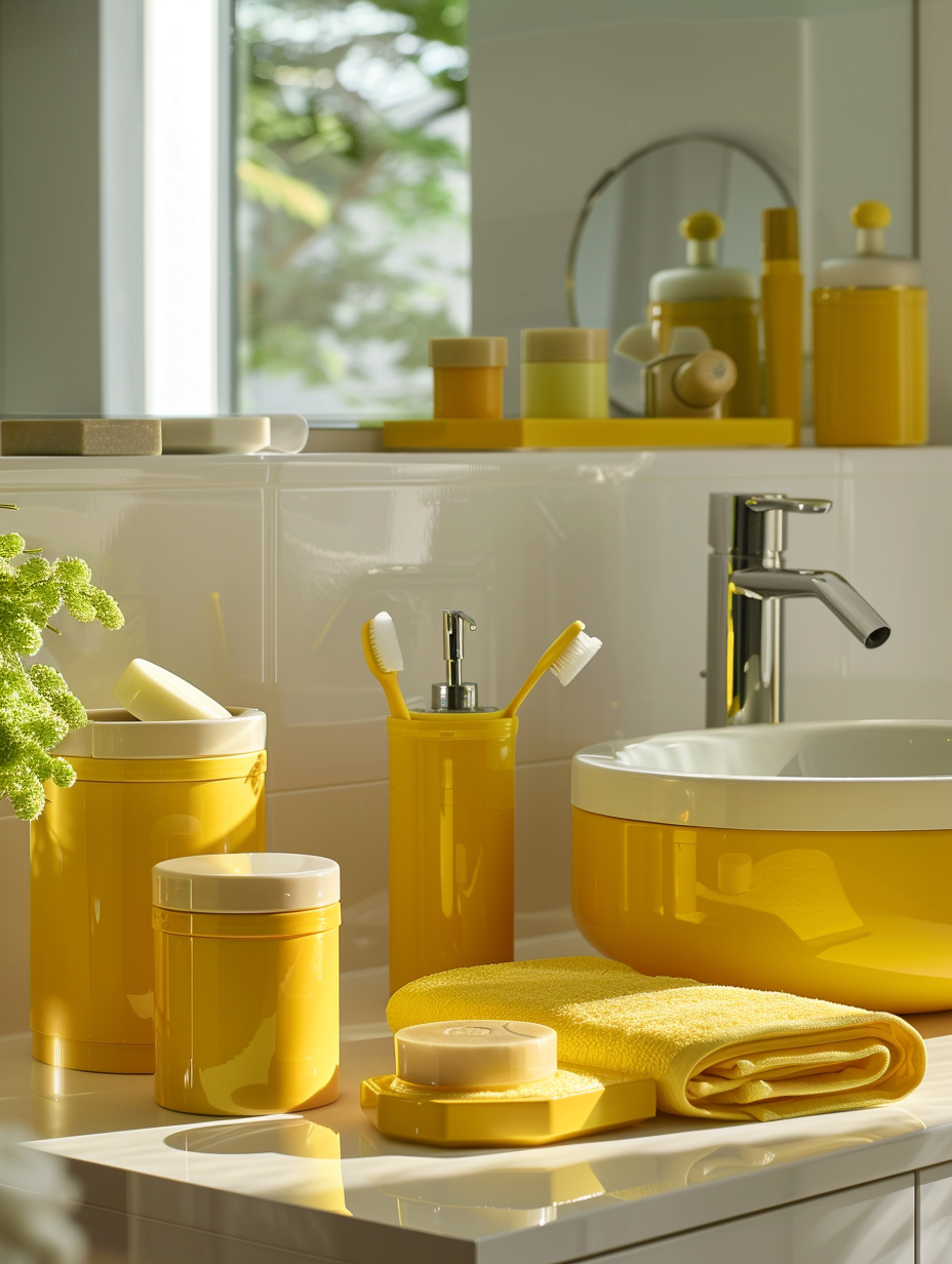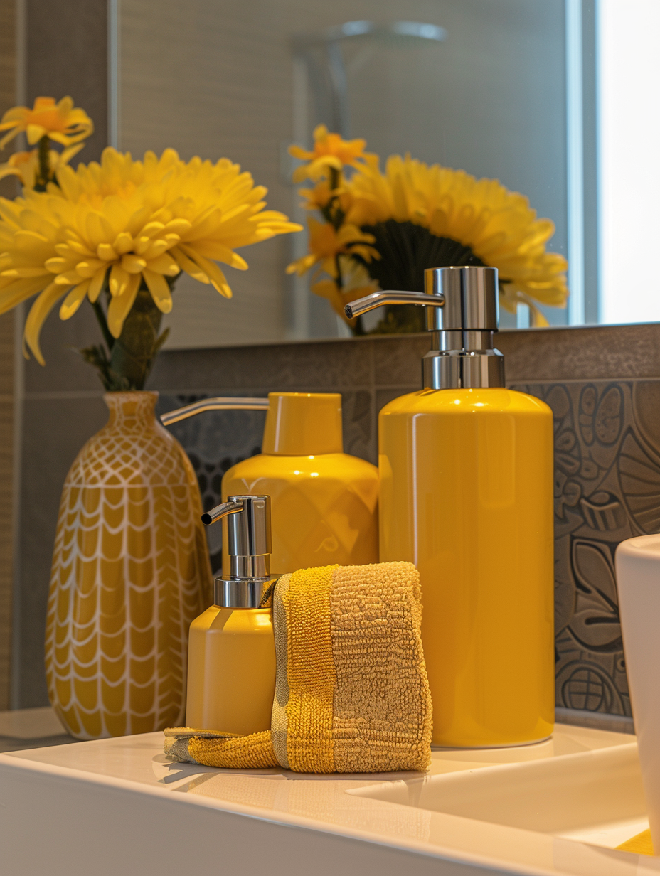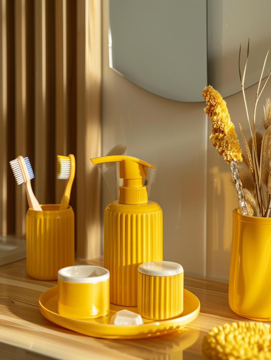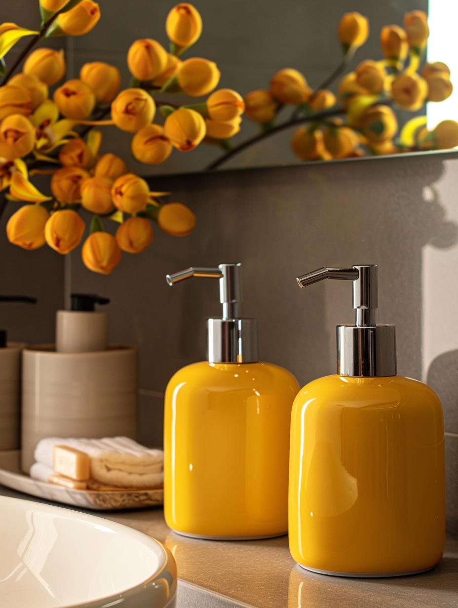 Bathroom with yellow bath products in matching containers, coordinated and lively touch, modern style, bright lighting can create a coordinated and lively touch to your bathroom! Displaying these products in matching yellow containers can not only bring a more uniformed look to the entire area but can also stand out and be the main eye-catcher in the bathroom decor. This small but impactful detail can link other yellow elements throughout your bathroom together.