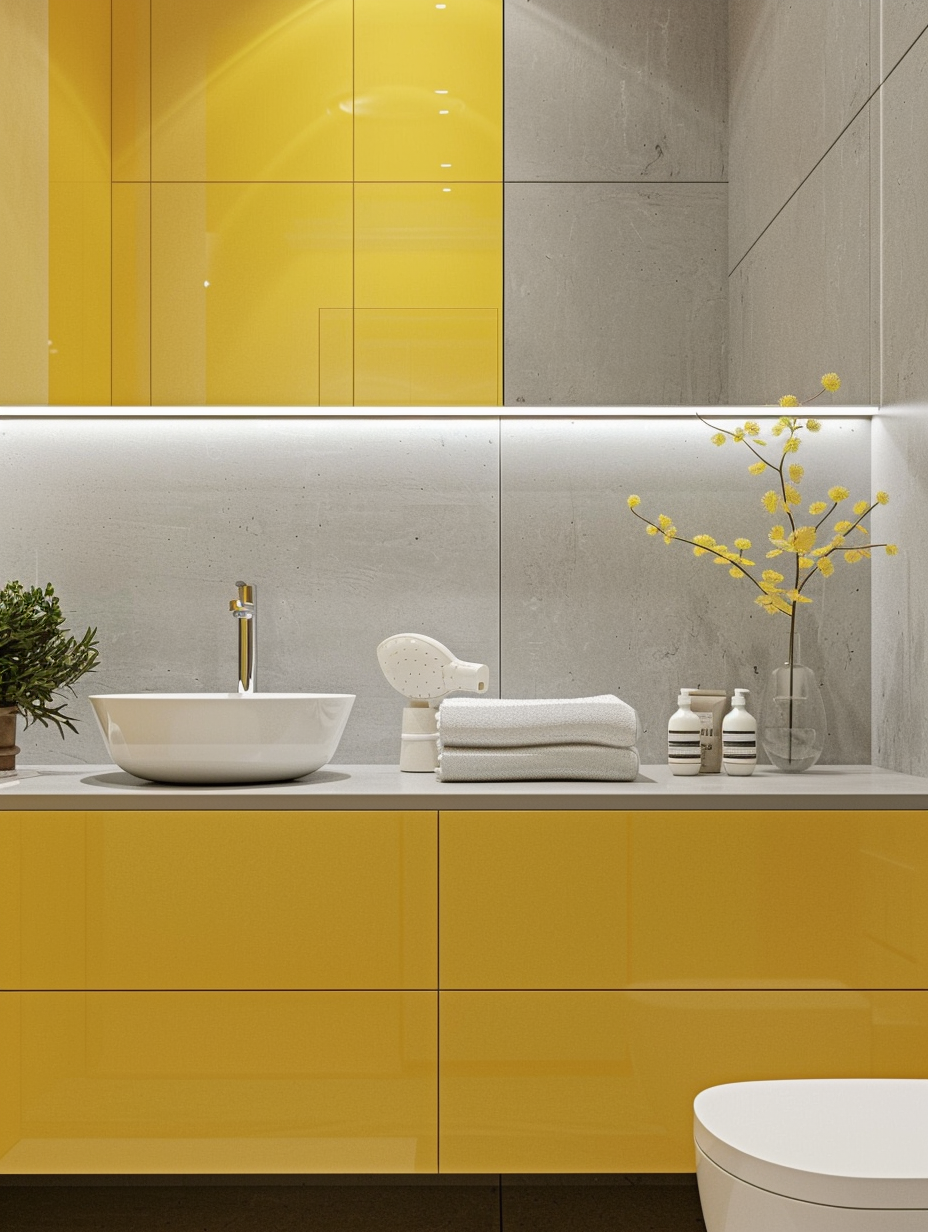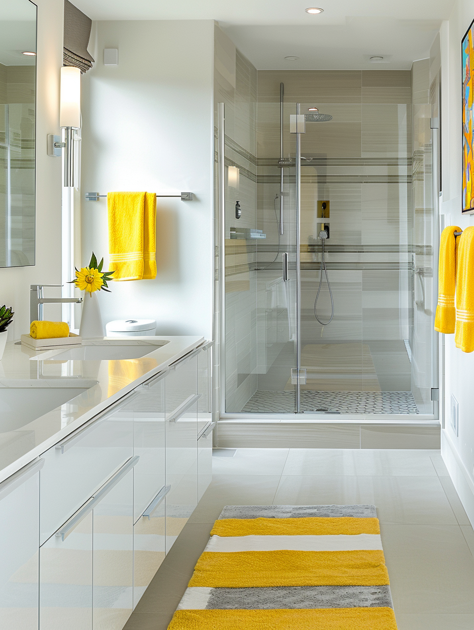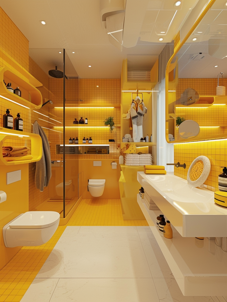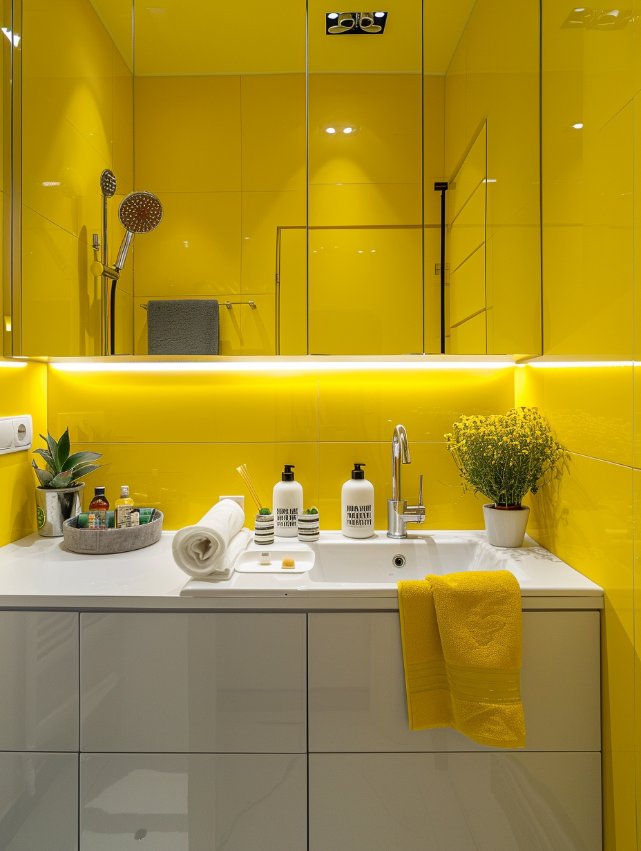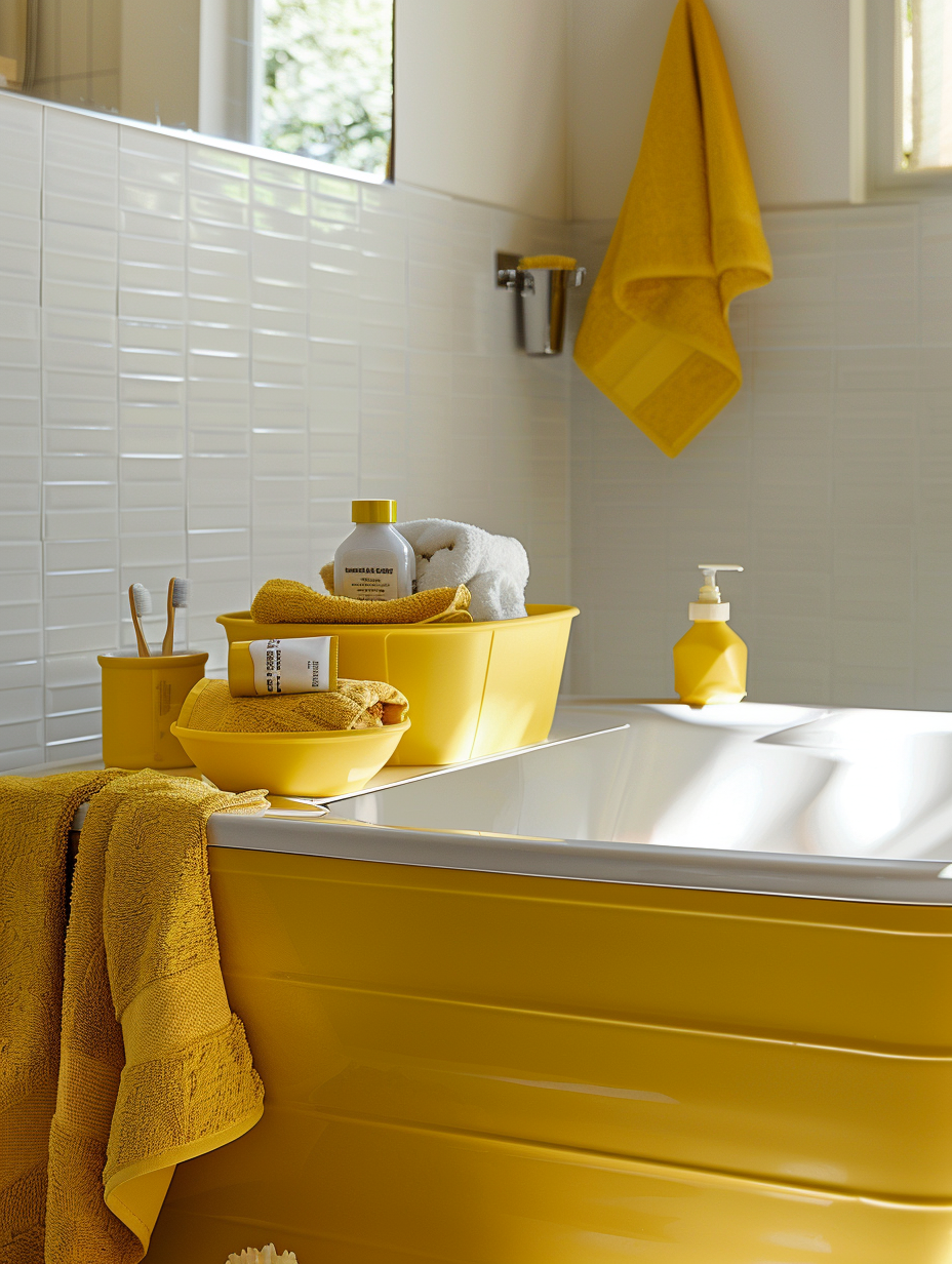 Bathroom with yellow bath products in matching containers, coordinated and lively touch, modern style, bright lighting can create a coordinated and lively touch to your bathroom! Displaying these products in matching yellow containers can not only bring a more uniformed look to the entire area but can also stand out and be the main eye-catcher in the bathroom decor. This small but impactful detail can link other yellow elements throughout your bathroom together.