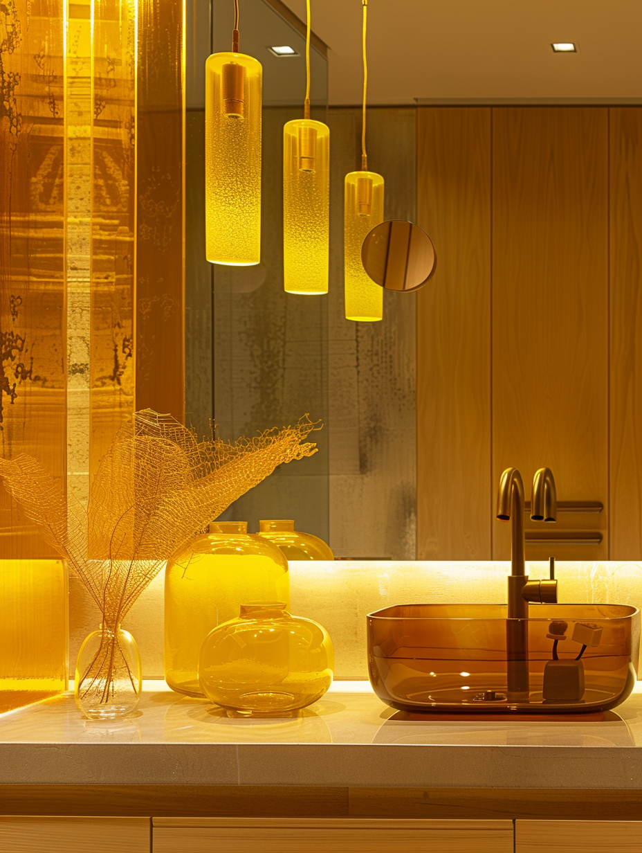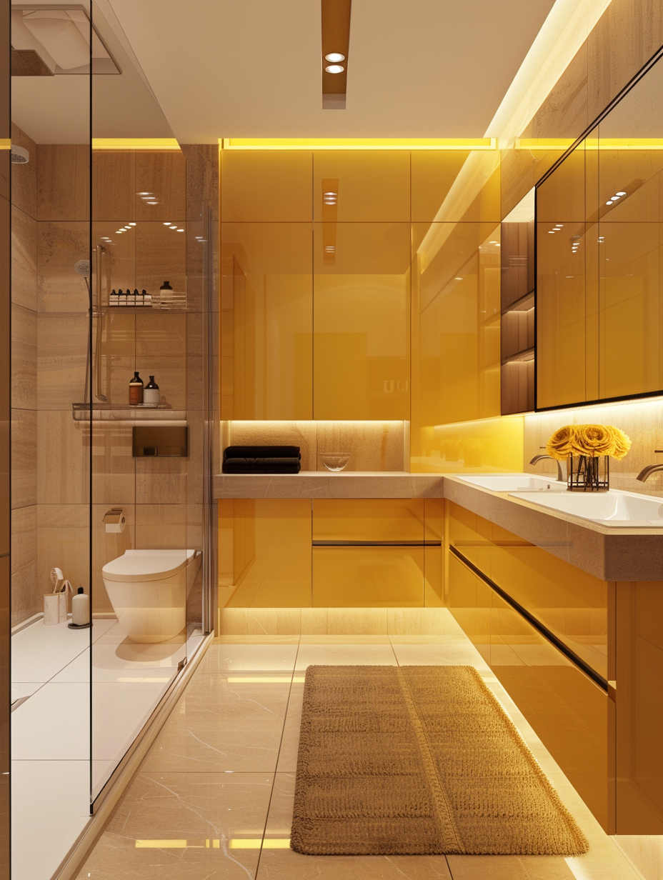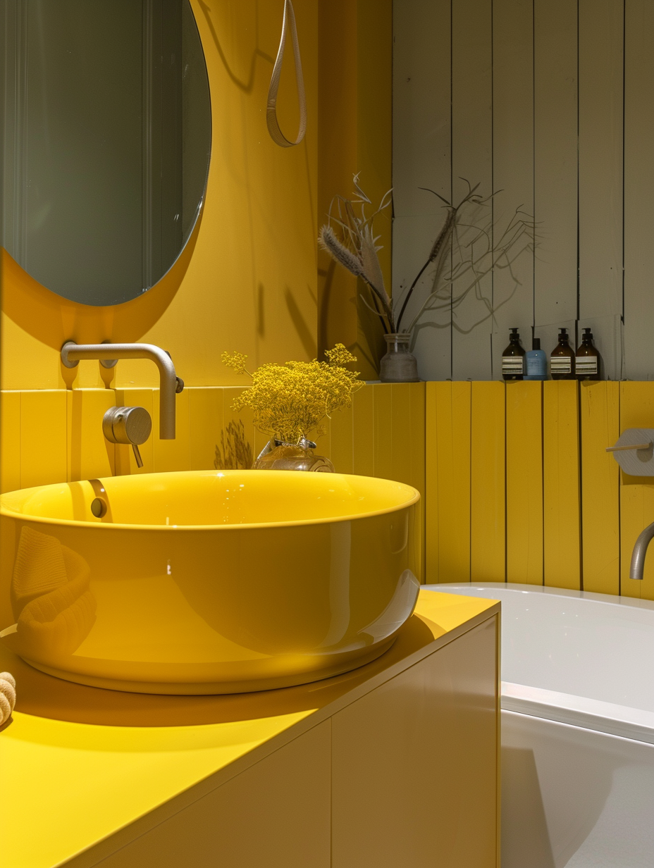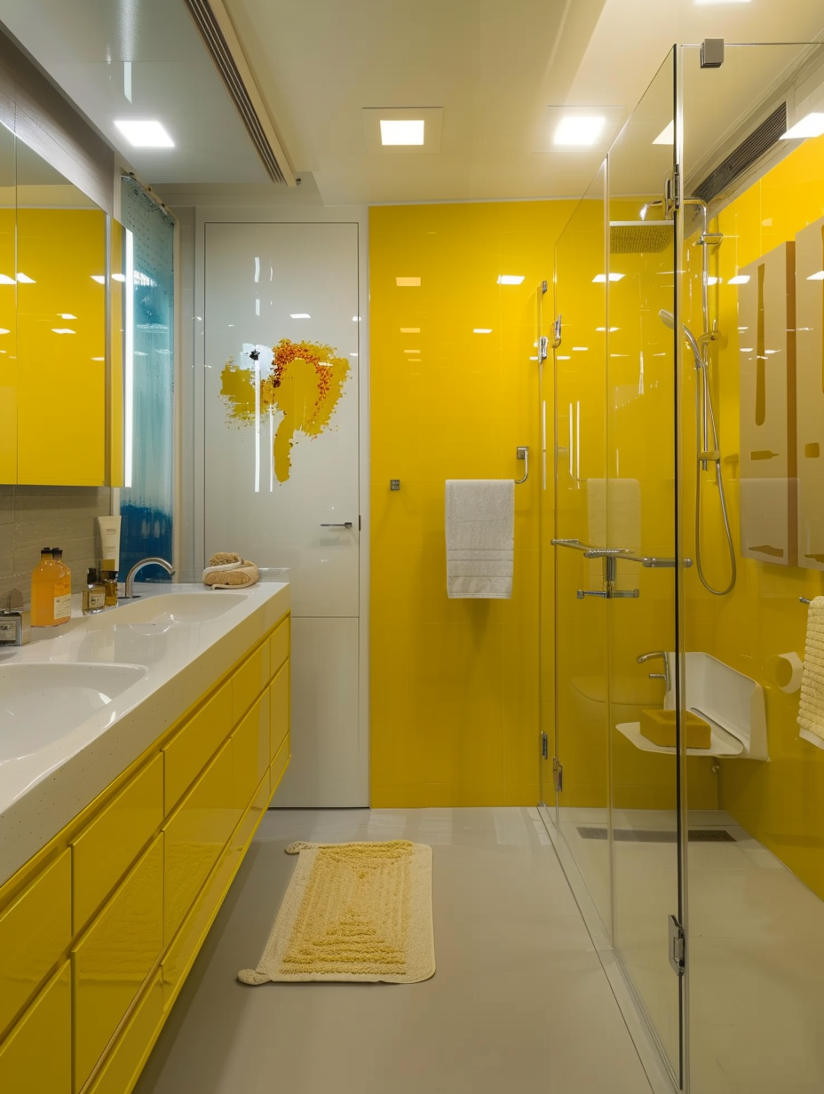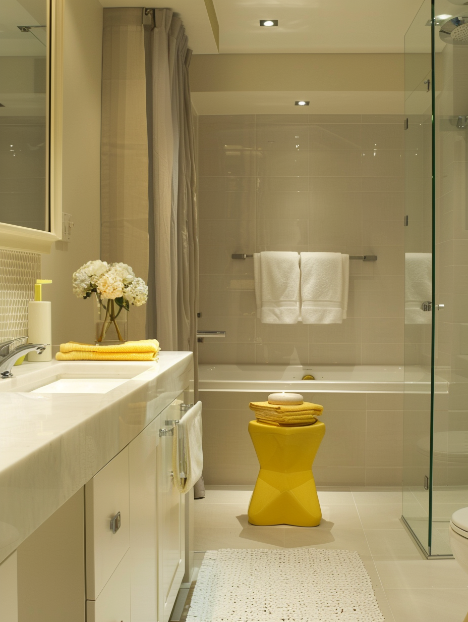 Bathroom with yellow bath products in matching containers, coordinated and lively touch, modern style, bright lighting can create a coordinated and lively touch to your bathroom! Displaying these products in matching yellow containers can not only bring a more uniformed look to the entire area but can also stand out and be the main eye-catcher in the bathroom decor. This small but impactful detail can link other yellow elements throughout your bathroom together.