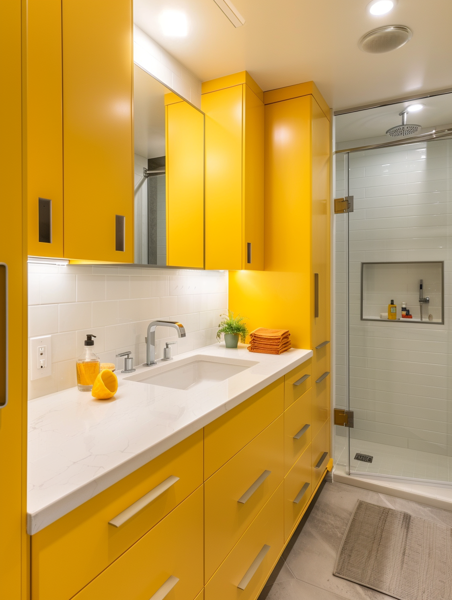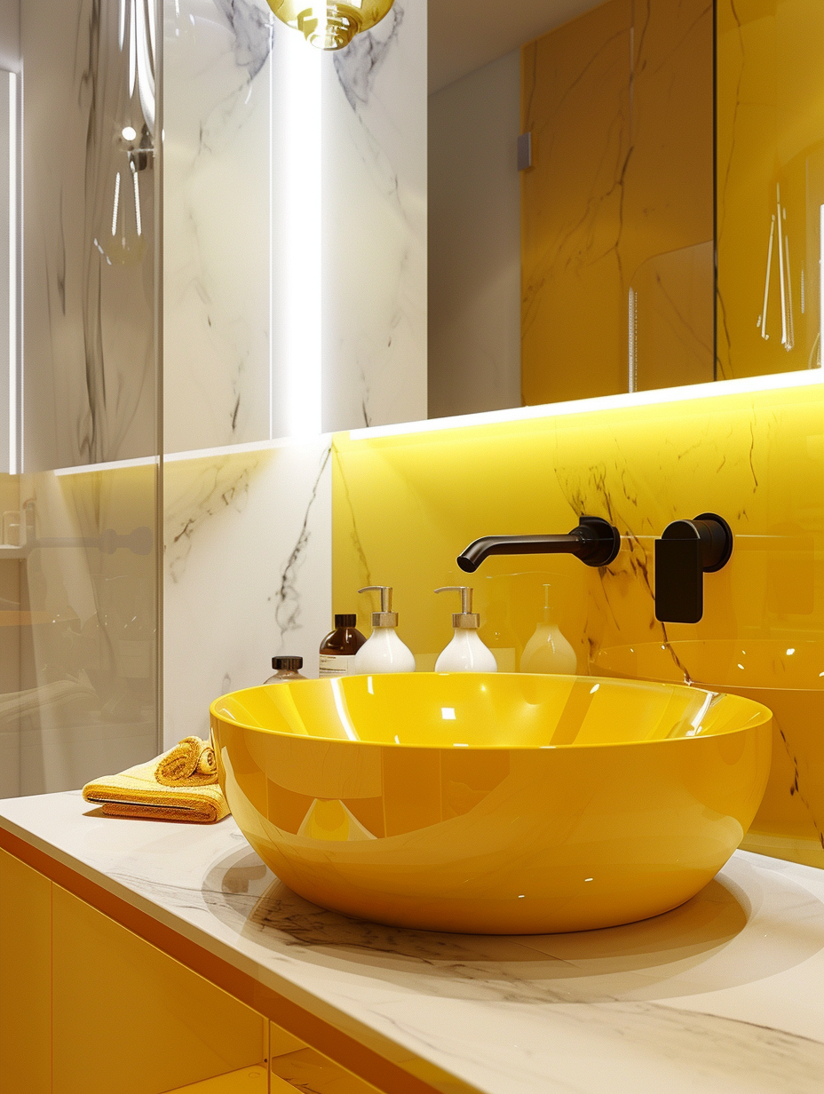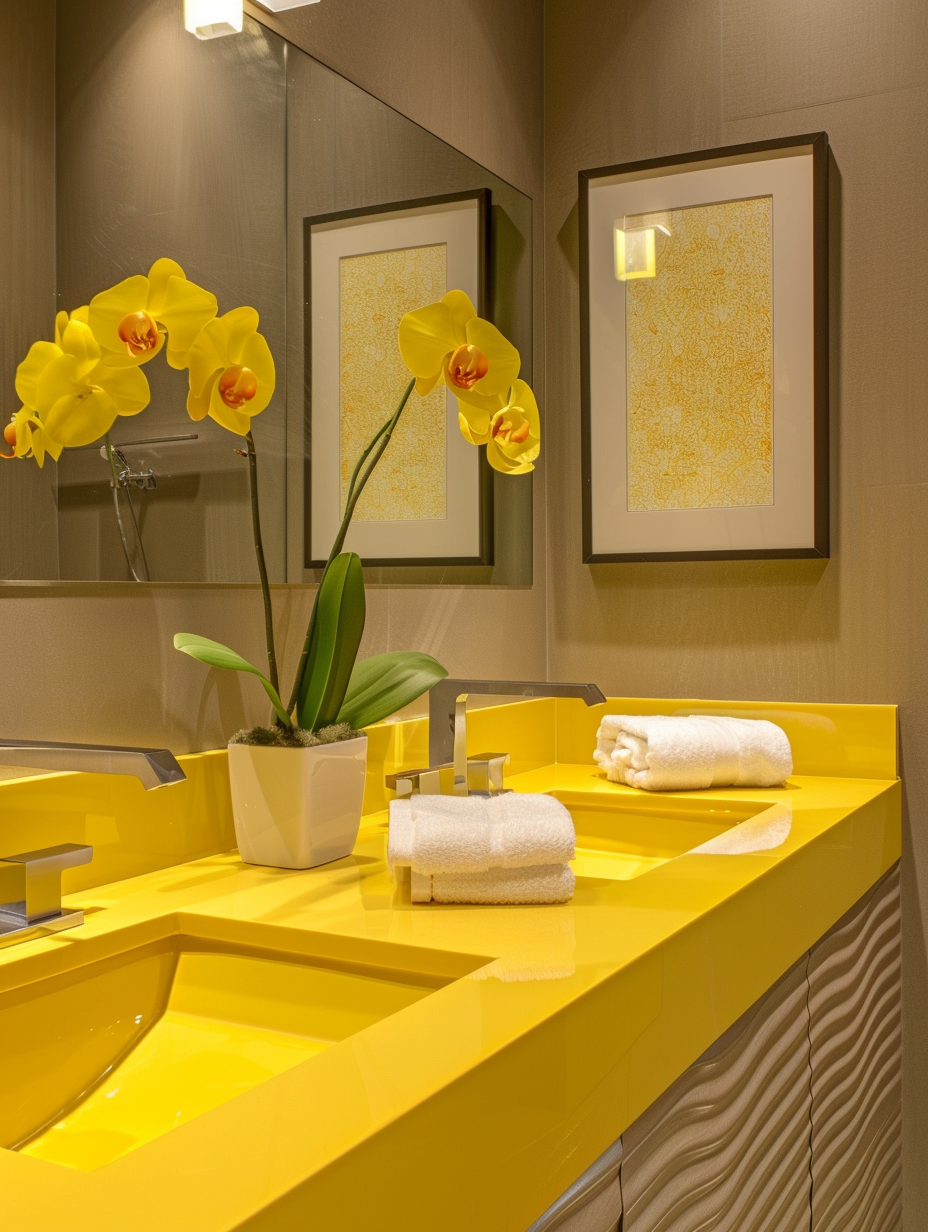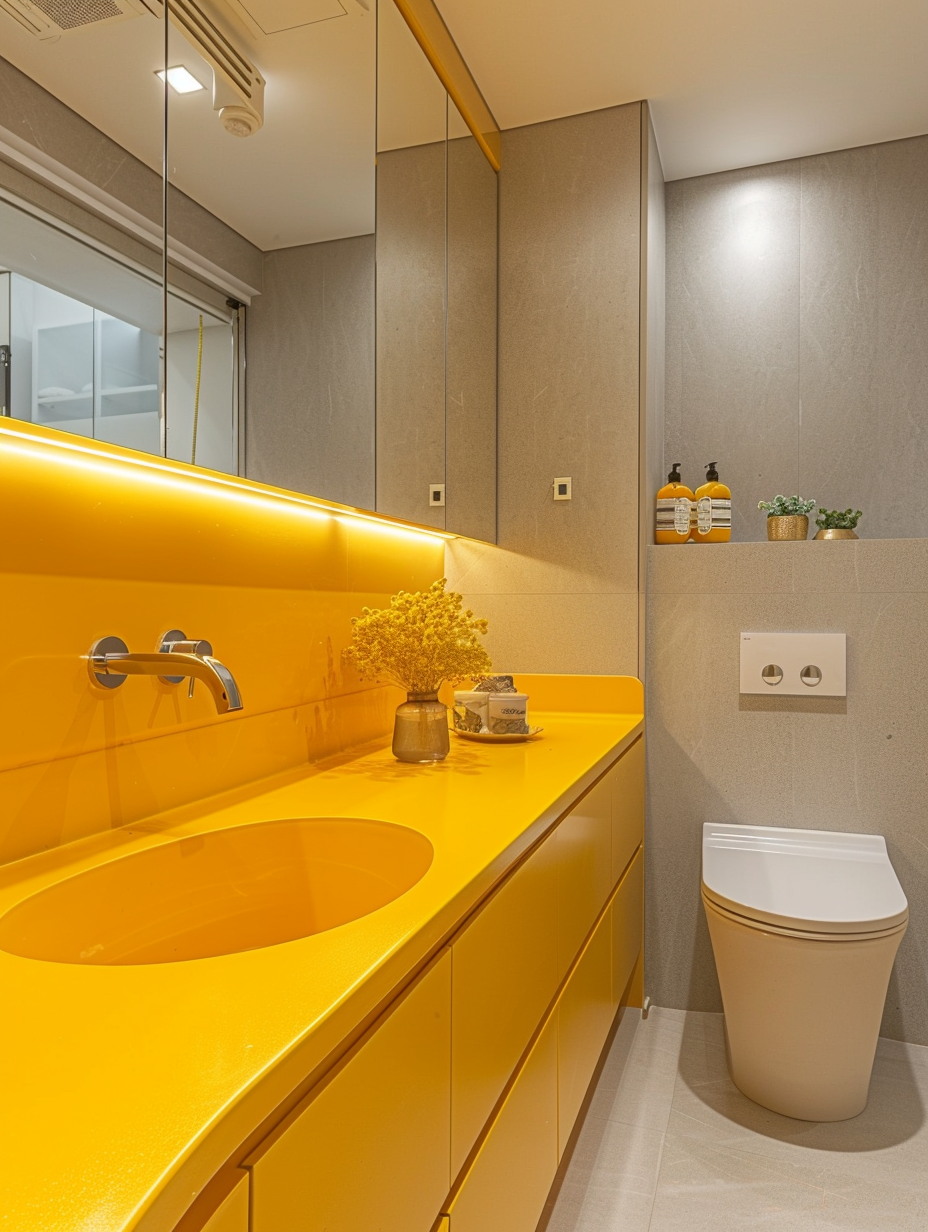 Yellow countertops provide a fashionable and distinctive atmosphere to your bathroom. Do you know that using a shade that matches your existing decor and setting it against soft-colored walls and fixtures instead of such similar ones will make your interior design be eye-catching and well-balanced?