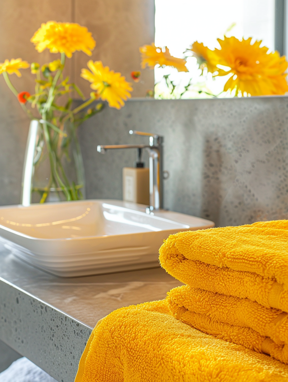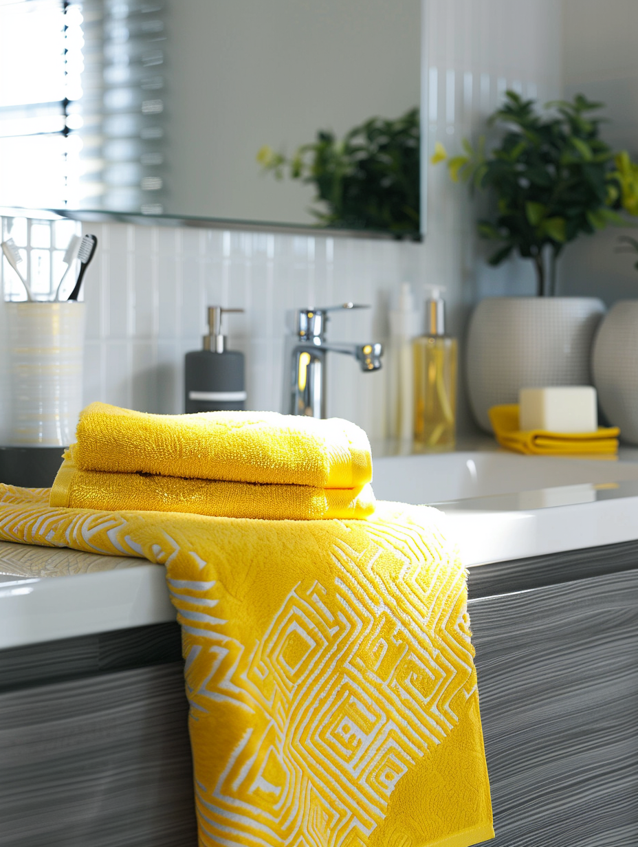 Yellow towels are a clear and efficient method to combine color into your bathroom. They bring a new and bright note to the room and can be changed if you would prefer a different look. Think about combining yellow towels with white and grey fixtures for a harmonious and chic finish.